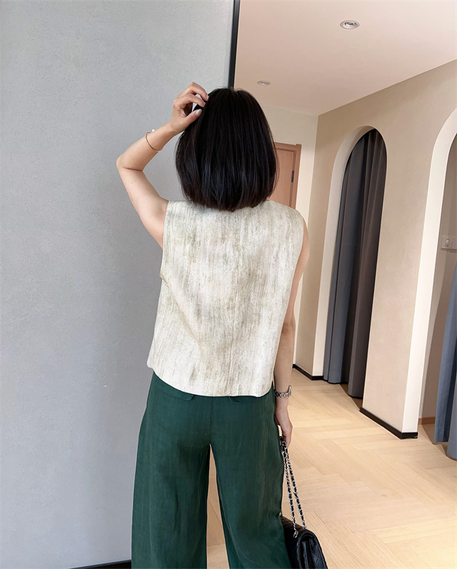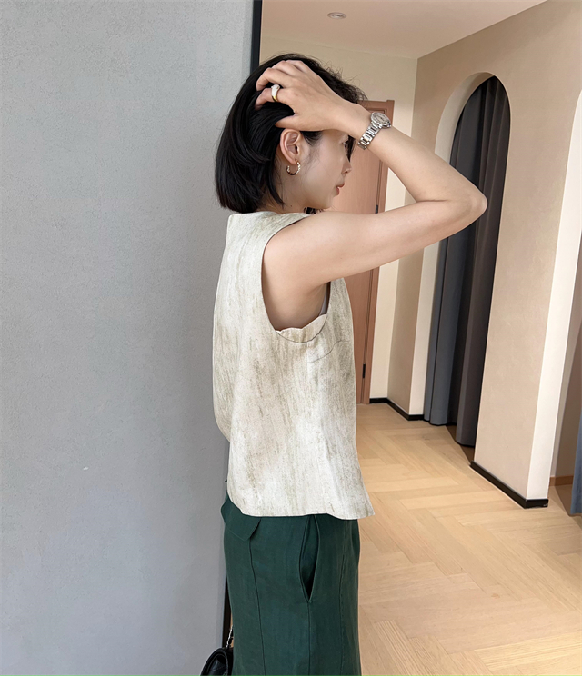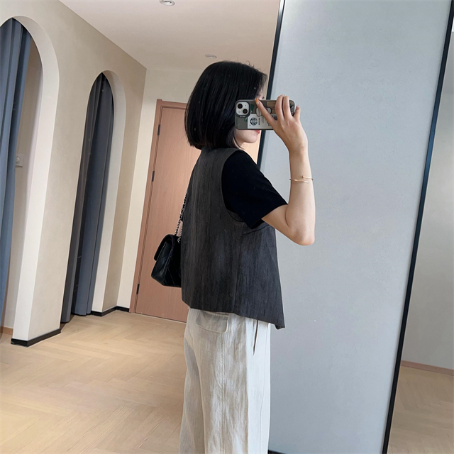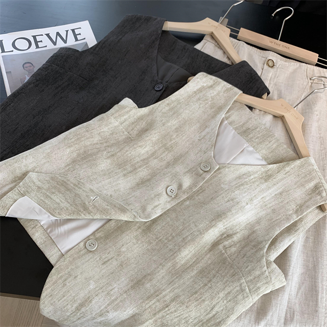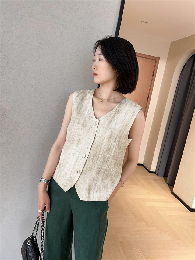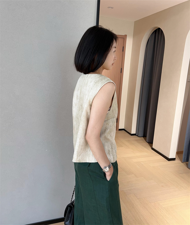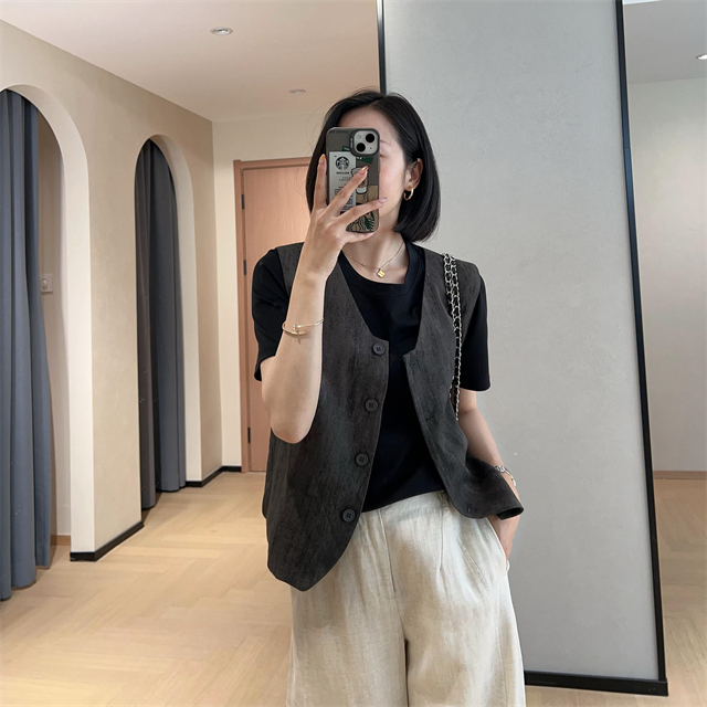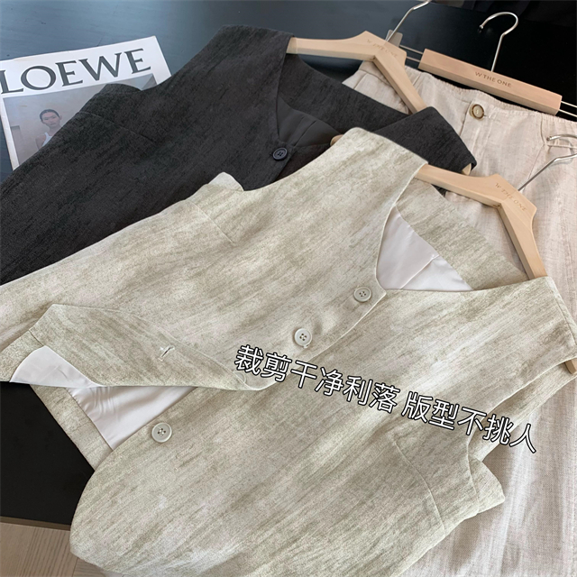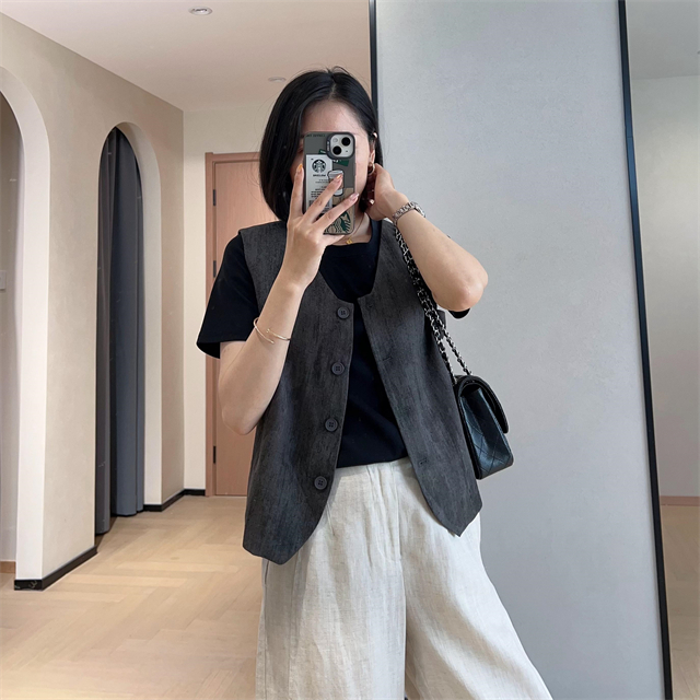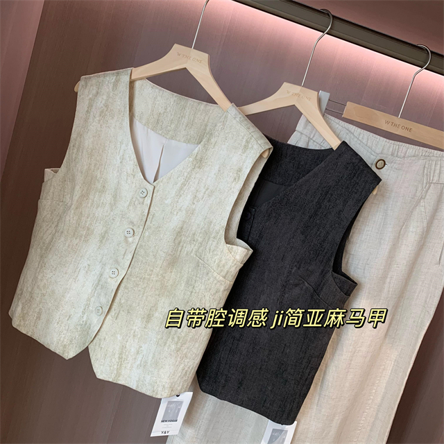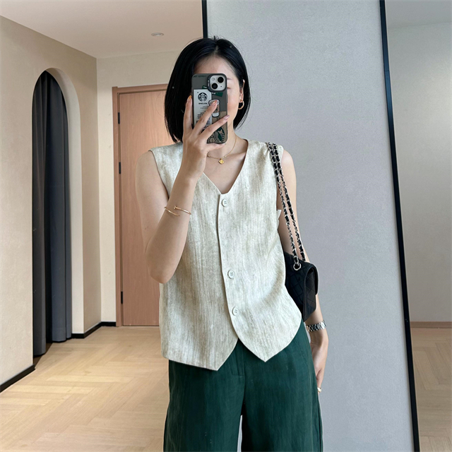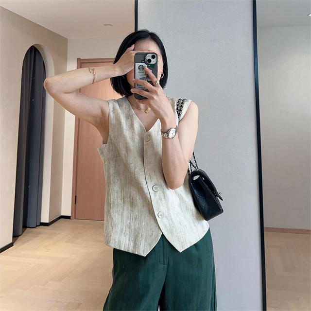 百媚生 高级老钱风马甲显瘦气质百搭短款V领亚麻背心CBW8194