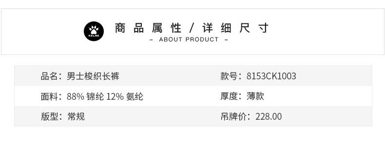 卡尔美男士春季新款薄款运动裤