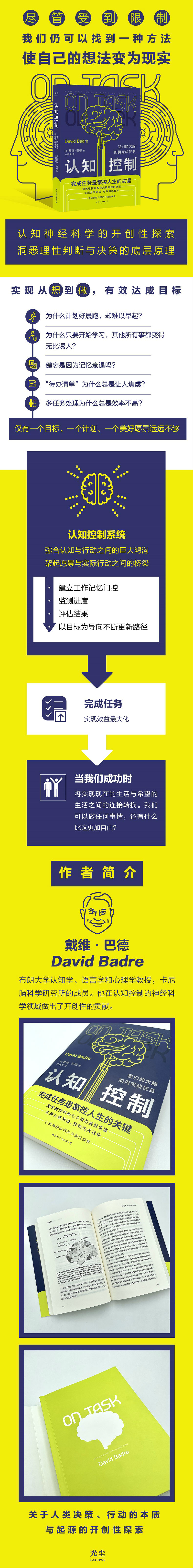 从煮一杯咖啡到买一栋房子到改变周围的世界,人类有独特的能力去执行必要的行动,而我们的大脑是如何把事情做好的?为什么短信和开车很难同时进行?你怎么能拒绝多吃一块蛋糕呢?为什么盯着一张税单感觉精神疲惫?为什么你的孩子可以熟练地修理电脑,却仍然忘记穿外套? 《认知控制》提出了认知控制神经科学的非常不错介绍——大脑设计复杂动作以实现目标的非凡方式,以及如何塑造我们的日常生活。 《认知控制》借助很好研究、生动的临床案例研究和日常生活中的例子,揭示了数十亿个神经元如何将抽象的想法集体转化为具体的计划,对大脑在人类行为中的关键作用进行了研究。