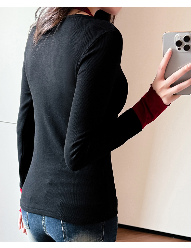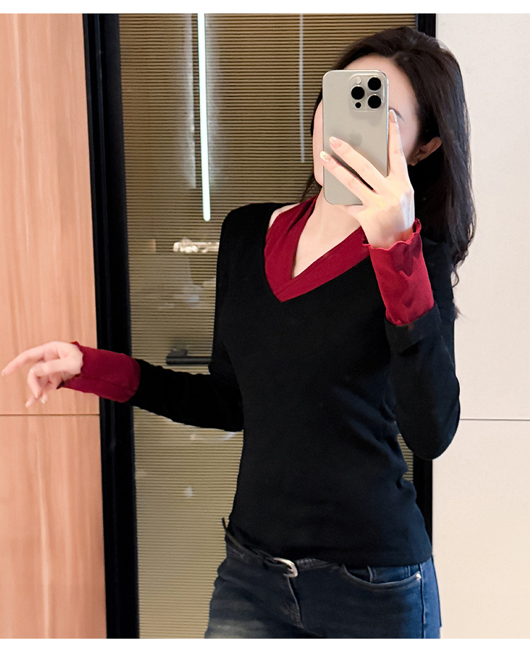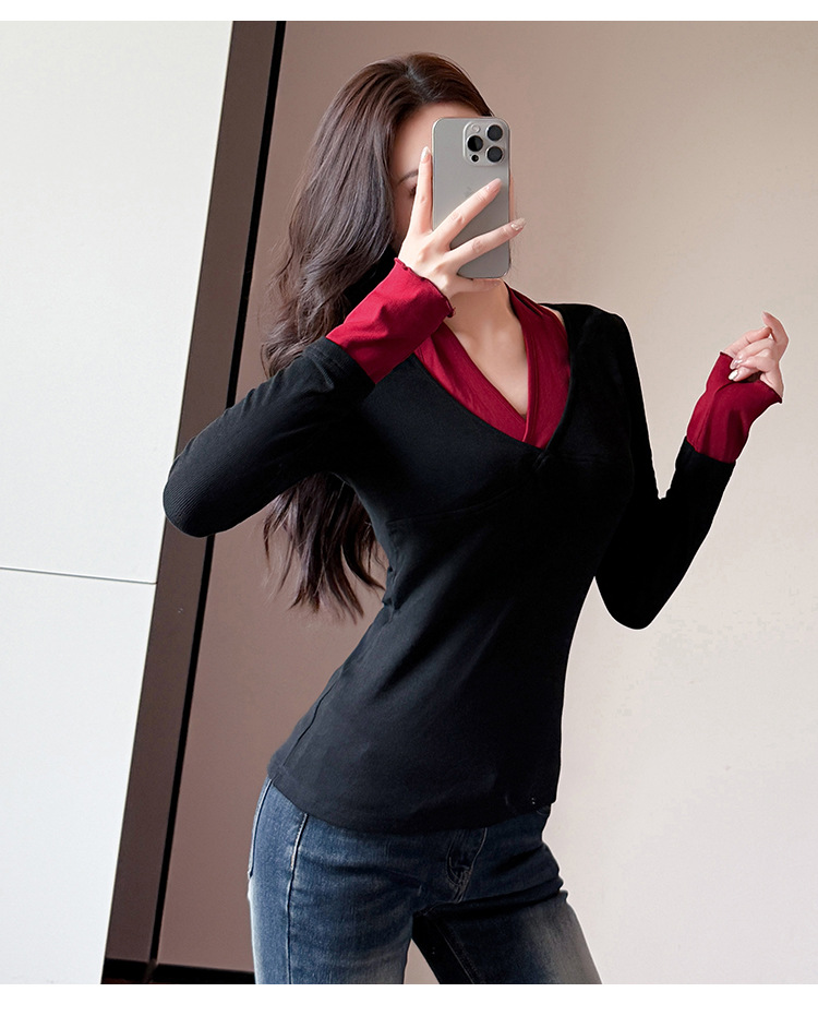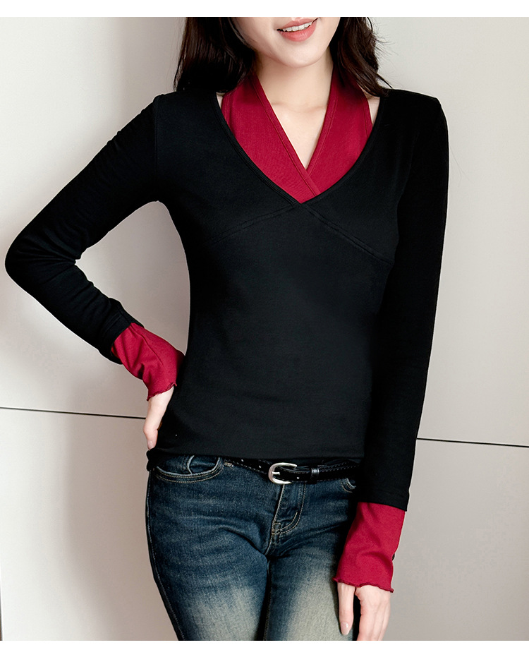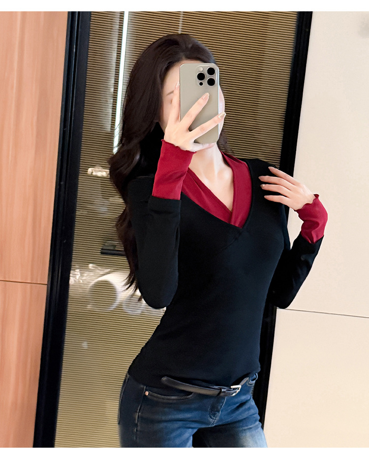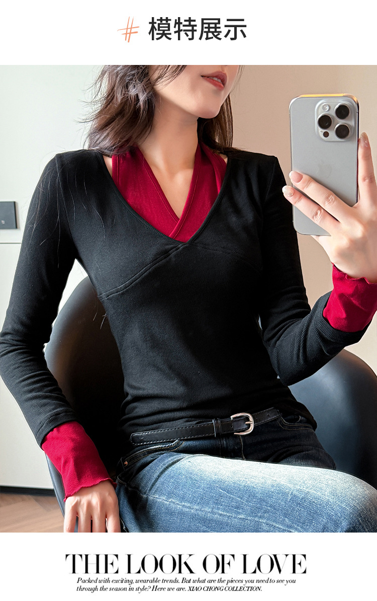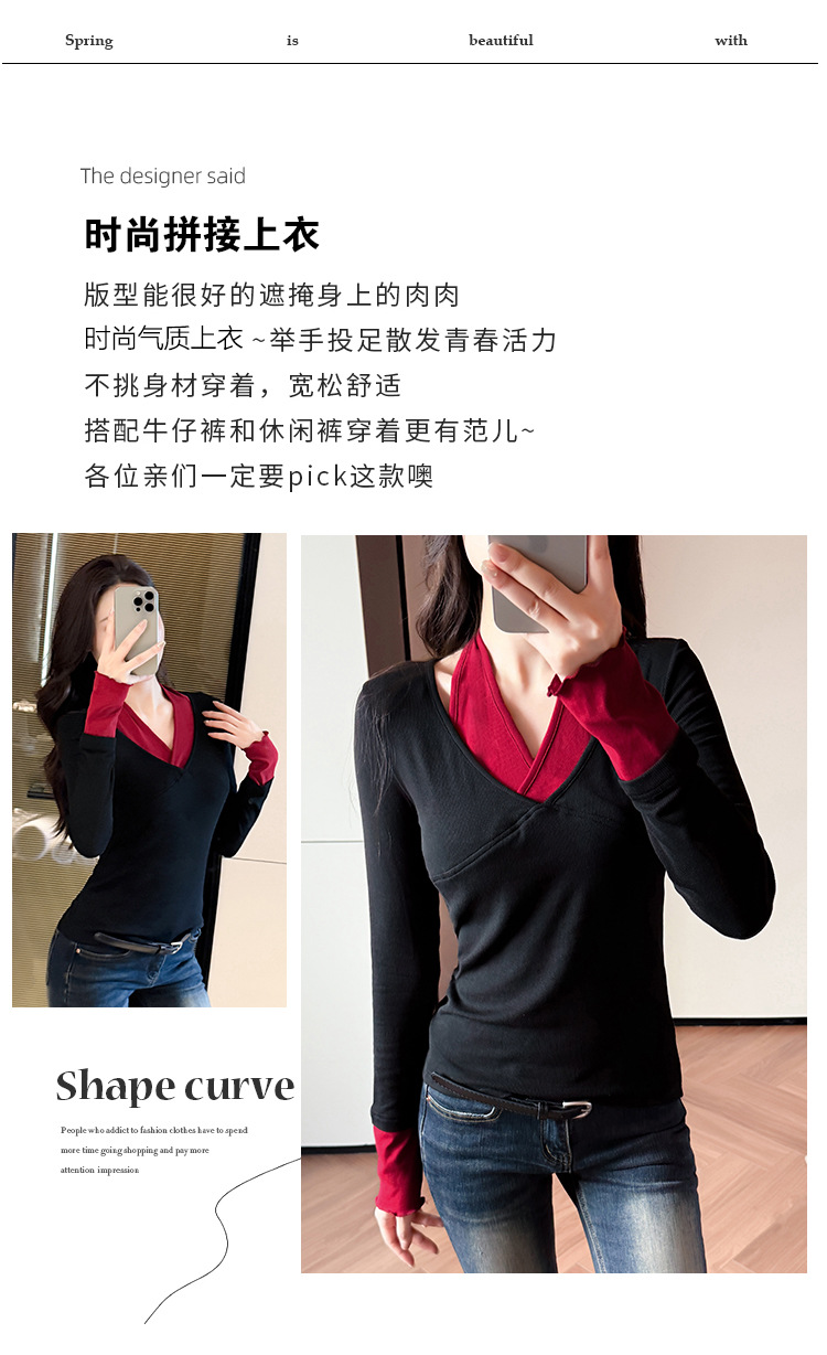 KQL 359H8360加厚磨毛拼接长袖V领气质上衣洋气t恤