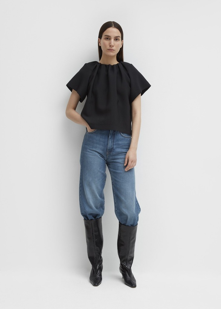 领口的褶皱设计为衣身增添了线条感。面料经过特殊的工艺处理,表面具有暗浮雕一般细致的纹理,并呈现变化的光泽。