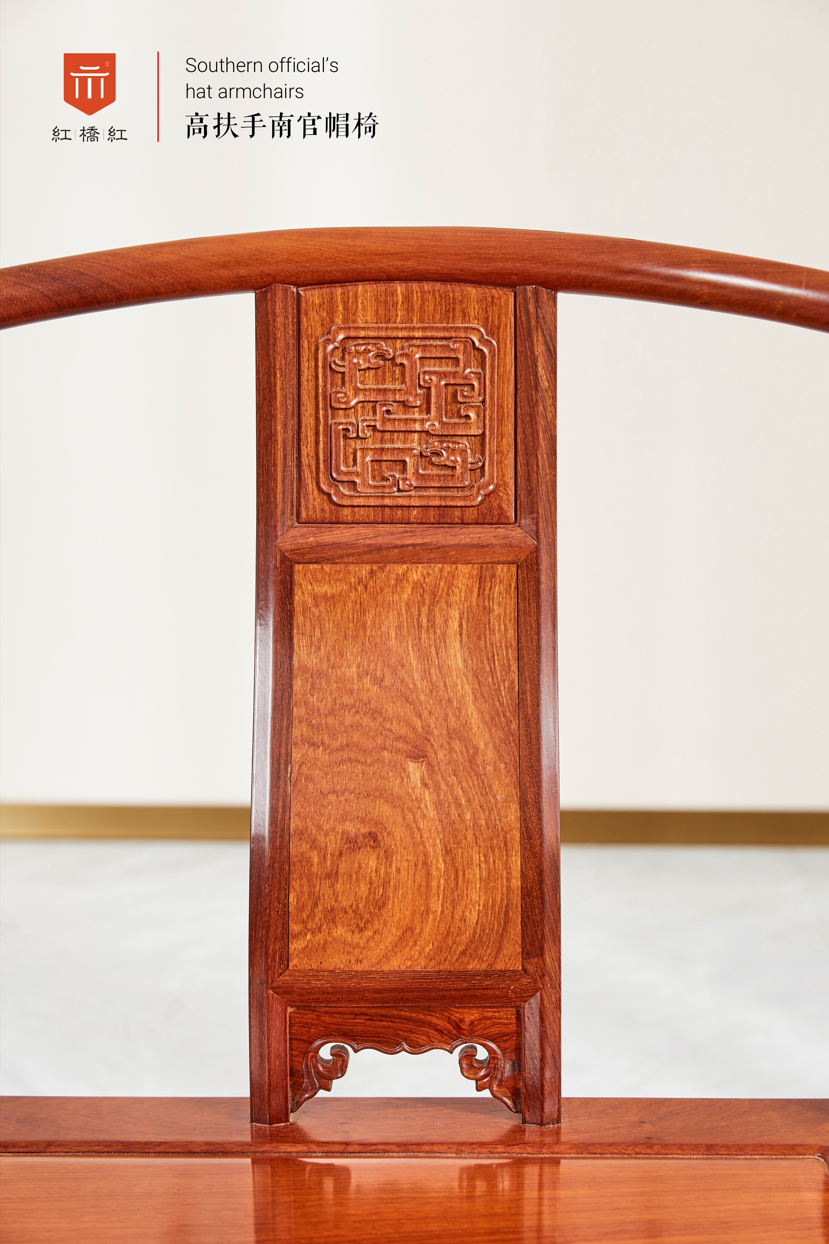 此椅,靠背板三段攒成,上端镶龙纹玉片,复刻改为落堂刻纹饰,仍具明腰带韵味;中段平嵌素板;下段落堂亮脚锼刻卷草纹。扶手三弯曲线,后部较高,几乎接近搭脑,形成类似圈椅的构法,也有称其为“坡扶手”,倒也十分形象。鹅脖退后,另木安装,不与前足连做,略去联帮棍,故对扶手与后足、鹅脖,鹅脖与椅盘的三处连接做法提出了更高的要求,以达到合理的强度。