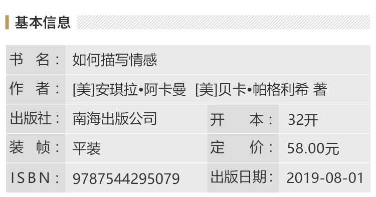 《如何描写情感》以辞典的编排方式,罗列了75种情感(感激、希望、自信、羡慕等)的具体表现形式 。