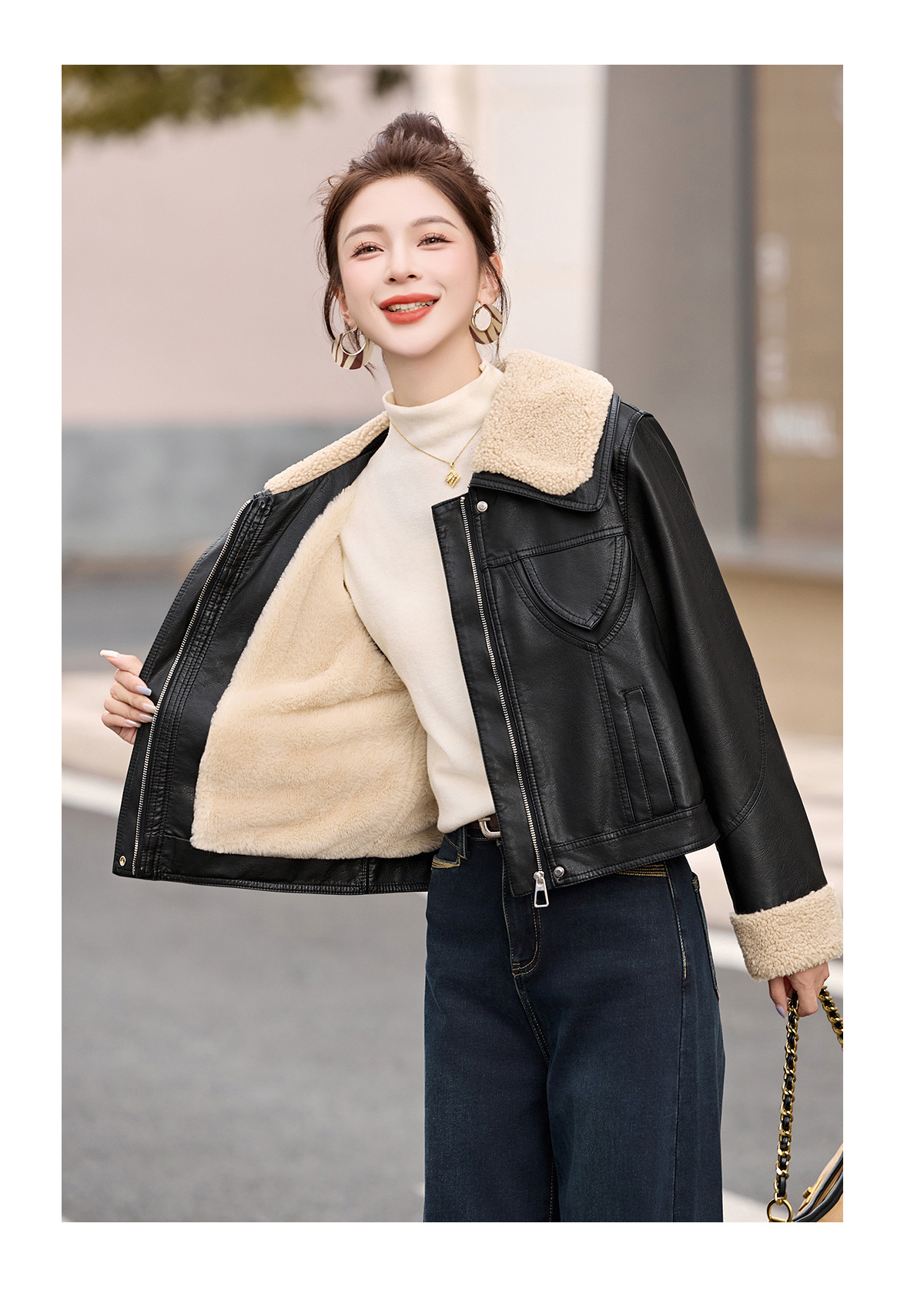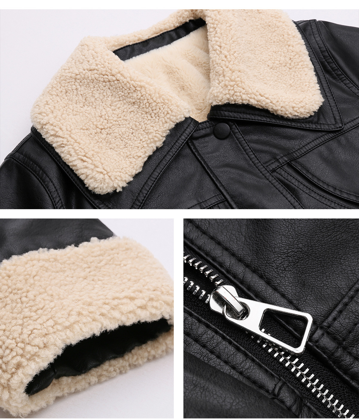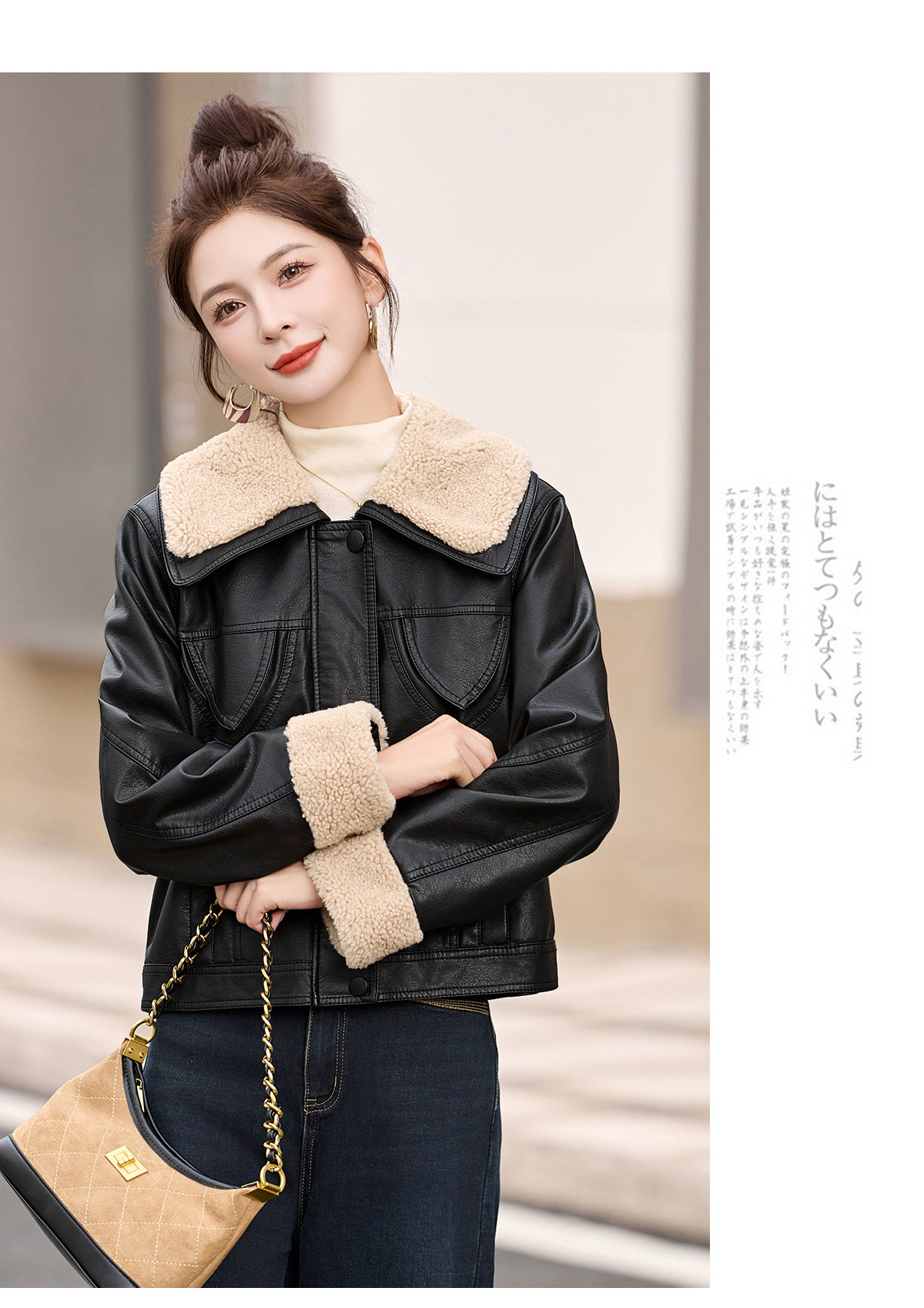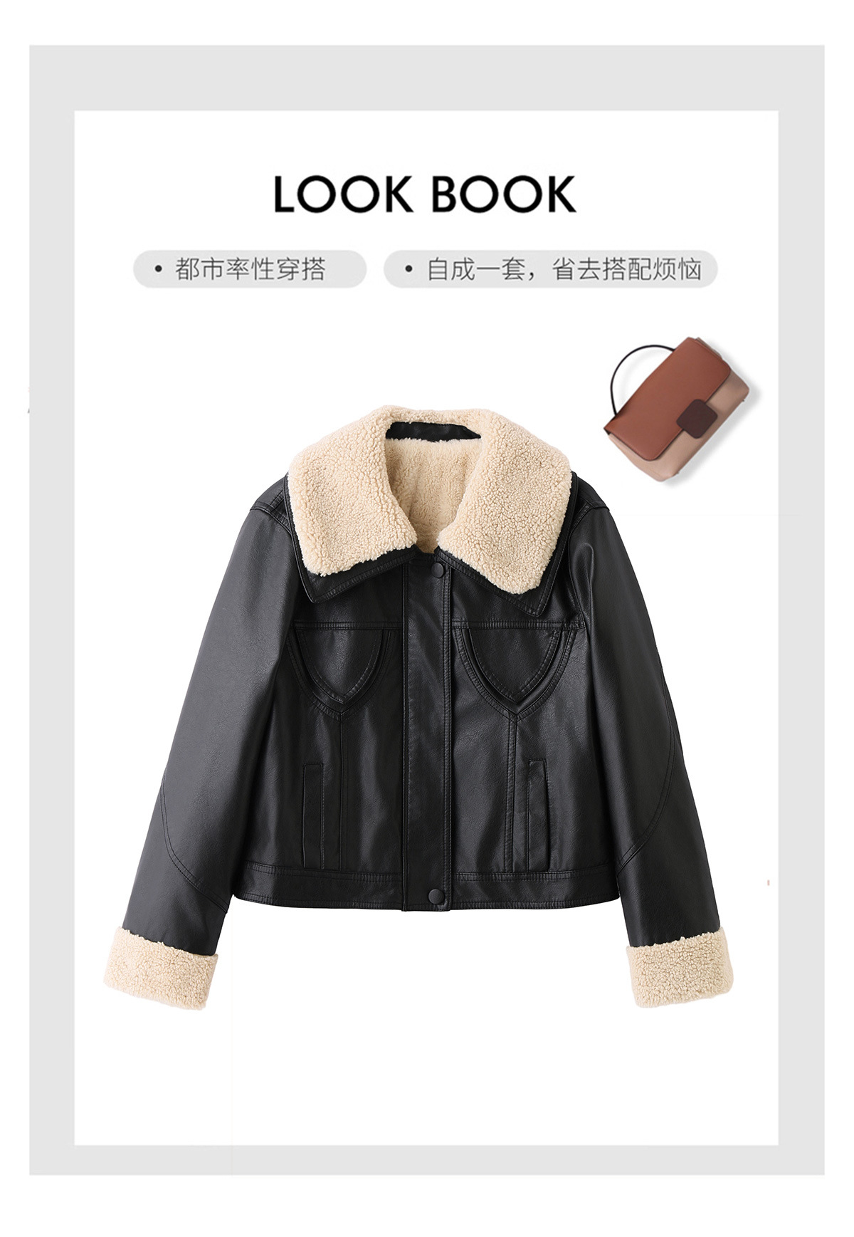 羊羔毛拼接加绒黑色皮衣,加厚保暖小个子皮夹克外套HR-9802