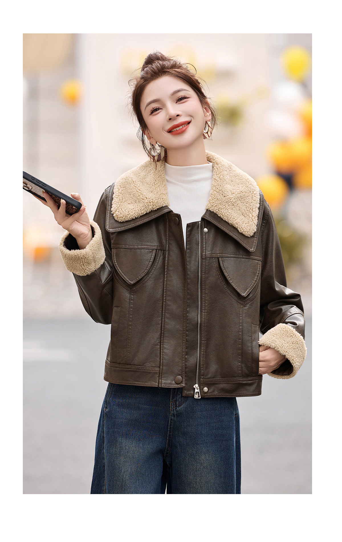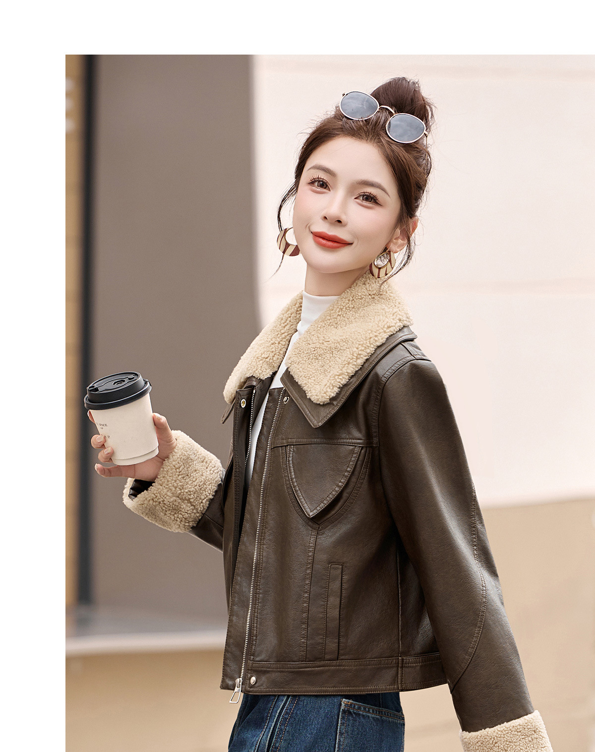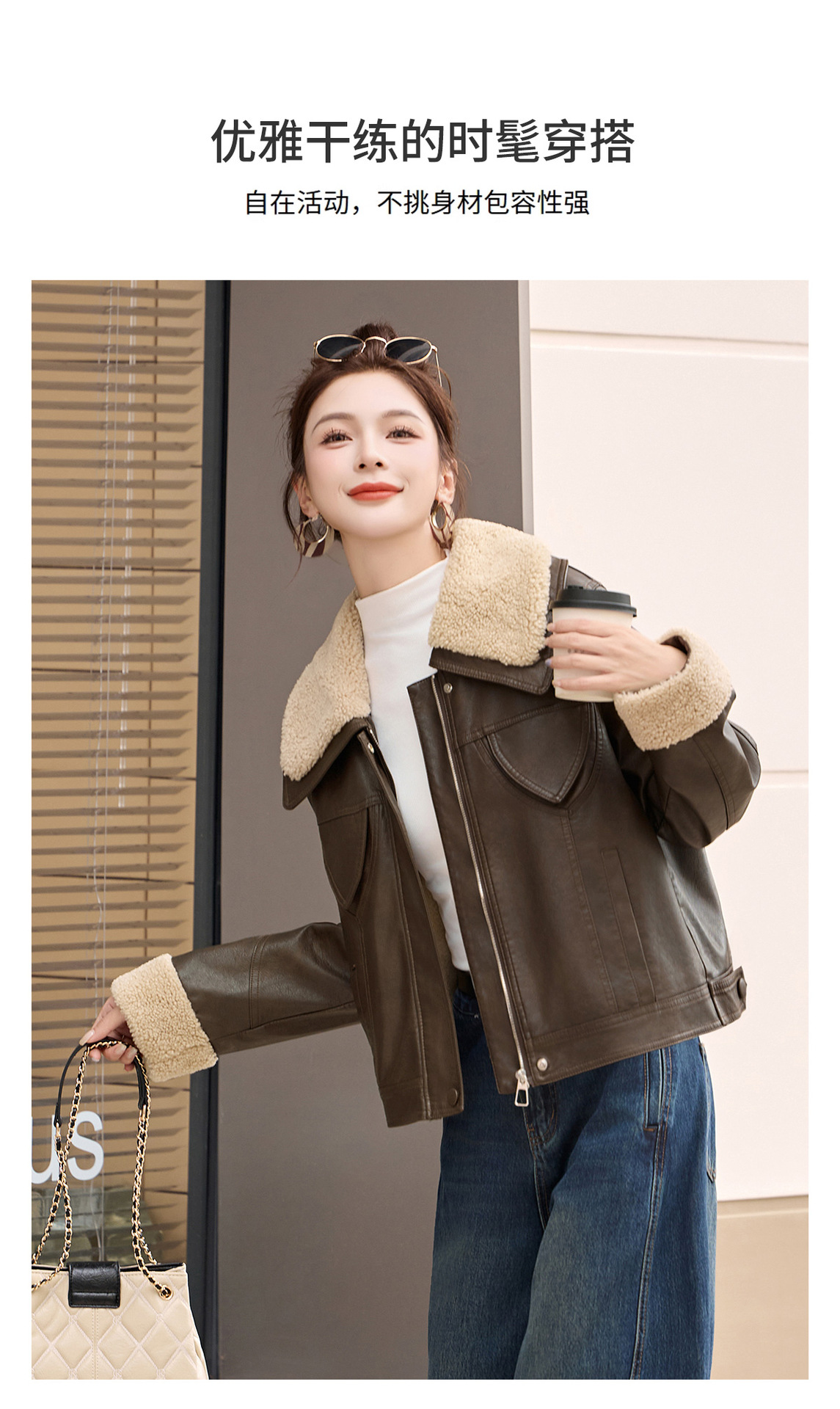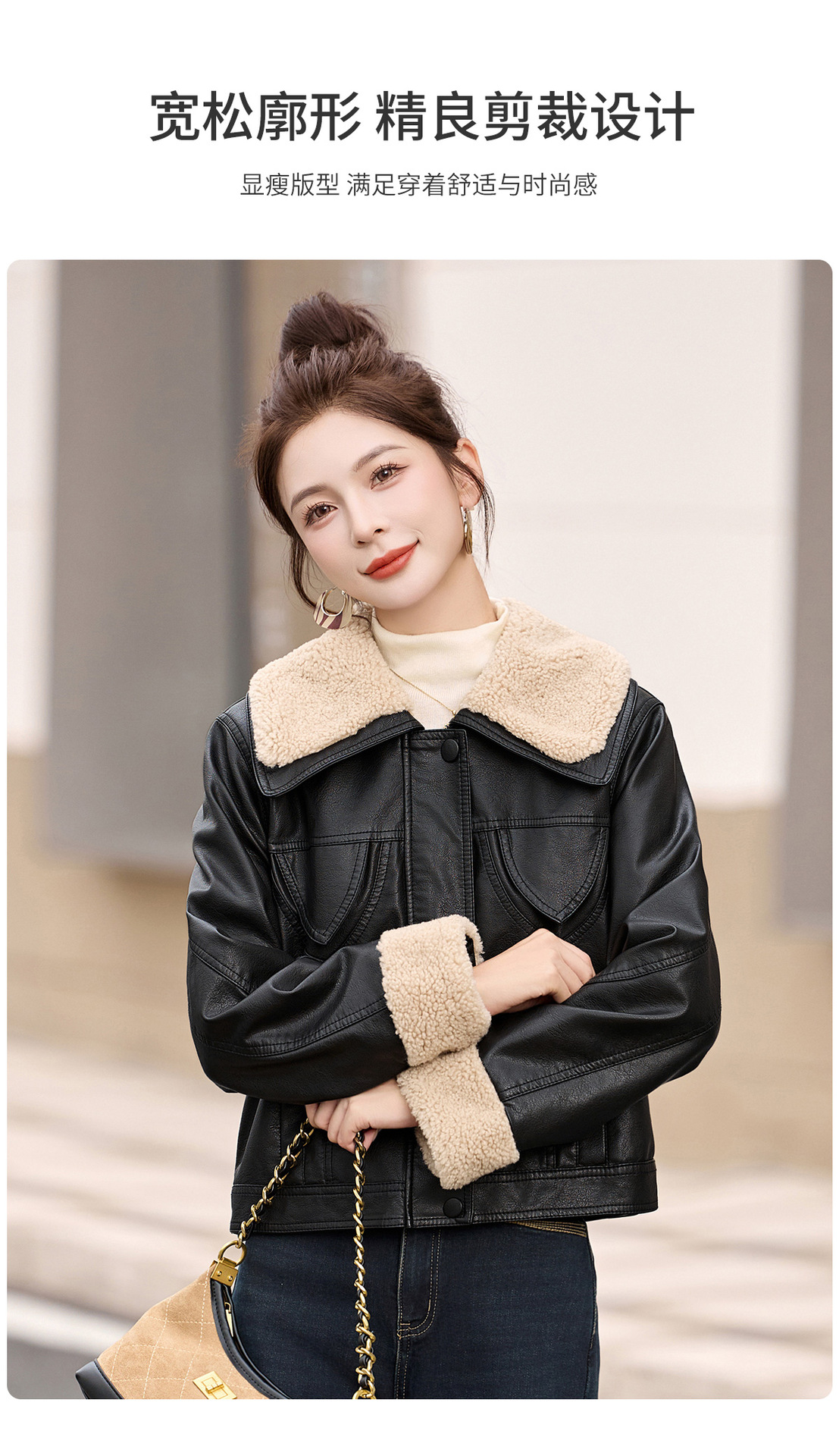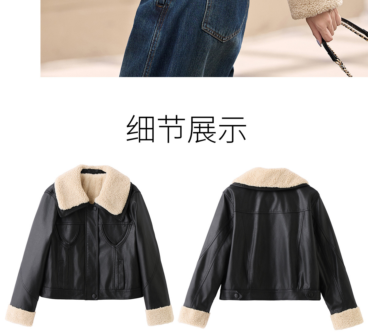 羊羔毛拼接加绒黑色皮衣,加厚保暖小个子皮夹克外套HR-9802