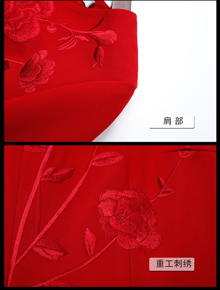 HX-A3初秋新款V领刺绣前开叉七分袖连衣裙