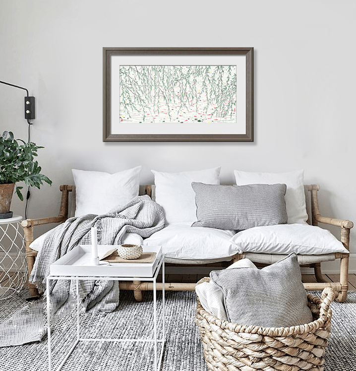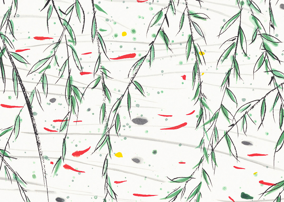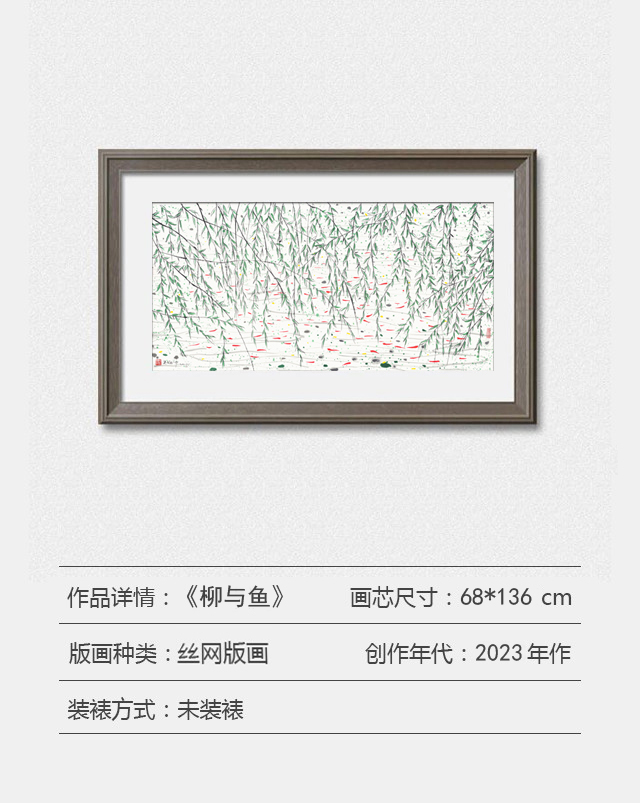 郁郁葱葱的柳树铅华洗尽,片片绿叶映衬着点点红鱼,显得温馨静谧,像一股无声的生命之泉在画面中汩汩流出,永不枯泽