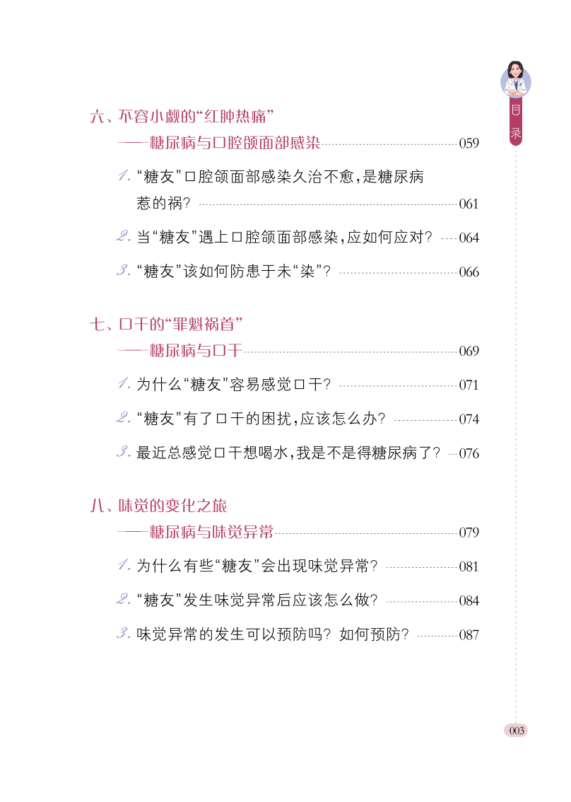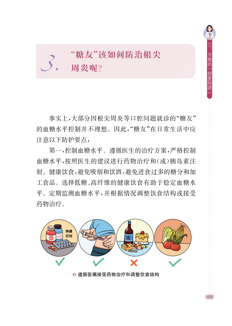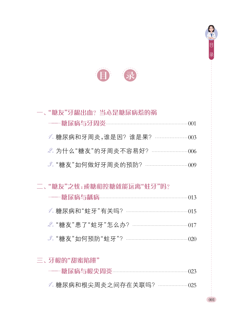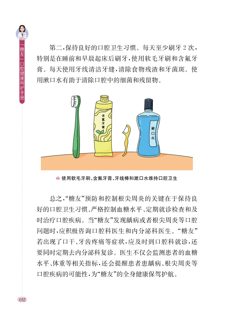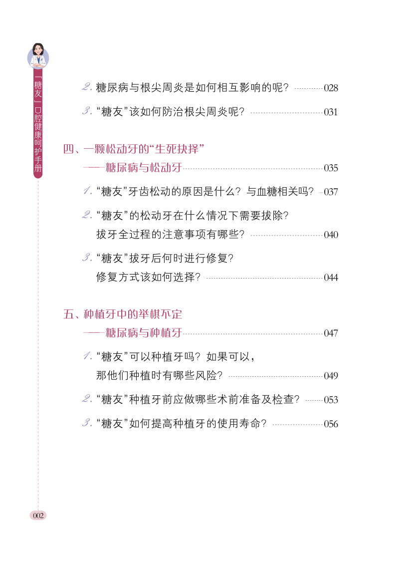 本书是一本专为糖尿病患者编写的口腔健康科普图书,涵盖牙周炎、龋病、种植、修复、黏膜疾病等12个章节,全面解析糖尿病与口腔健康的密切关系。通过通俗易懂的文字和生动形象的漫画,详细介绍了糖尿病患者常见口腔问题的成因、预防措施及治疗方法,帮助读者更好地管理口腔健康。本书不仅适合糖尿病患者及其家属阅读,也可作为口腔健康爱好者、医护人员以及健康教育工作者进行健康教育的参考工具,旨在提高公众对糖尿病与口腔健康关联的认知,促进疾病的早期预防和科学管理。