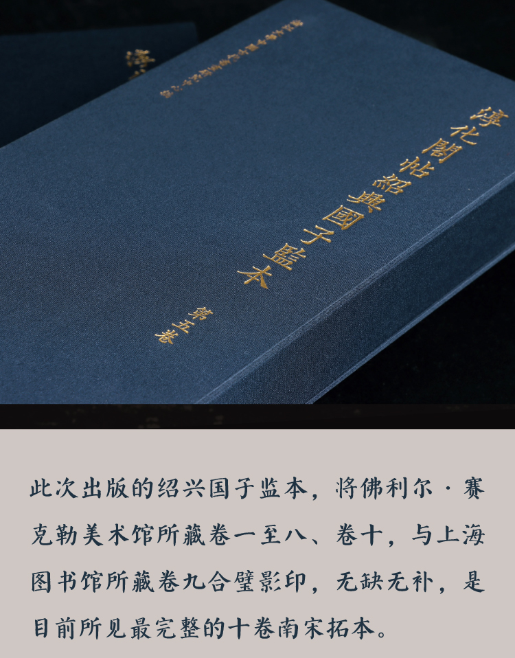 此次出版的绍兴国子监本,将佛利尔·赛克勒美术馆所藏卷一至八、卷十,与上海图书馆所藏卷九合璧影印,无缺无补,是目前所见zui完整的十卷南宋拓本。