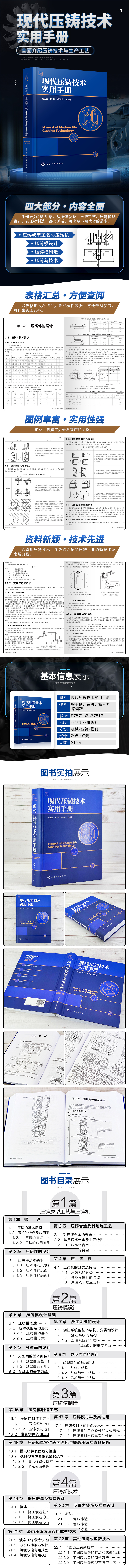 1、根据压铸技术的实际情况,分4篇22章,详细介绍了压铸技术、压铸设备、压铸模设计、压铸模制造等相关知识。