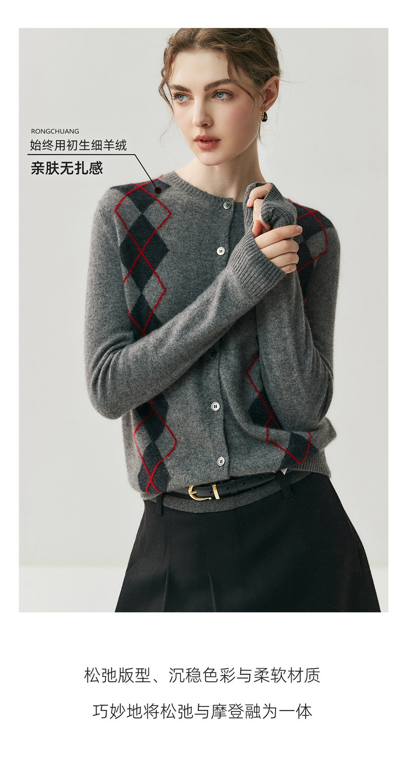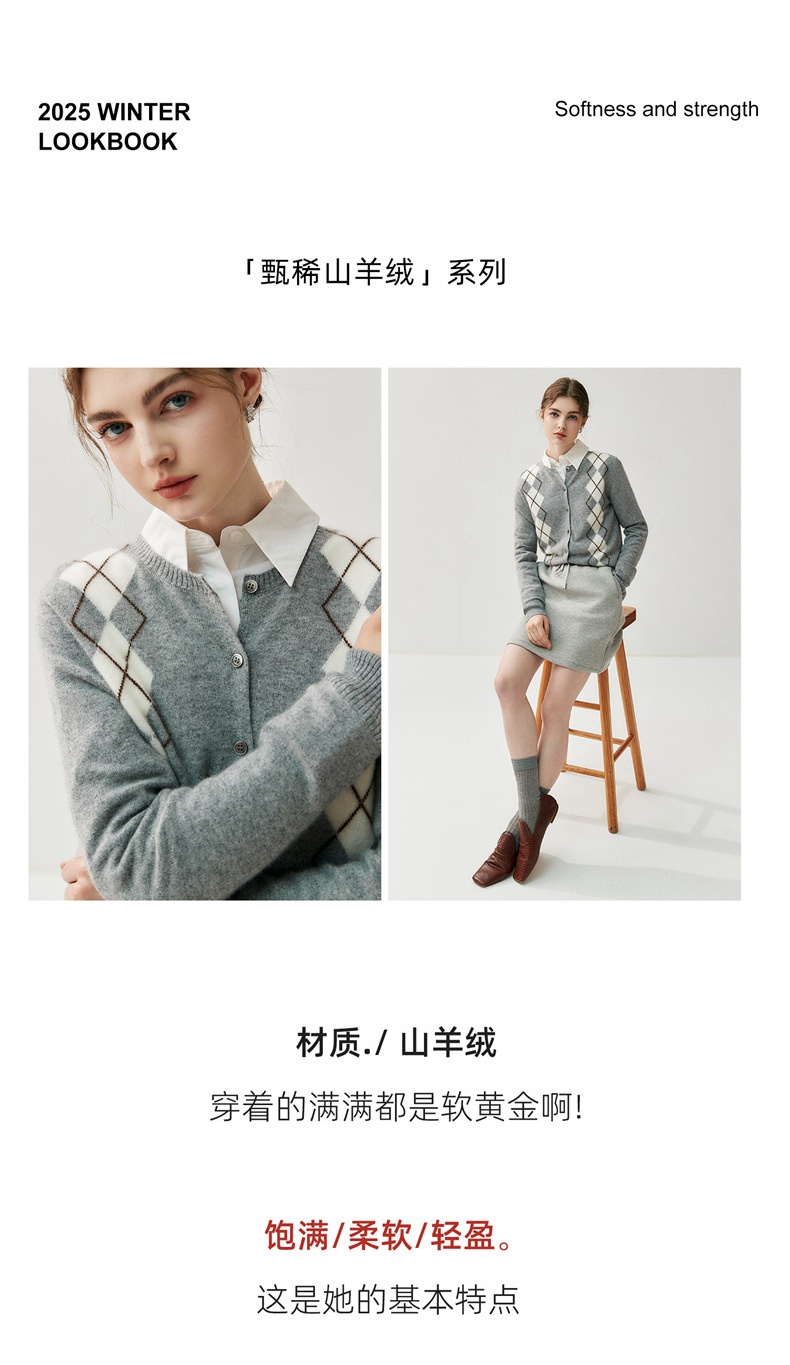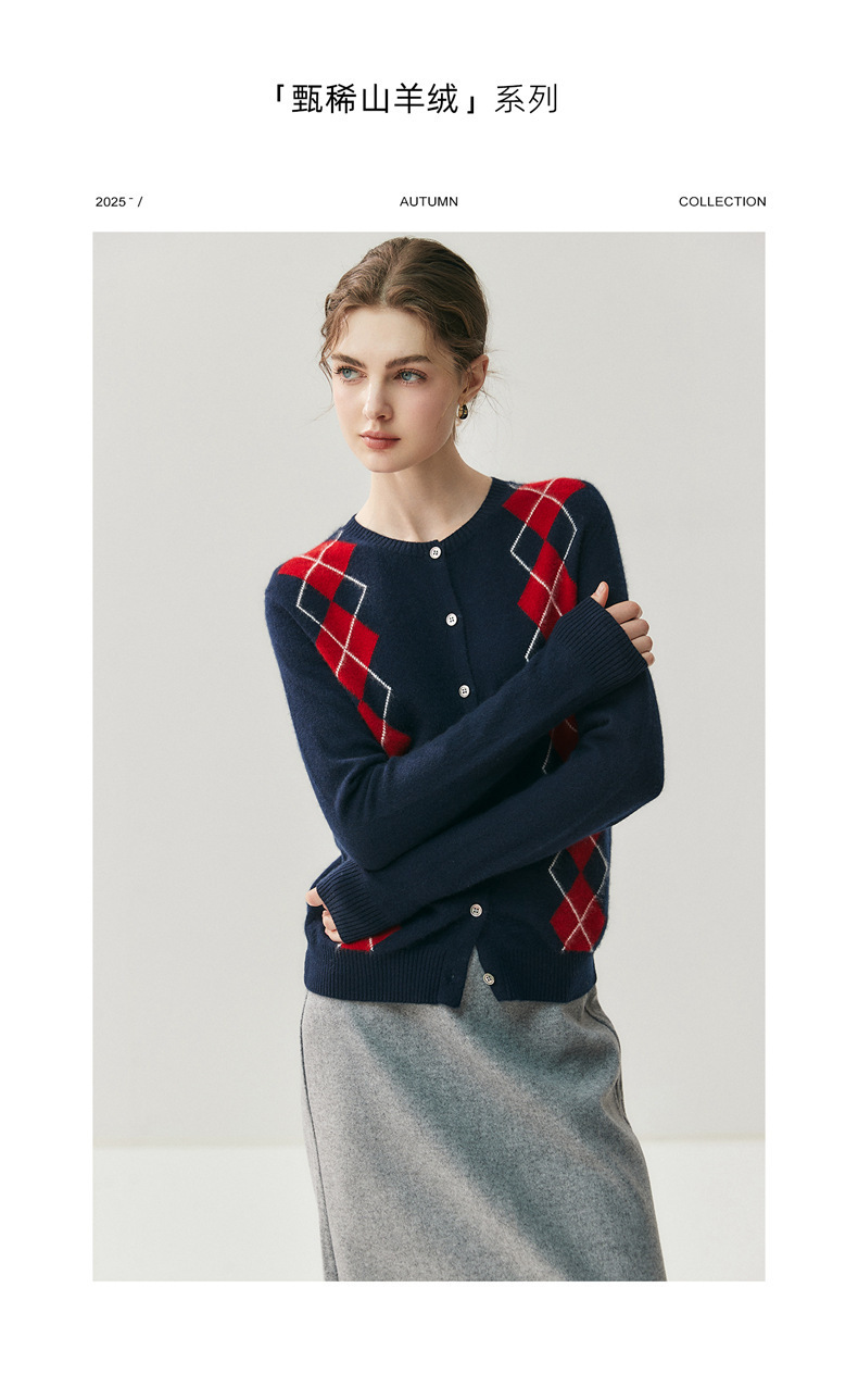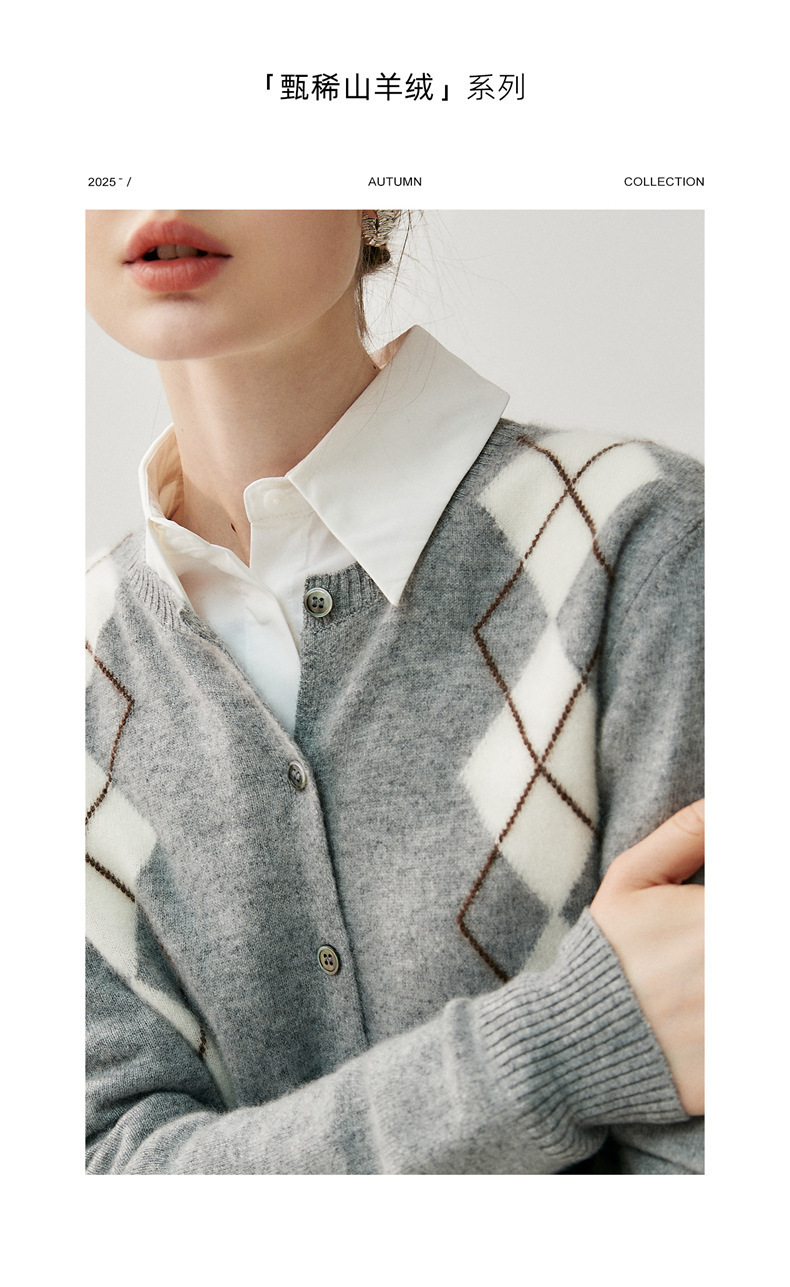 「高货qj」全新升级【铂金会员404/天猫549/差价145】(05832)洛诗琳新款菱格羊绒开衫2025秋冬圆领气质提花长袖毛衣女