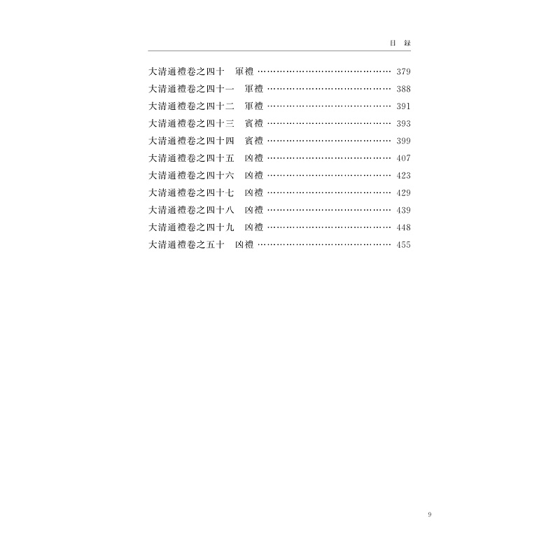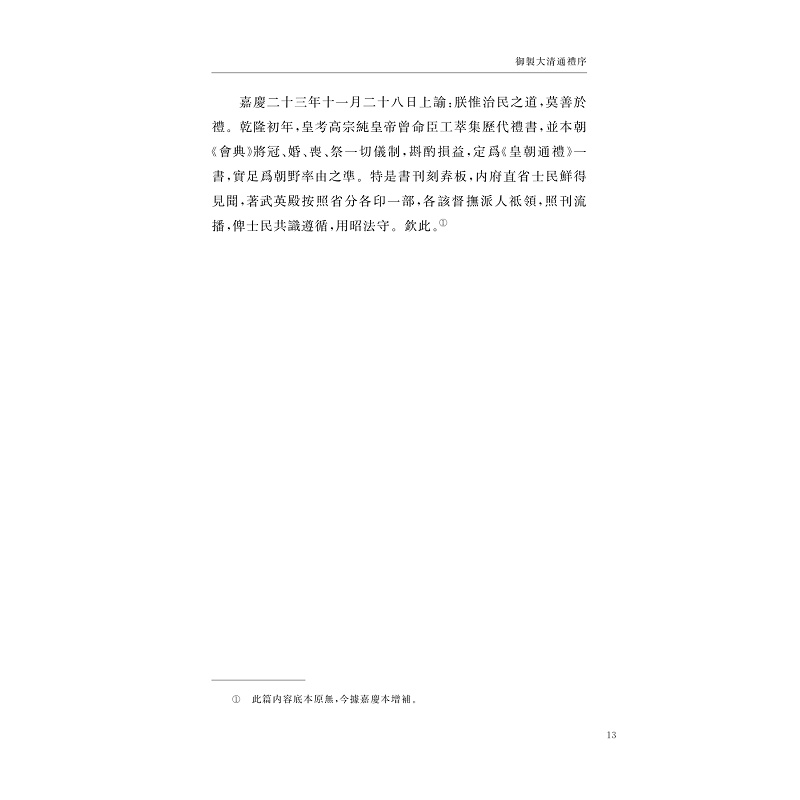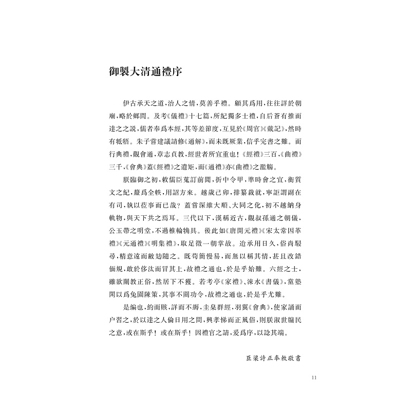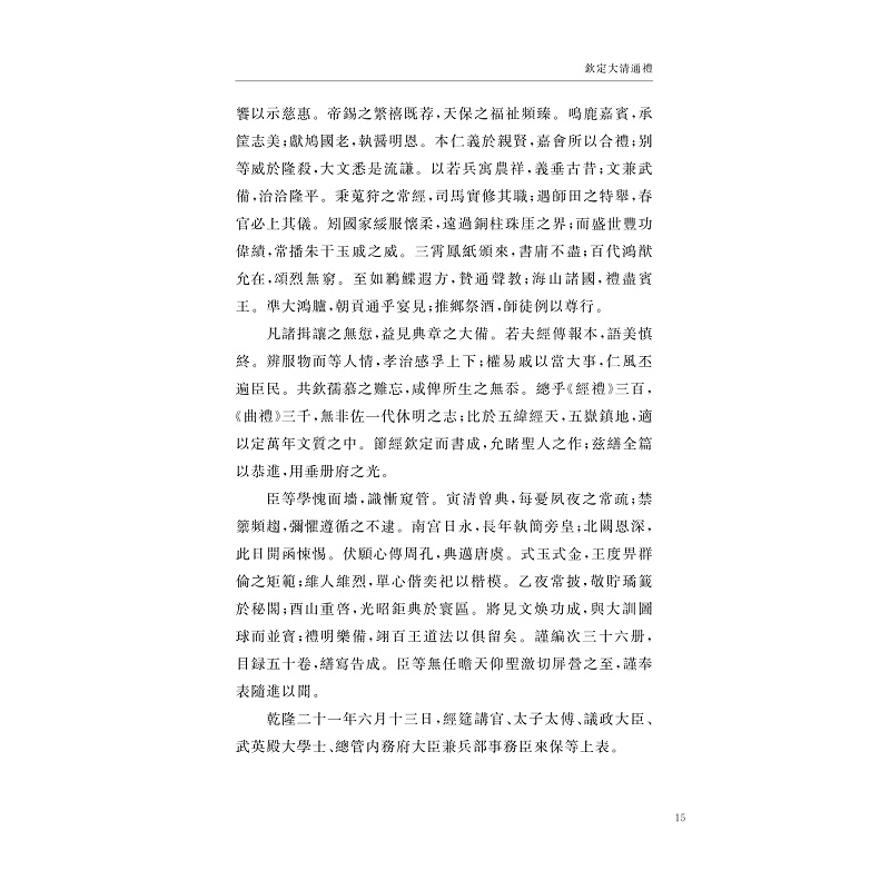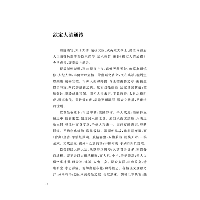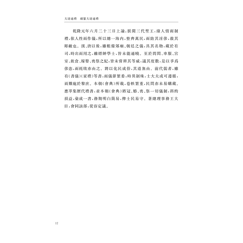 《大清通礼》,由来保等奉敕编纂,以历朝沿用的吉、嘉、军、宾、凶五礼为纲,“依序编纂,有条不紊,每篇首弁以数言括其大指,仍于目录下,胪次诸仪之名,以便翻阅”。今人学者评价此书是清廷实施‘礼治’方略的基础和总纲,具有重要的研究价值。 《续纂大清通礼》,在原书的基础上,于吉礼中增加“堂子祭天”之礼,嘉礼中增加“授受大典”之礼,又据《大清会典》于凶礼后增加“冠服”通制和“仪卫”通制各一卷,共计新增四卷内容。