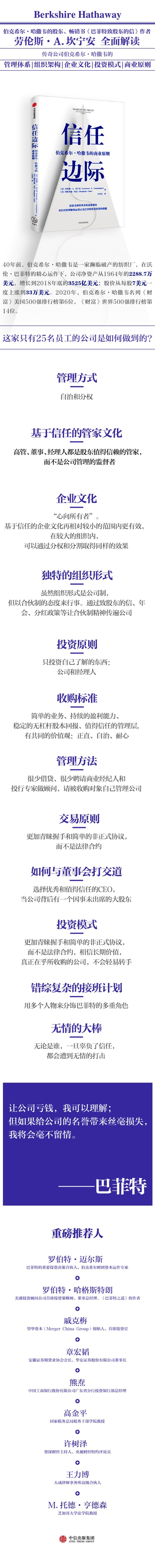 思路需要经验的积累,灵感来自感受的沉淀。然而管理无止境,创新无止境,只有站在巨人的肩膀上才能站得更高。他山之石可以攻玉。《信任边际:伯克希尔·哈撒韦的商业原则》一书全面总结了伯克希尔·哈撒韦公司的商业模式和内部管理机制,这本书值得每一位投资人和管理者学习借鉴。