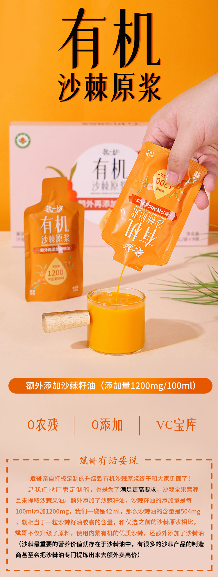 【斌哥优选】有机沙棘原浆。内蒙有机沙棘全果,额外添加沙棘籽油,从此沙棘变得好喝,大小朋友都能接受。每日一支补充维生素。