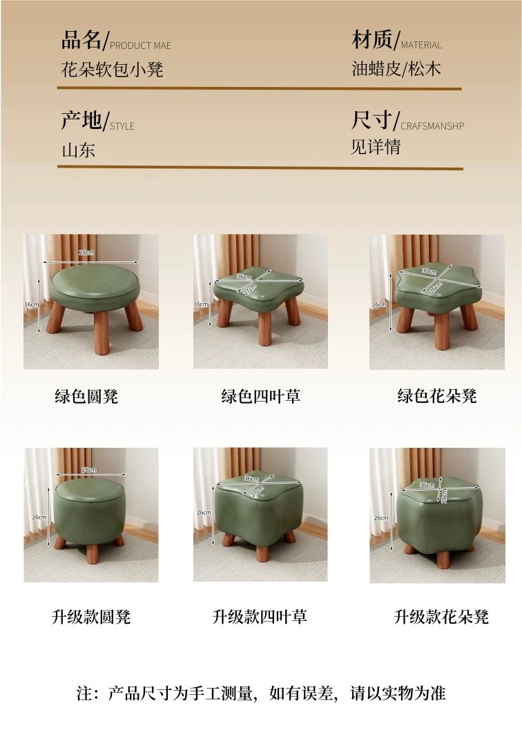 自带欧美复古感坐凳【花朵软包小凳】 凳脚带静音贴,6个款式任你选购 使用频率最高的小凳子~打扫卫生,拆快递神器 【产品名称】:花朵软包小凳 【规格】:Sku1:绿色圆凳 Sku2:绿色四叶草 Sku3:绿色花朵凳 Sku4:升级款圆凳 Sku5:升级款四叶草 Sku6:升级款花朵凳 【发货地区】:山东 【发货时间】:72小时内 【发货快递】:三通一达,极兔,邮政随机 【加运费地区】:甘肃,青海,宁夏, 北京, 上海+1/单;海南+1.5/单 【不发货地区】:新疆西藏 【售后保障】:质量问题请提供产品和快递面单合照【24小时】内和快递单【合影拍照】发给客服,单号必须【清晰可见】 【注意】 1.每个木制品木纹,色泽均有微少差异,木纹不规则等情况属于原木生长的正常现象 2.新的木制品,请先用清水洗或柔布擦拭。为了更长久地使用与保护,可用植物油擦涂木制品表面 3.避免长时间浸泡,避免用强力清洁剂,避免钢丝球等。请用摩擦力较低的布水洗擦拭,请尽量温柔对待 4.请尽量放置在阴凉通风处,避免暴晒,不要放置在高温炉具,电器旁 5.如因使用不当导致变形开裂,可抹植物油后晾干挽救 6.木制品的木材是有孔隙的,木材本身有色素,有轻微褪色属正常情况,是木材本身的颜色,不影响正常使用哦~(PS:柚木的情况会比较明显) 7.木制品一般会涂抹一层植物油来进行保养,并延长其使用寿命清洗后即可去掉多余油脂,不会影响正常使用