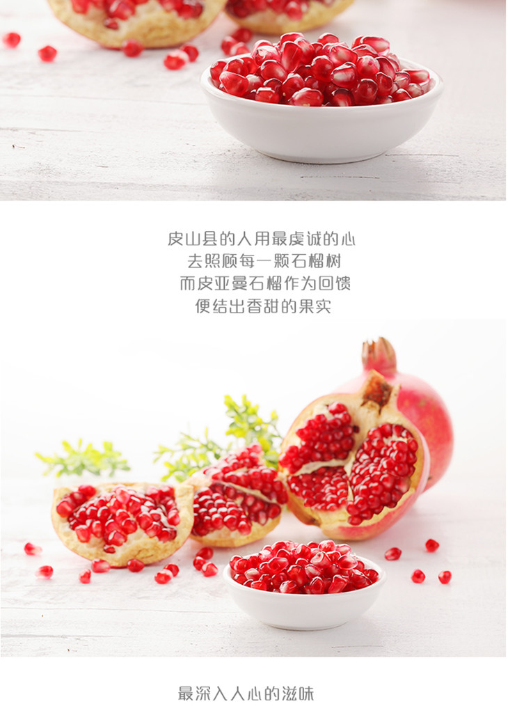 新疆的南疆是一块宝地,土地资源辽阔,盛产各种特色农产品。皮亚曼石榴被称之为“丑石榴”,丑是因为外表锈迹斑斑,甚至有些还有深深的裂纹或者有裂口,但是,收到这样的石榴千万不要嫌弃的扔掉哦,不但不影响口感,反而会越好吃尼,打开石榴就能看到红宝石般的石榴籽紧紧裹在一起,剥一把石榴籽放入口中,美味的爆汁简直是爽歪歪;本地人吃石榴喜欢剥一把塞进嘴里,那叫一个过瘾!