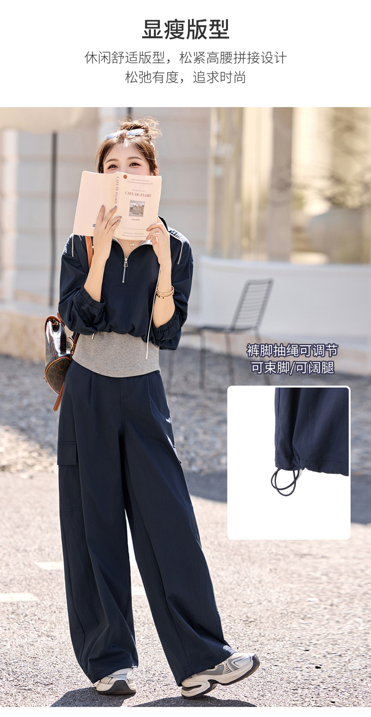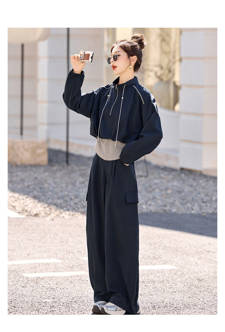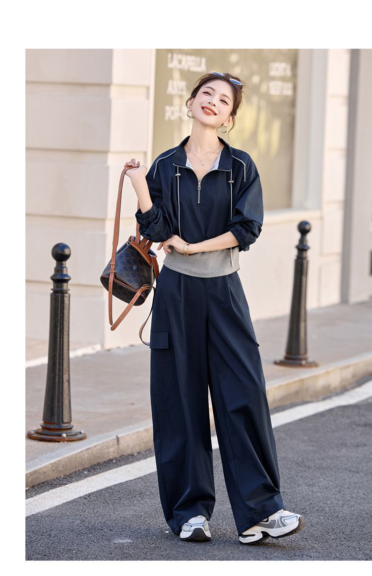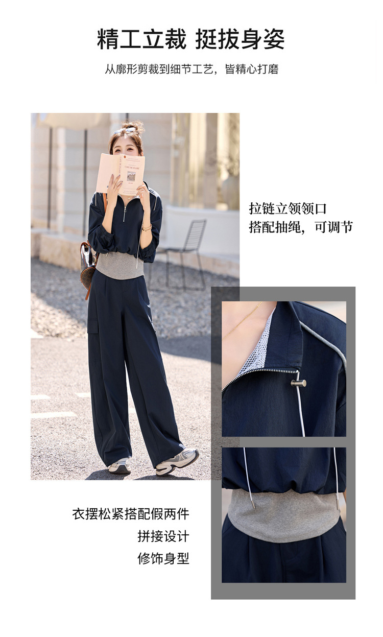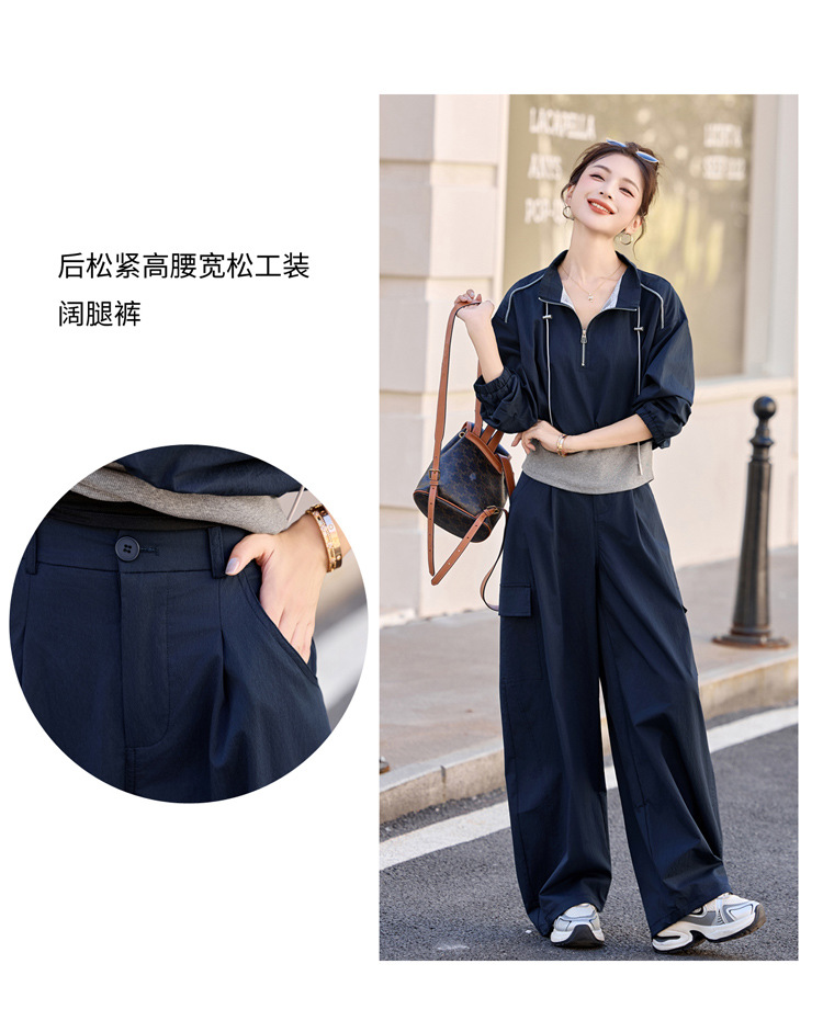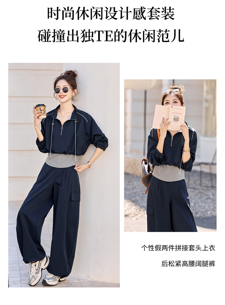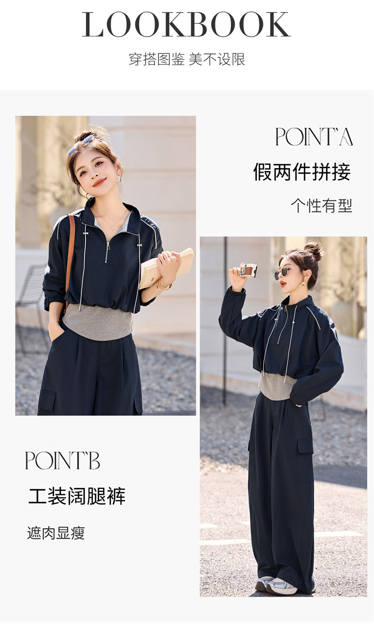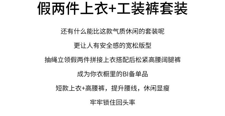 HR YF2615慵懒风休闲运动工装套装假两件拼接上衣阔腿裤二件套 商品图4