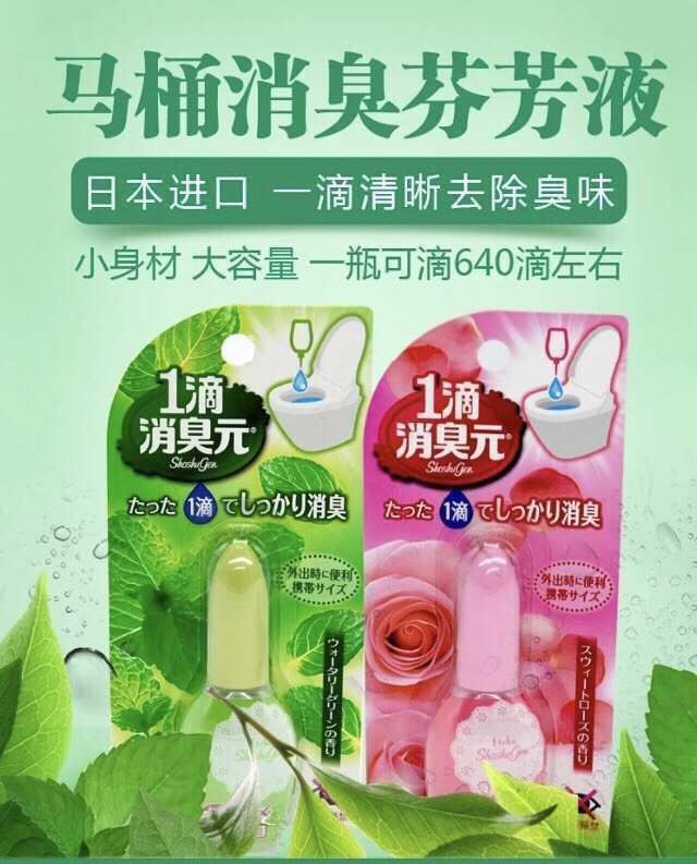 小林制药一1滴消臭元厕所香薰 20mL兩色可選:粉色-玫瑰花香🌹,綠色-清新薄荷香🍀 哈哈,其實生活中還蠻需要的哈~🤔在拉臭臭的時候可能會因為味道挺大,開了排風扇可能一時半會兒也消散不掉的味道,讓再進入衛生間😏的人有所尷尬所以呢,🇯🇵霓虹國就出現了這貨,其實開始也不是這樣滴狀的,在用馬桶前使用,在馬桶積水處🎏里先滴1-2滴,然後開始嗯嗯...香味基本是很快散髮出來的~~從而達到消臭的效果哈.🌸然後,就香香噠~~