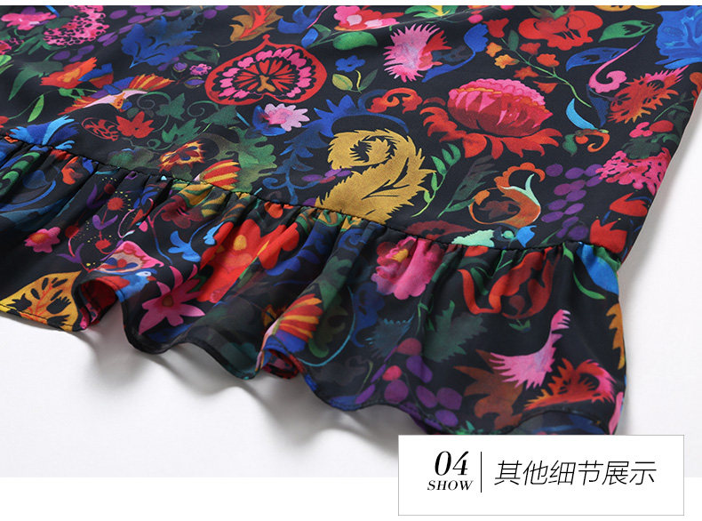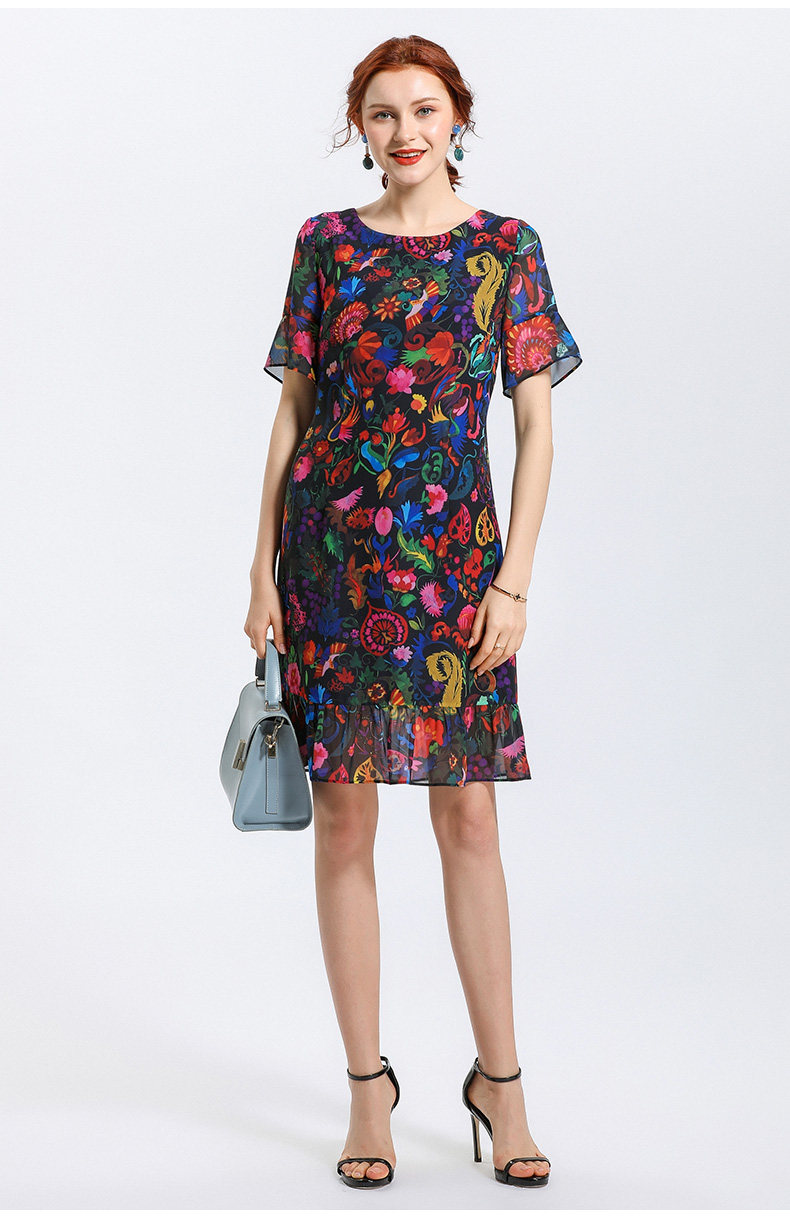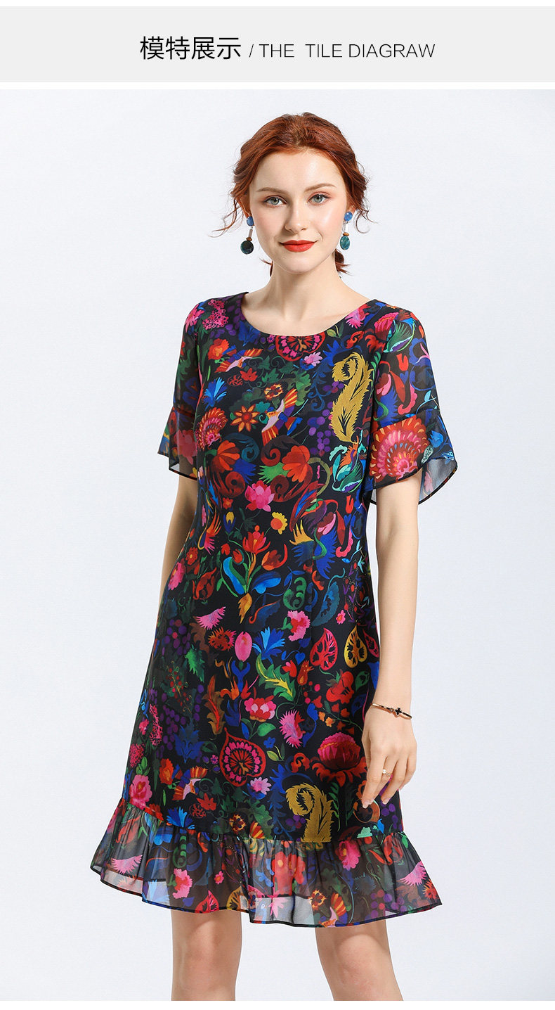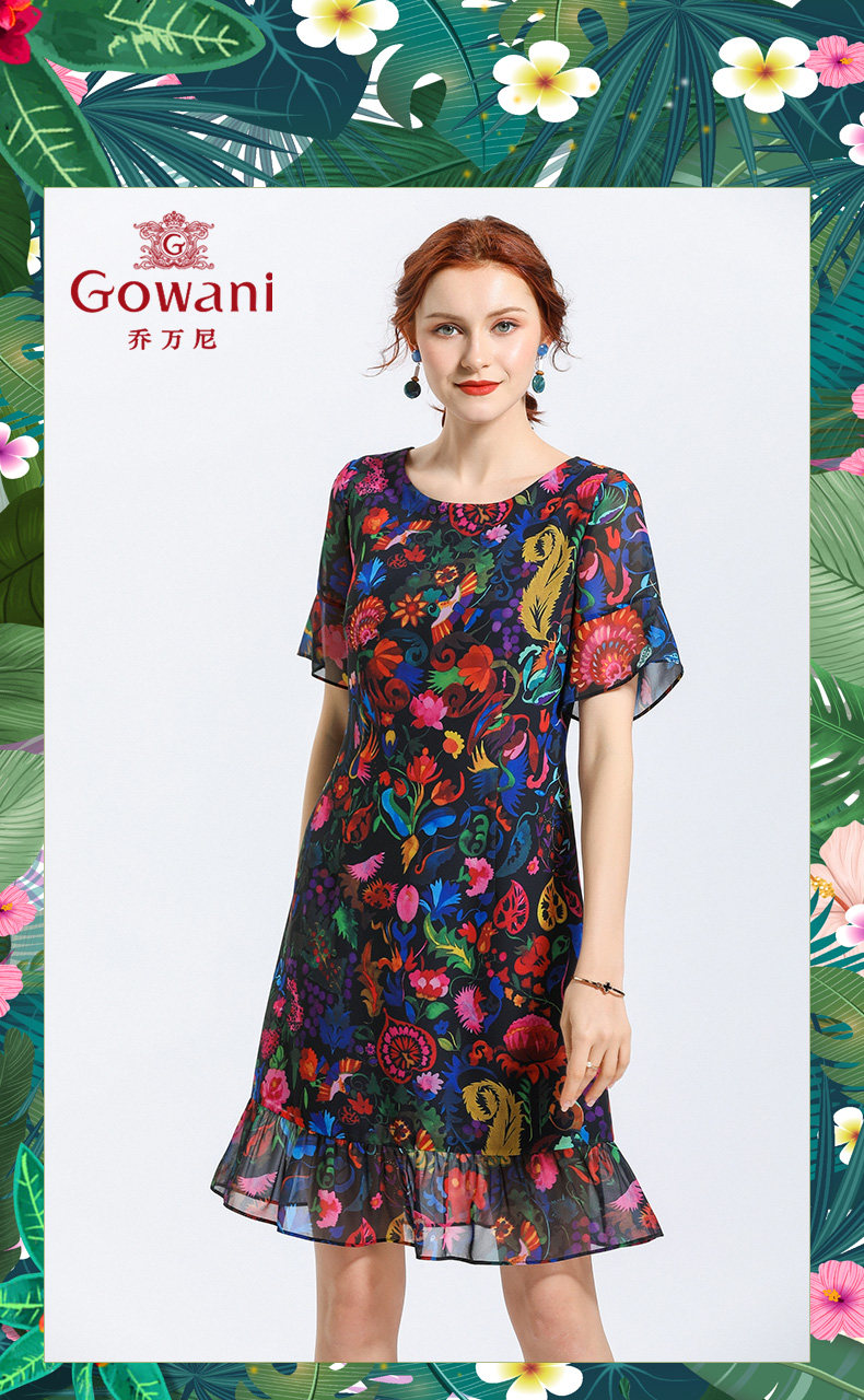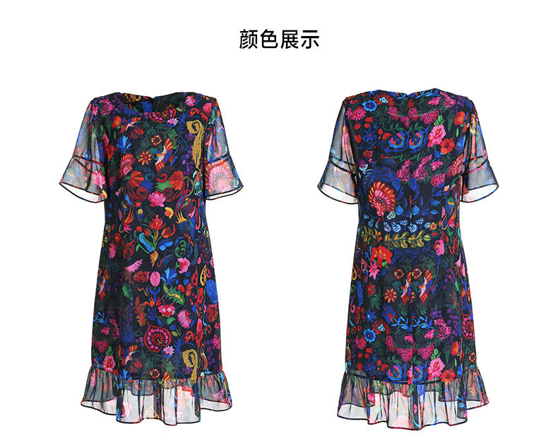 乔万尼夏季时尚国潮印花拼接网纱气质桑蚕丝连衣裙女EN2E561