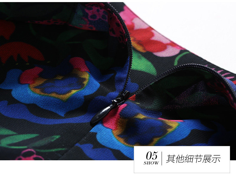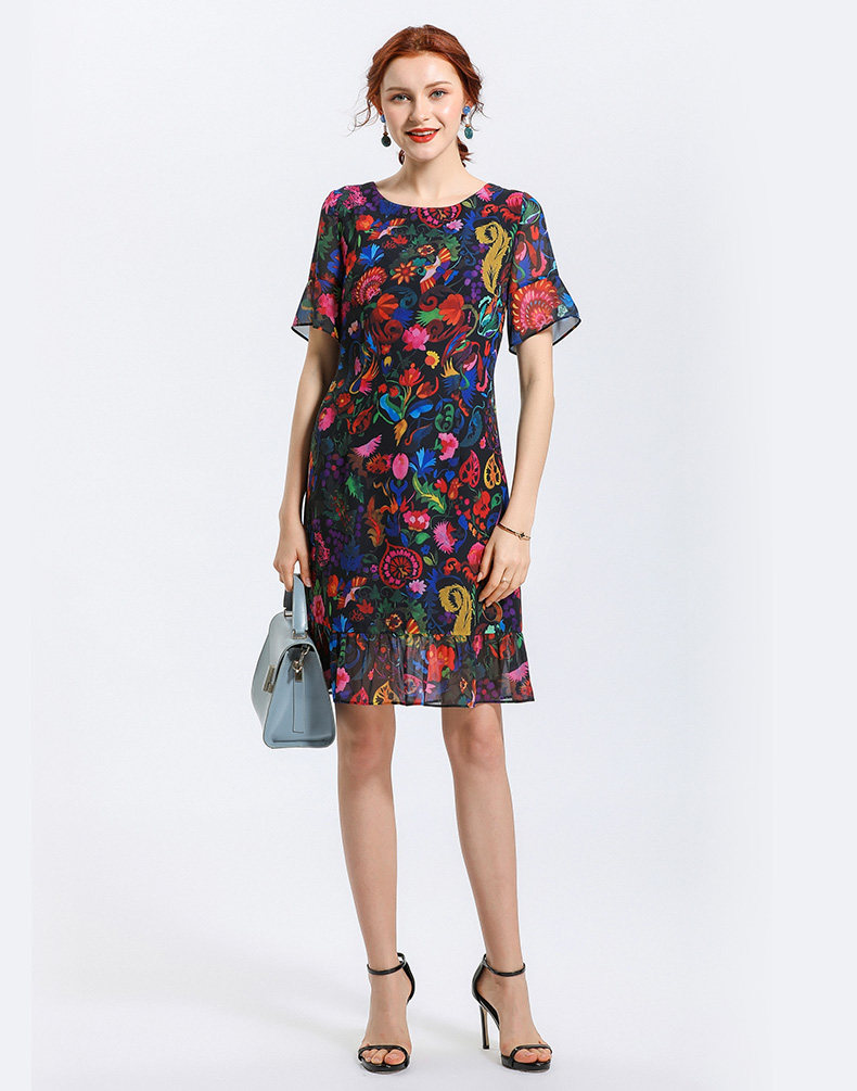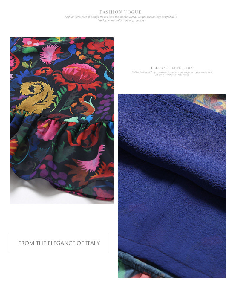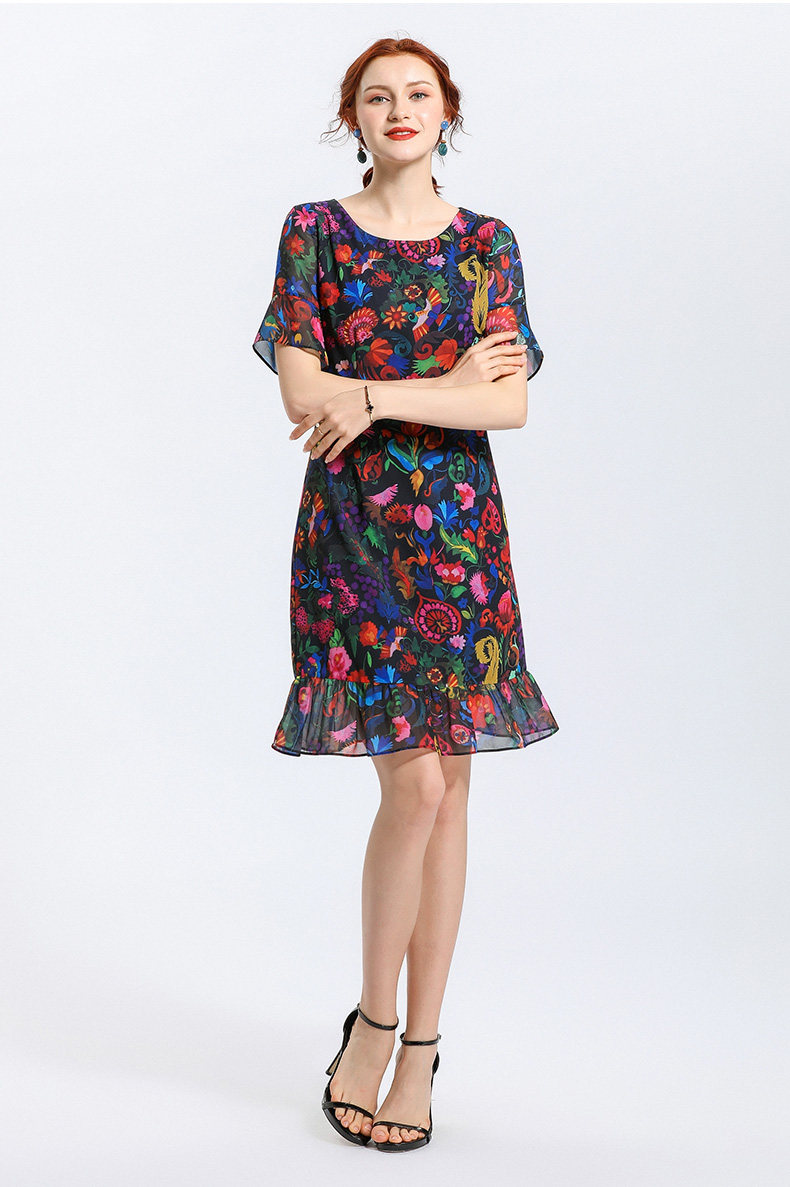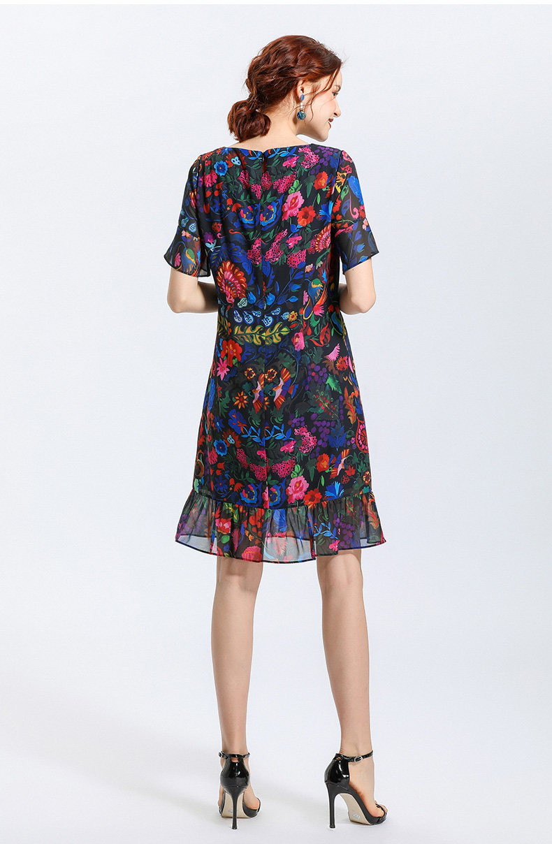 乔万尼夏季时尚国潮印花拼接网纱气质桑蚕丝连衣裙女EN2E561