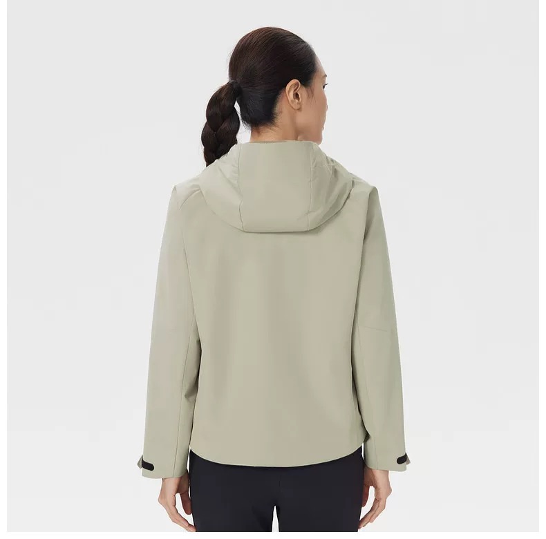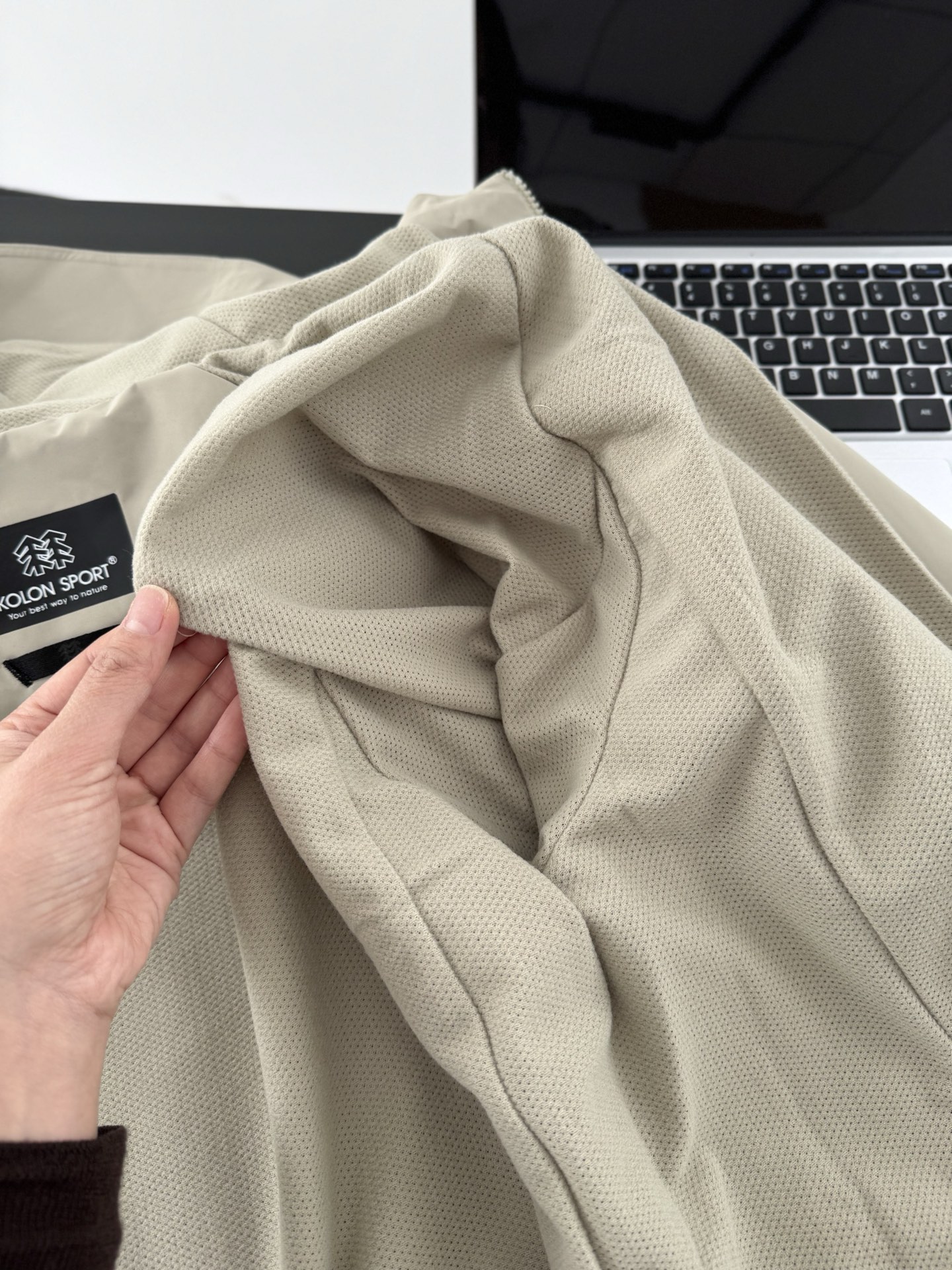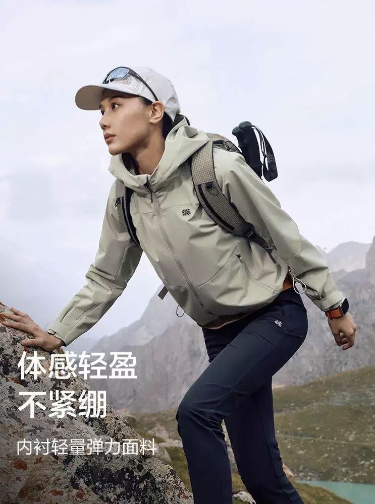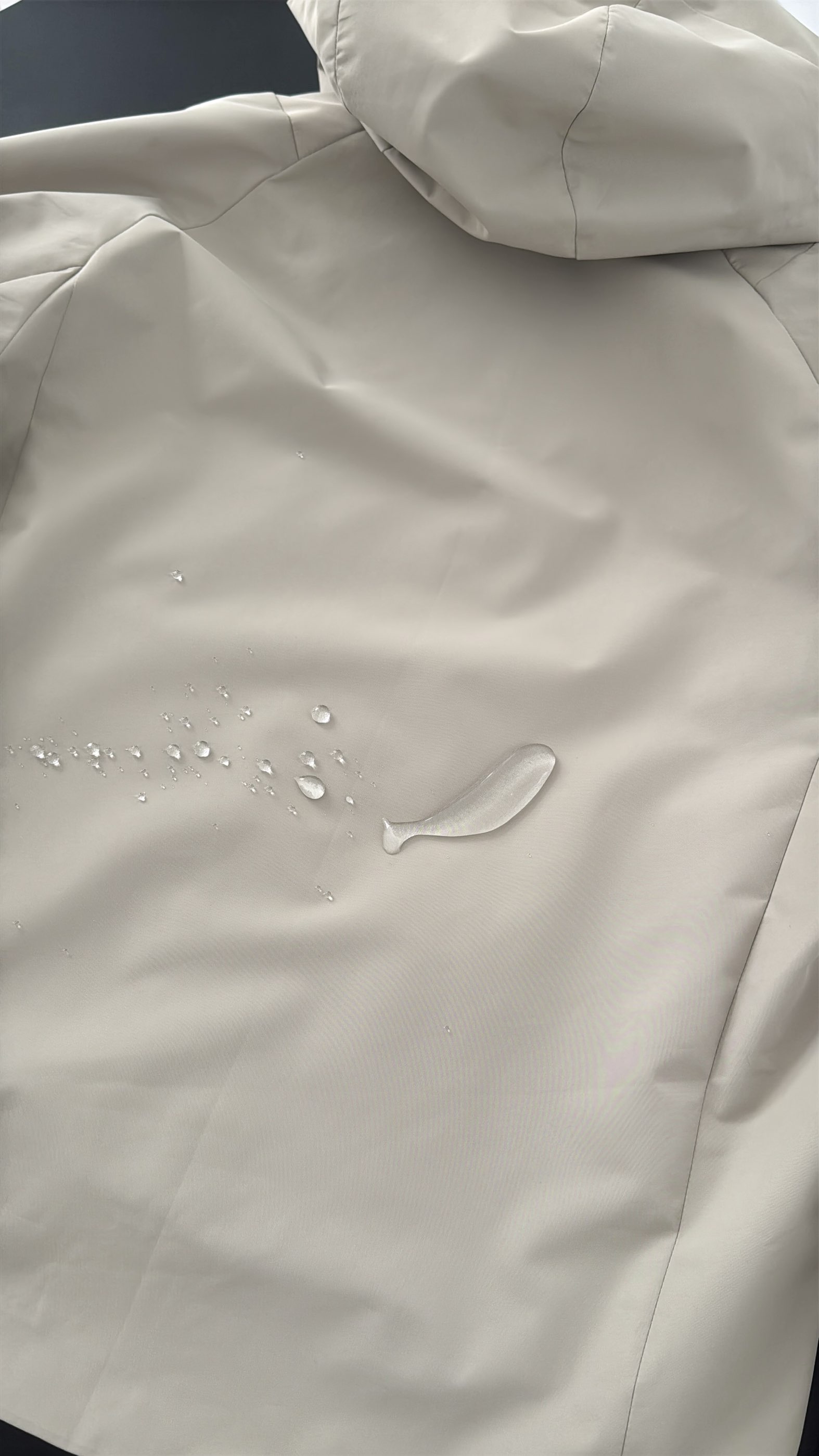 外层采用100%聚酯纤维面料!表面结构紧凑密实,并且经过特殊处理,水滴落在上面会自然滚落,有效抵御春日的细雨与通勤路上的突发天气;柔韧质地带有挺括感,上身轻盈无负担,不会产生传统硬壳冲锋衣的束缚!
