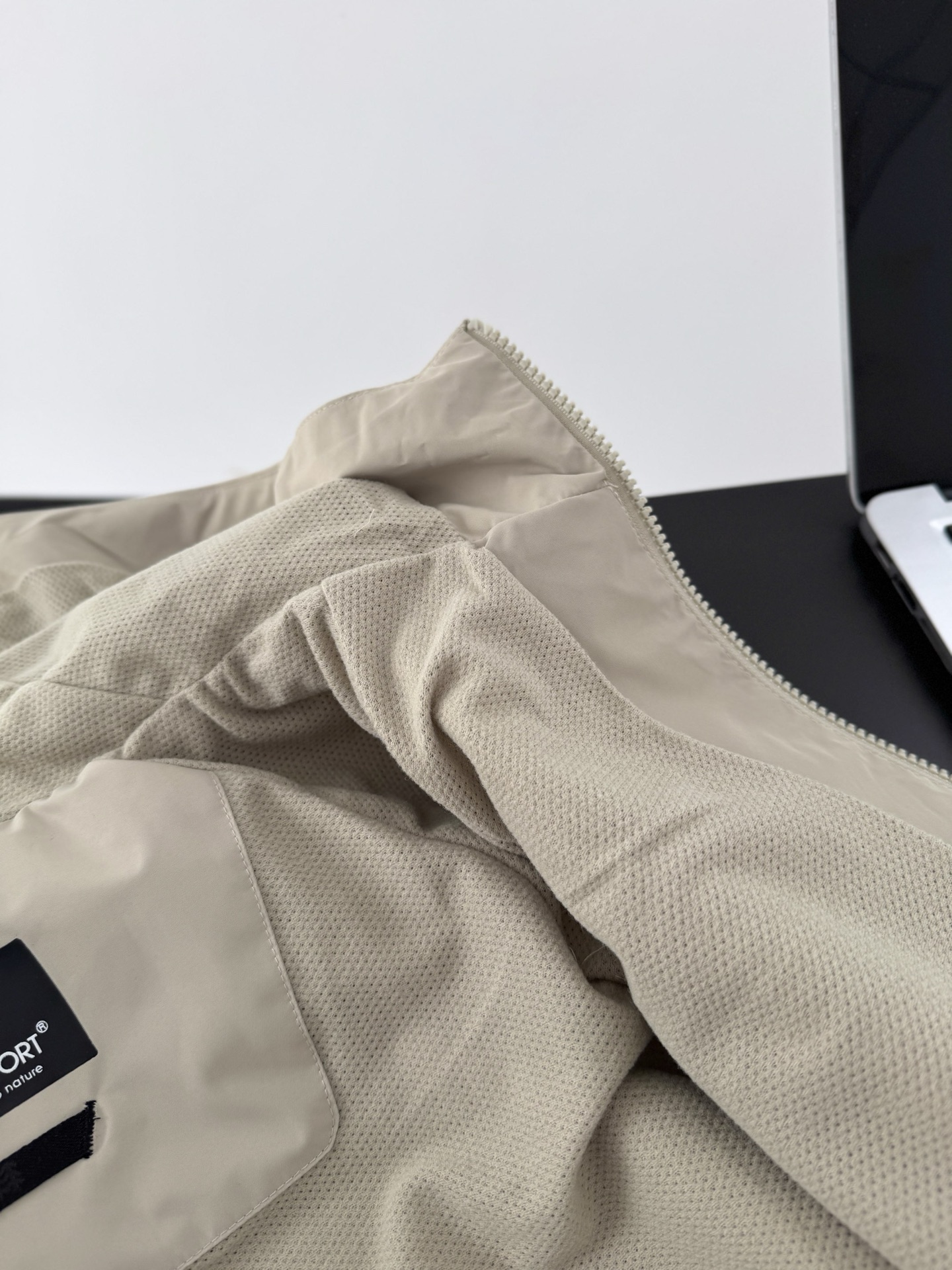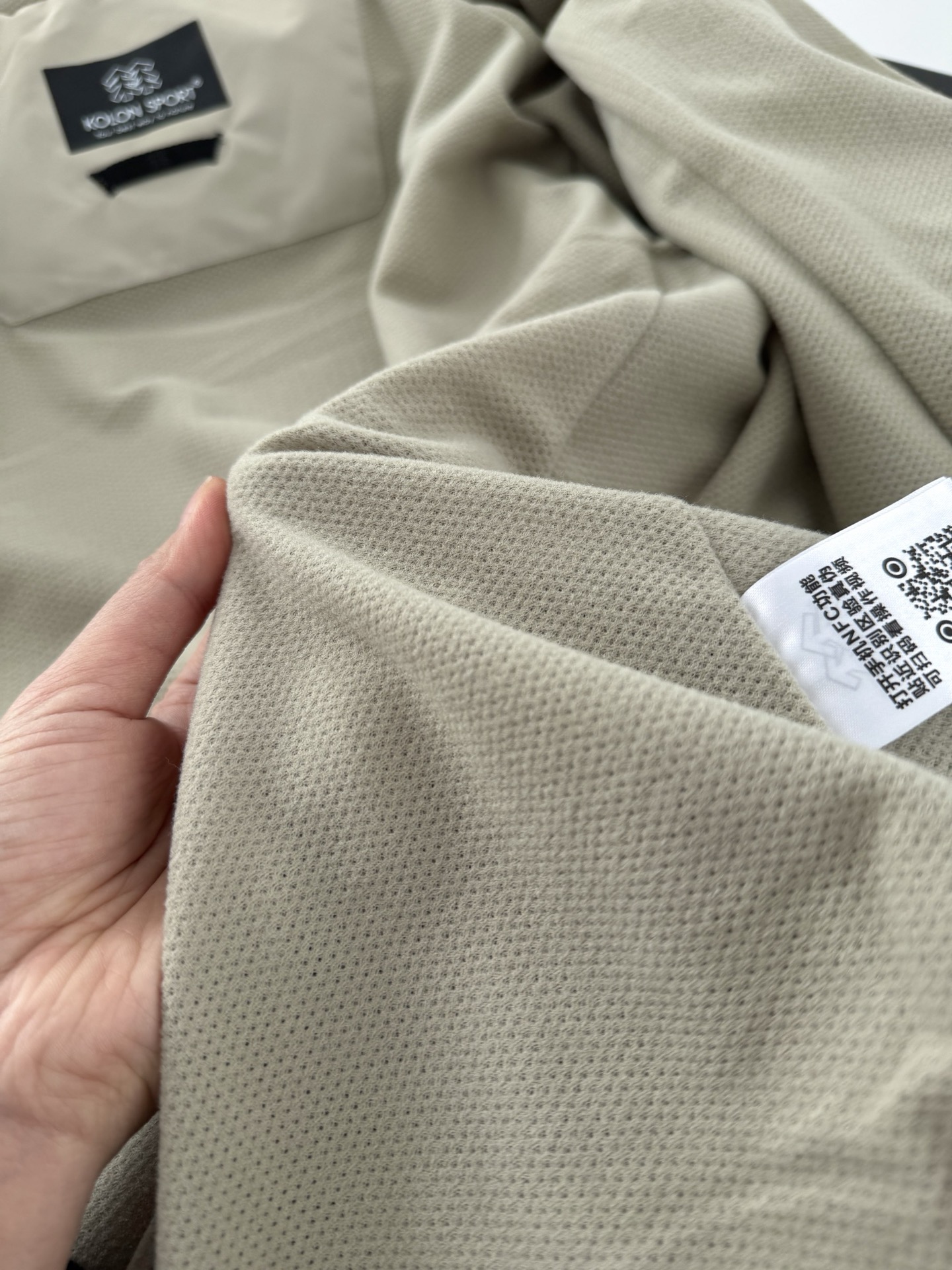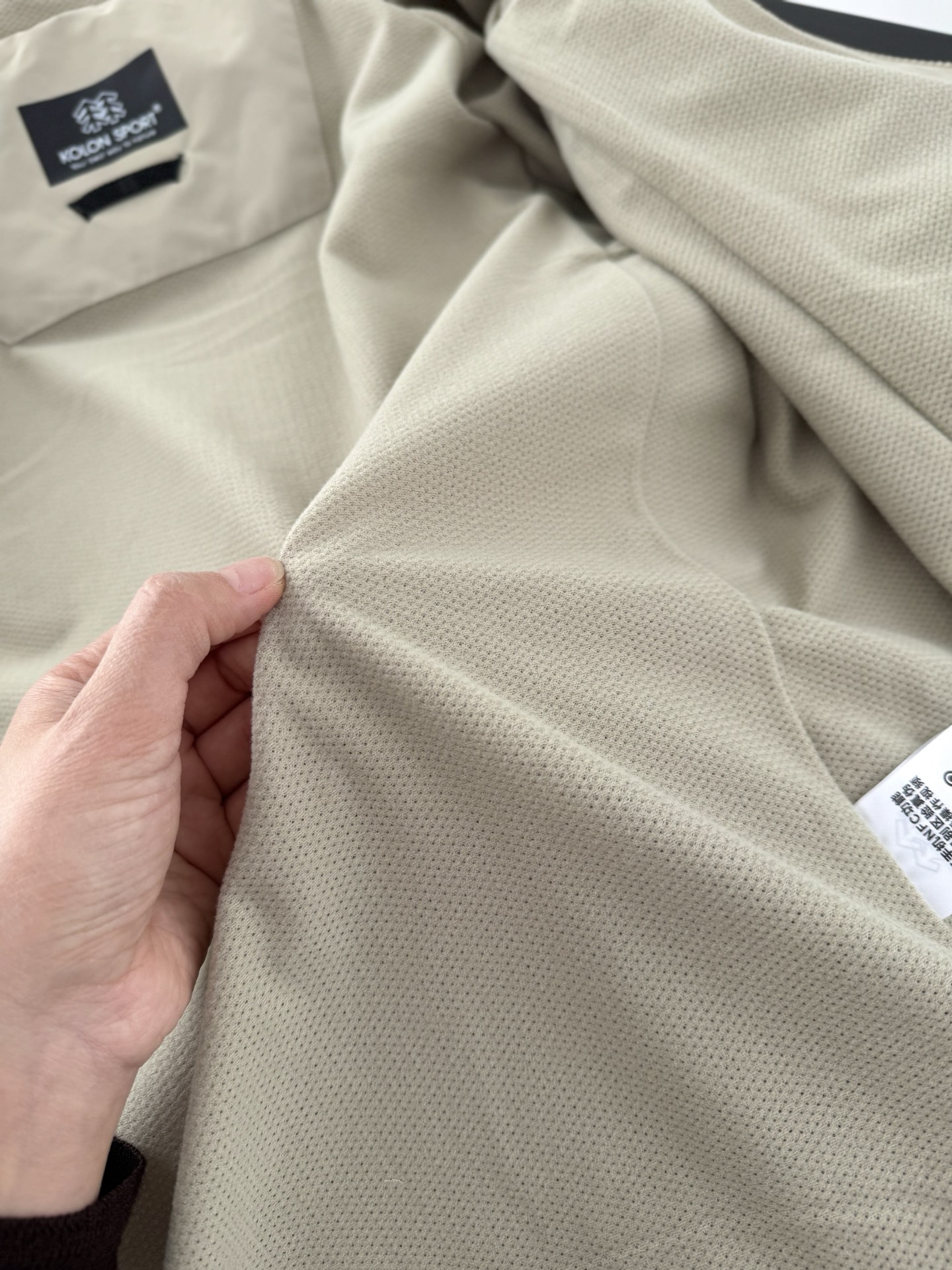 外层采用100%聚酯纤维面料!表面结构紧凑密实,并且经过特殊处理,水滴落在上面会自然滚落,有效抵御春日的细雨与通勤路上的突发天气;柔韧质地带有挺括感,上身轻盈无负担,不会产生传统硬壳冲锋衣的束缚!