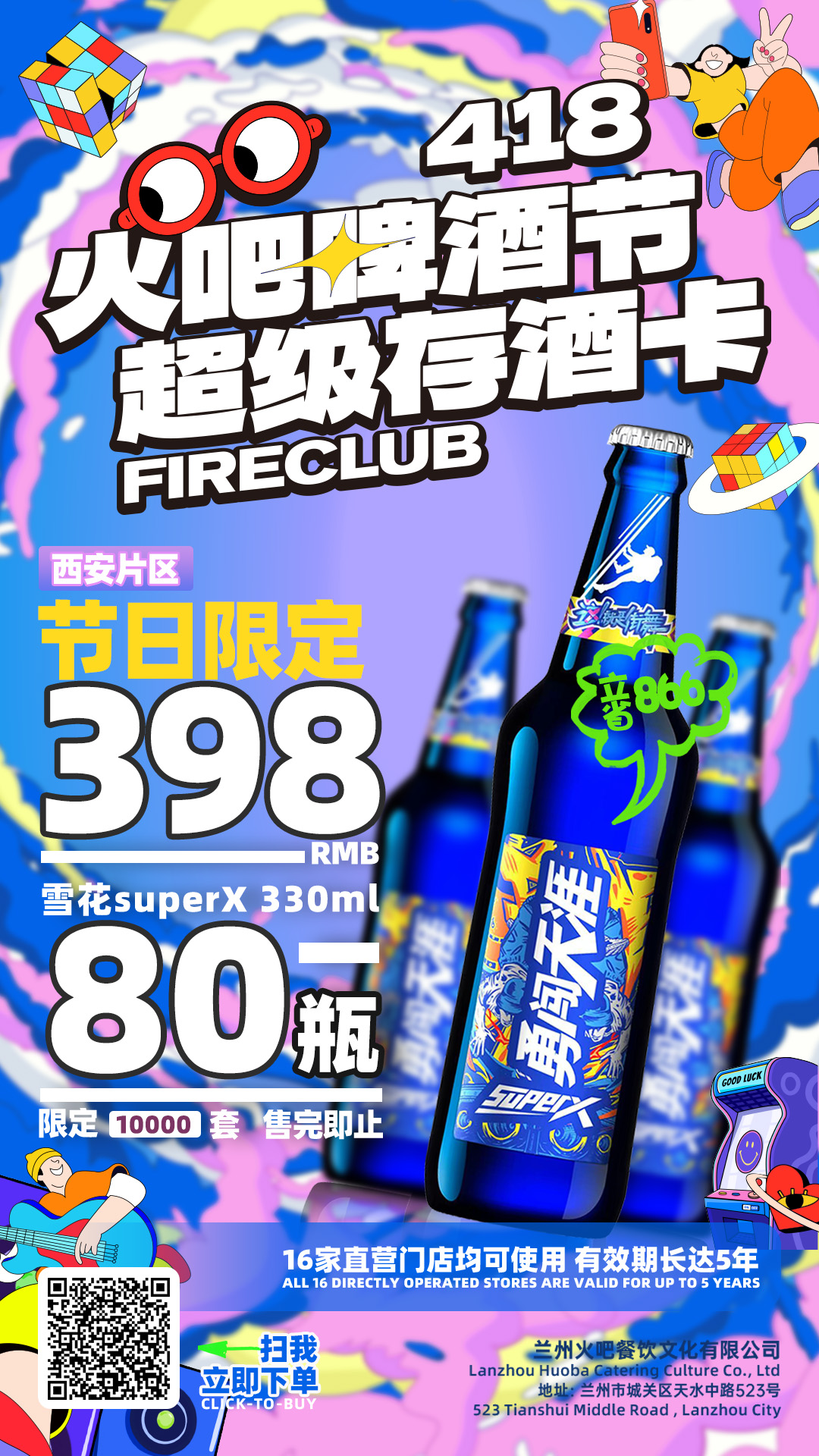 【西安通用】4月8日火吧啤酒节—超值存酒卡—398元80瓶雪花SuperX330ml