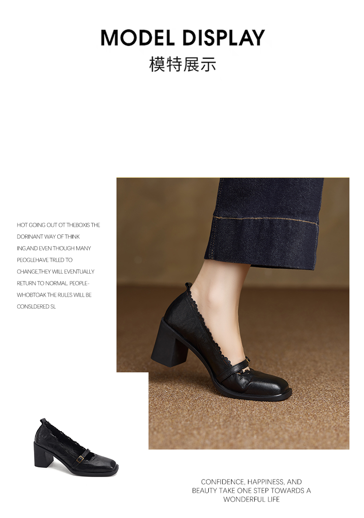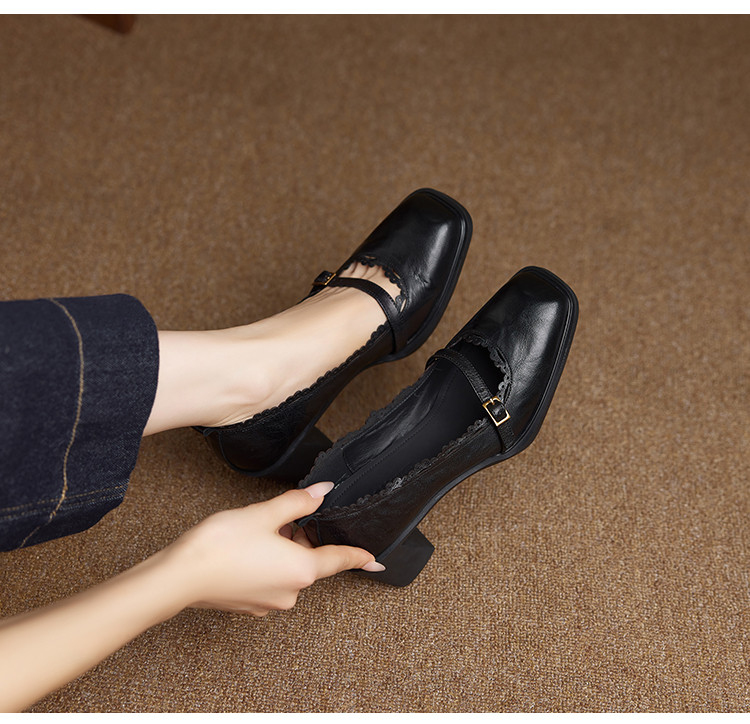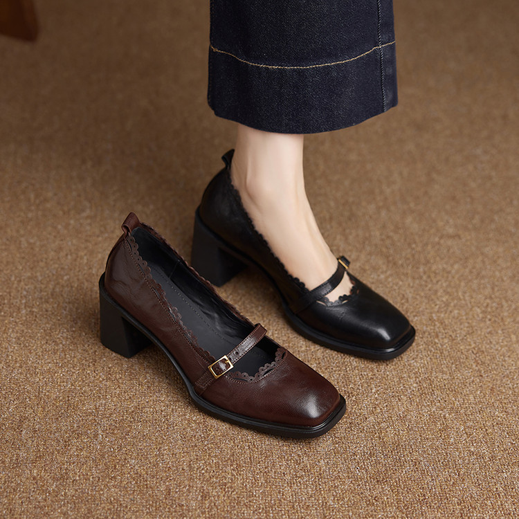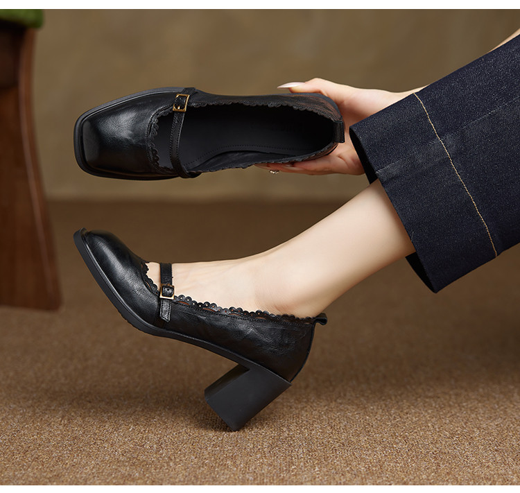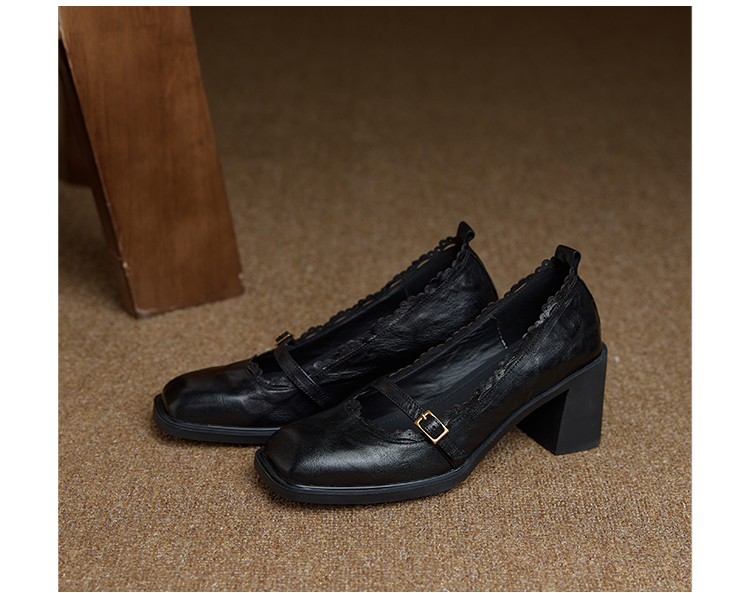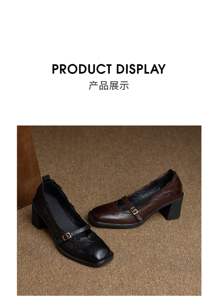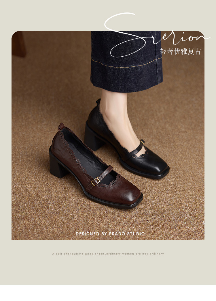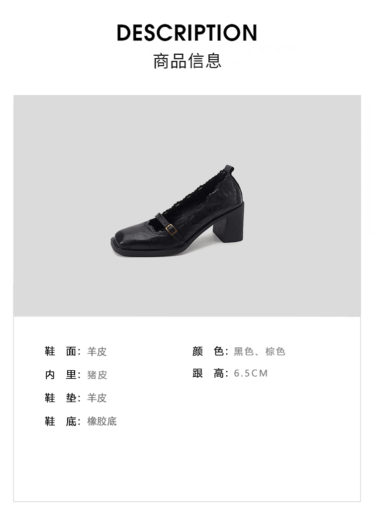 【预售5天】羊皮版~复古方头高跟玛丽珍单鞋,一字带花边气质高跟鞋通勤粗跟小皮鞋BE&b3280