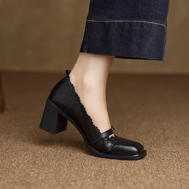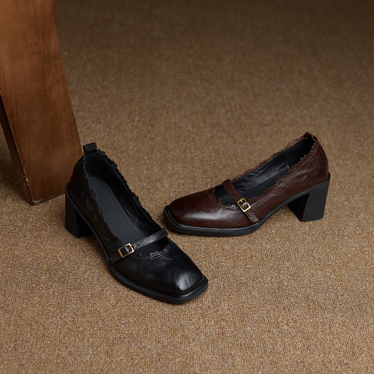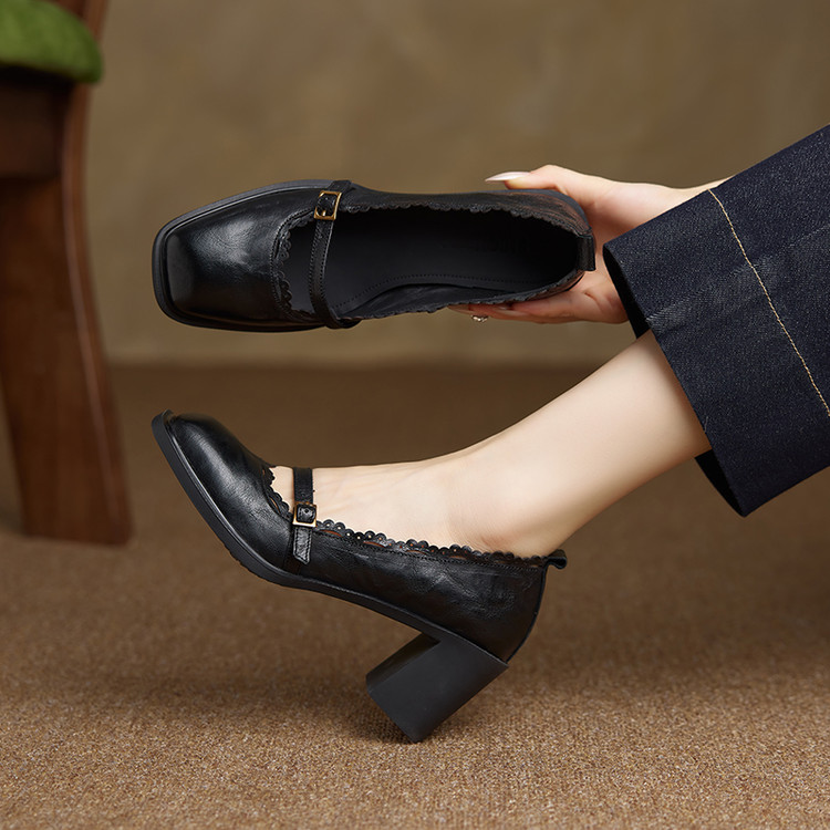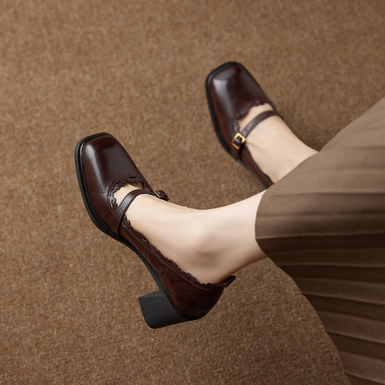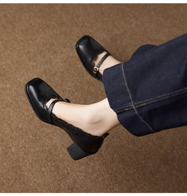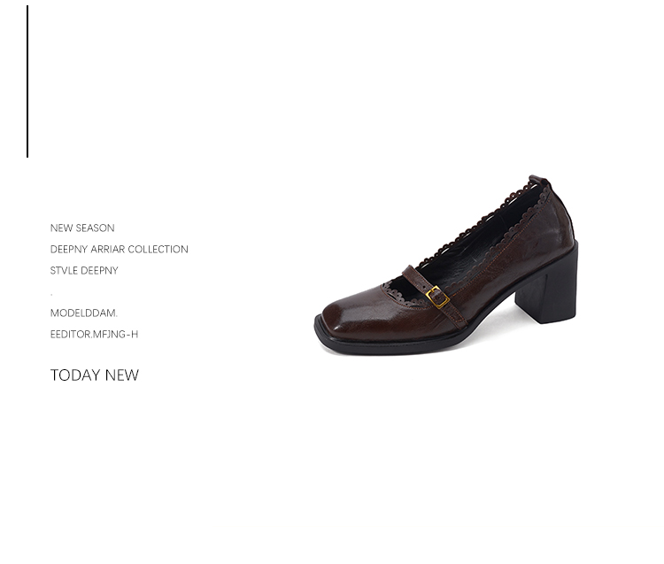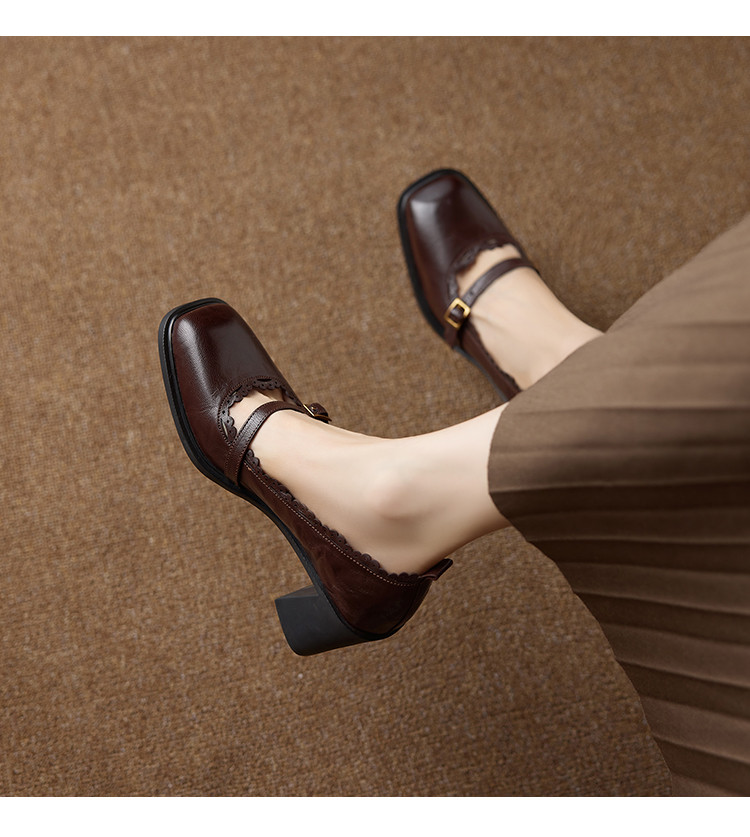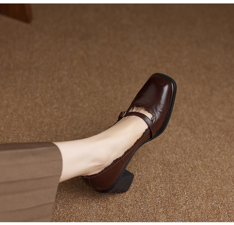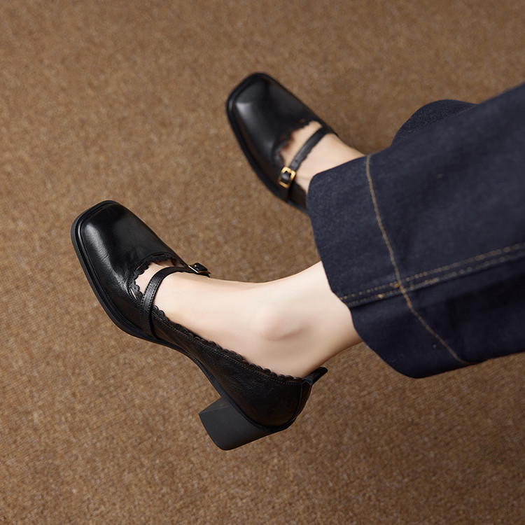 【预售5天】羊皮版~复古方头高跟玛丽珍单鞋,一字带花边气质高跟鞋通勤粗跟小皮鞋BE&b3280