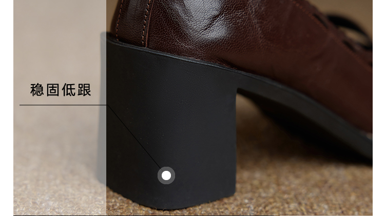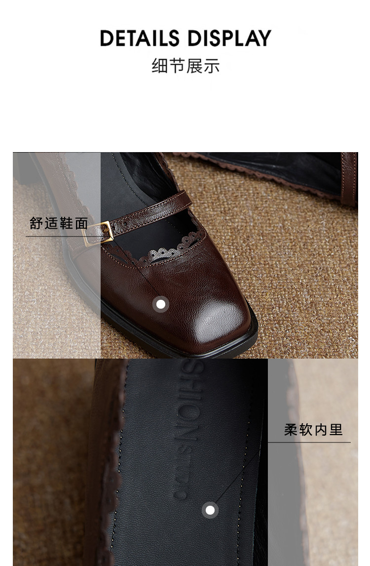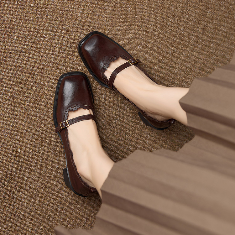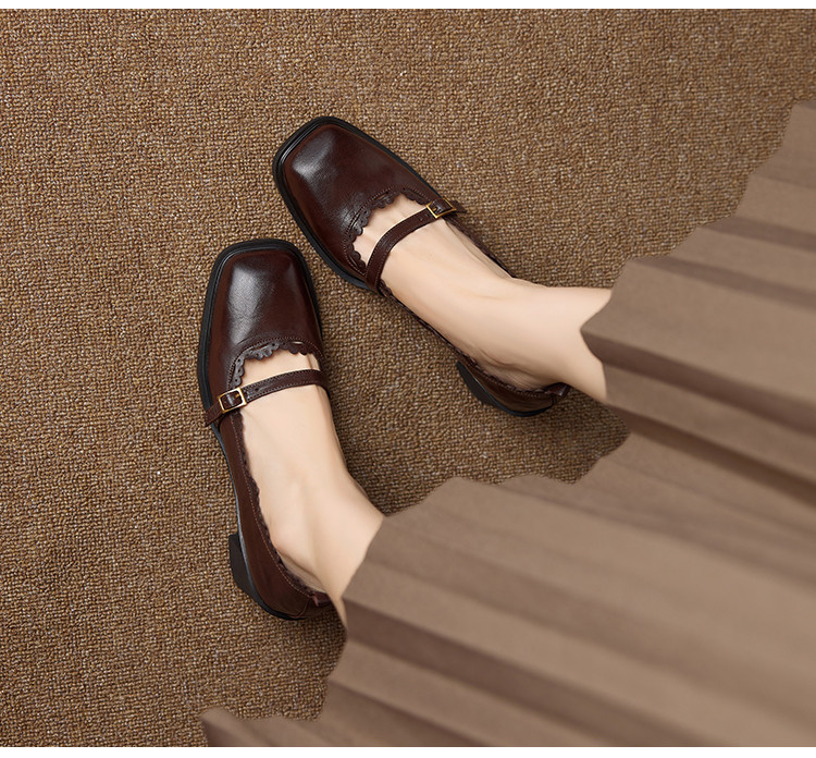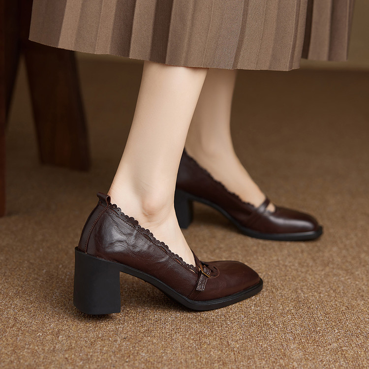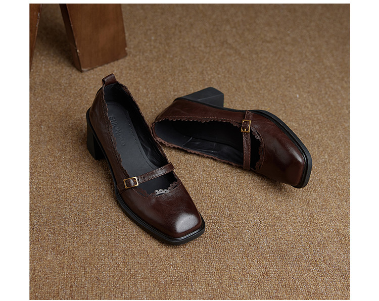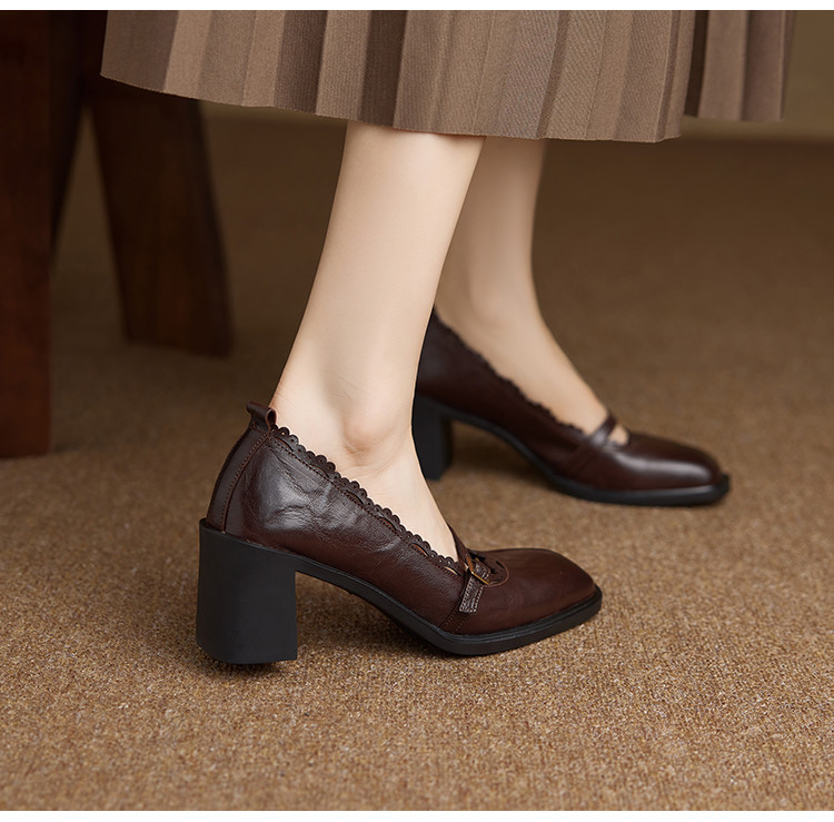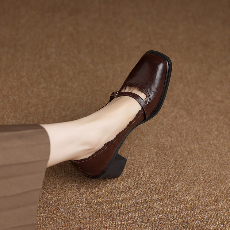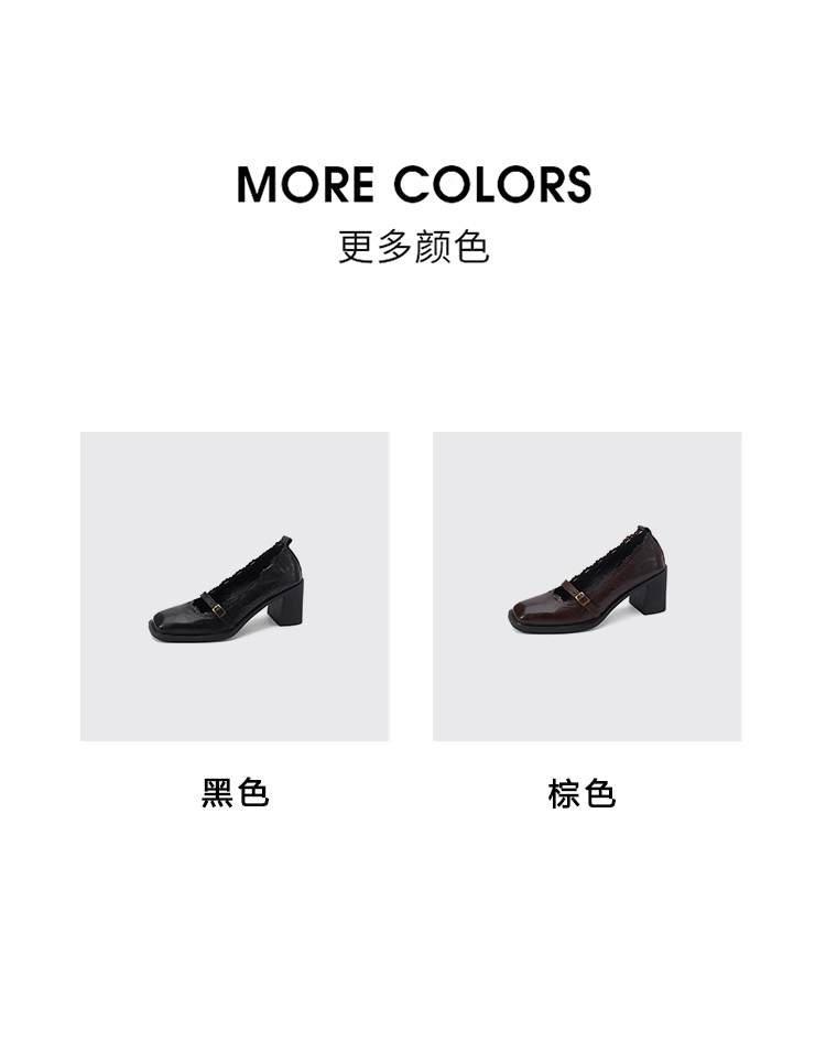 【预售5天】羊皮版~复古方头高跟玛丽珍单鞋,一字带花边气质高跟鞋通勤粗跟小皮鞋BE&b3280