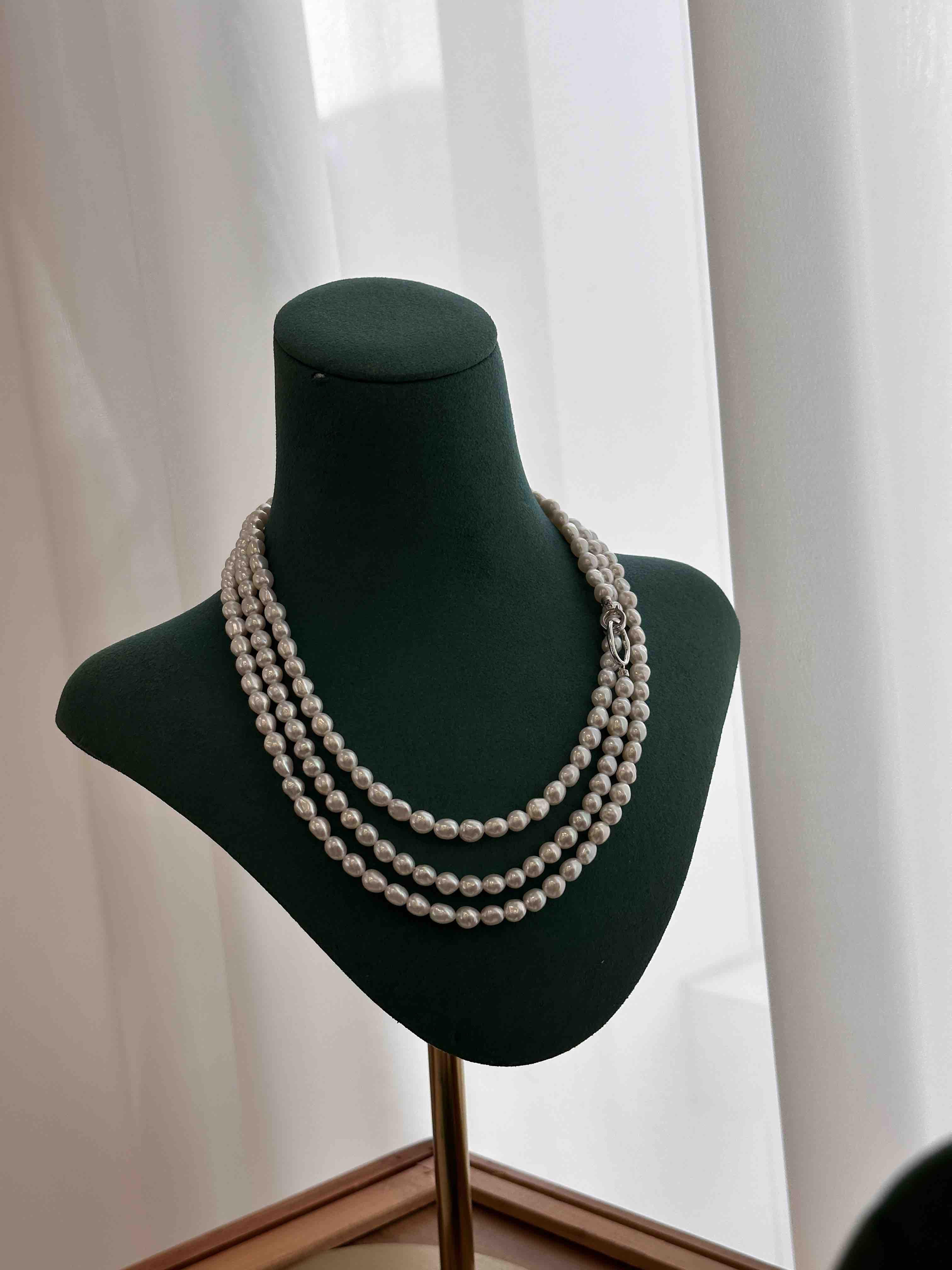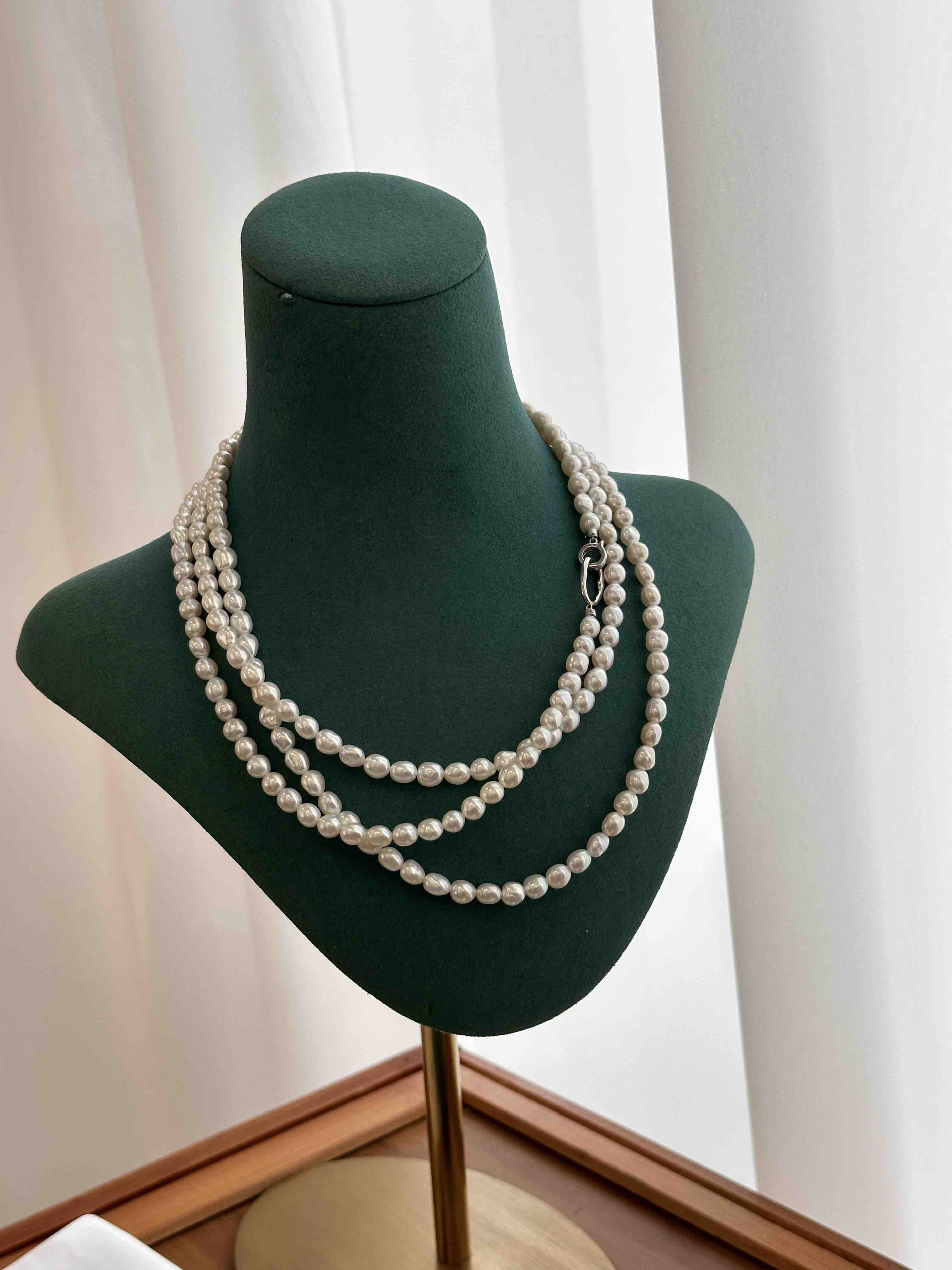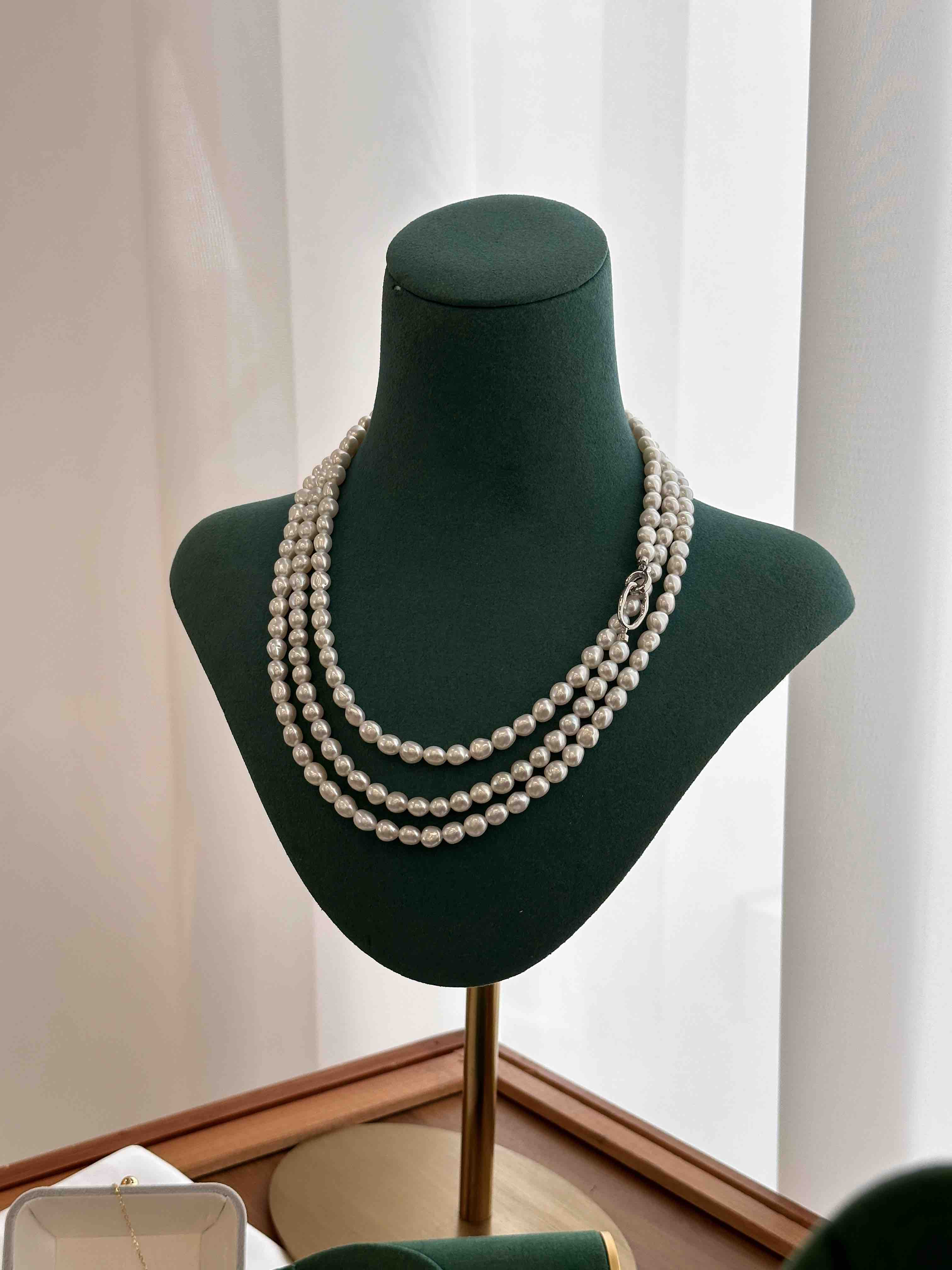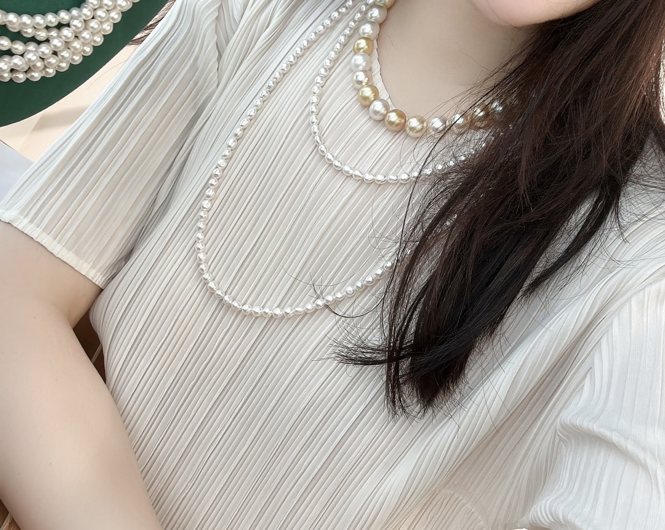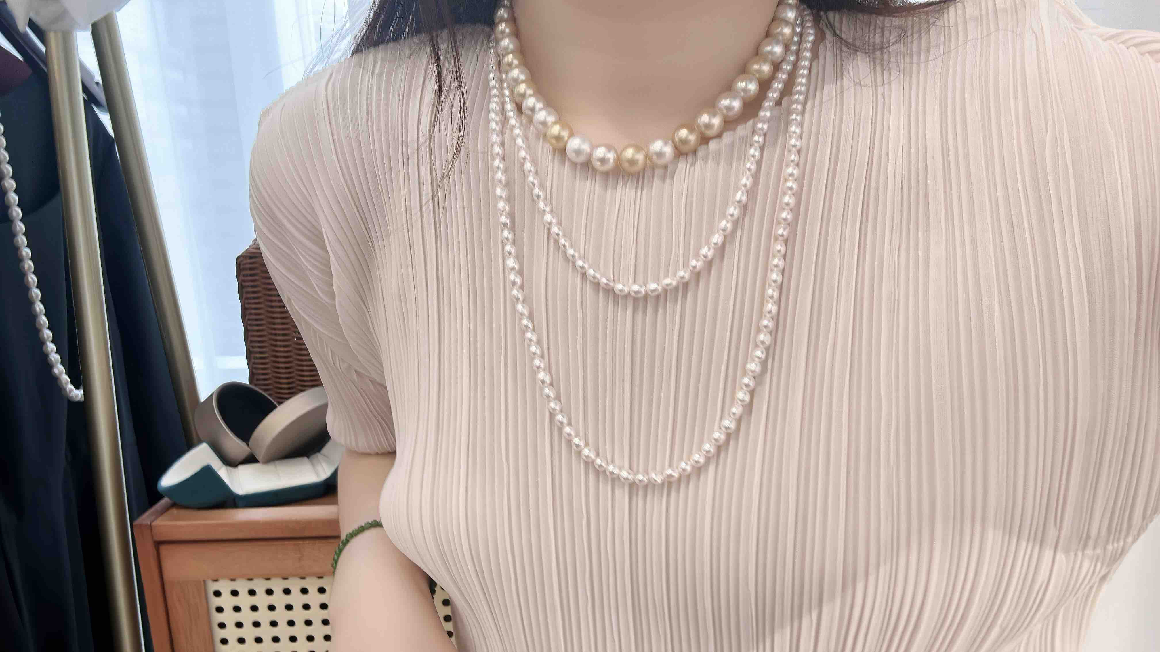 淡水te ji 光巴洛克三圈,长项链,ji光5-6mm巴洛克珍珠,凹造型的方式有很多的。价格也比较亲民。客人订了三条送给外国客户,她说很满意,主要是珠光确实很亮。[强] 搭配随意的项链,蛮有松弛感的。