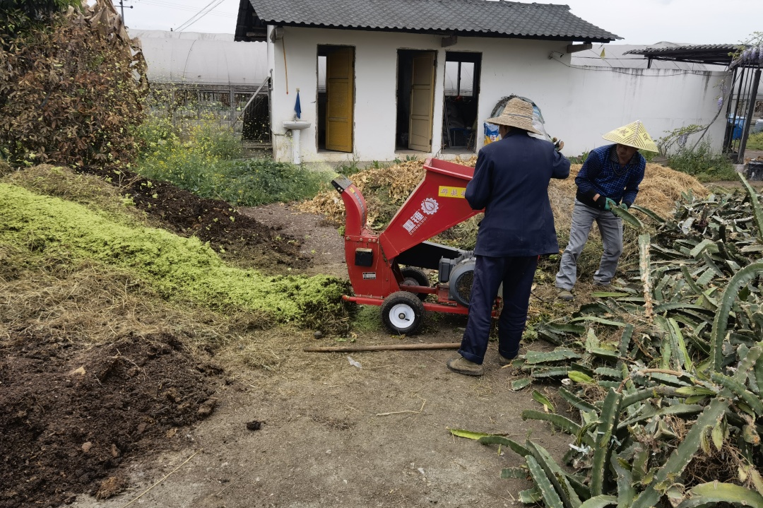 右上:杂草和果树枝叶粉粹后混合牛粪堆肥
