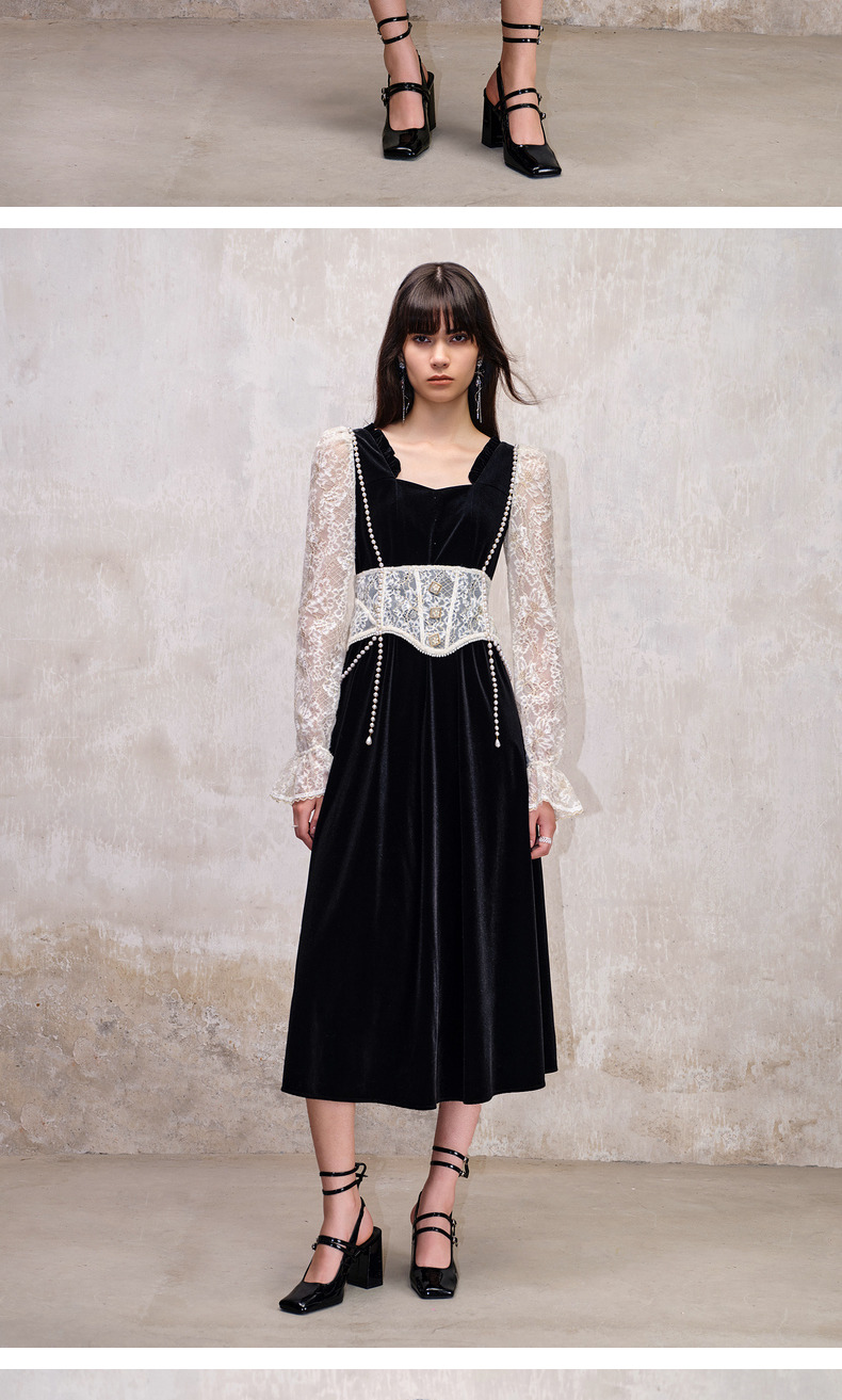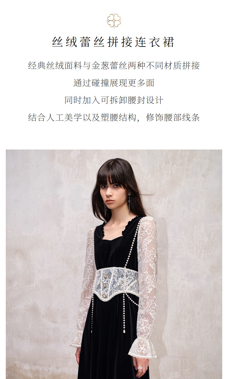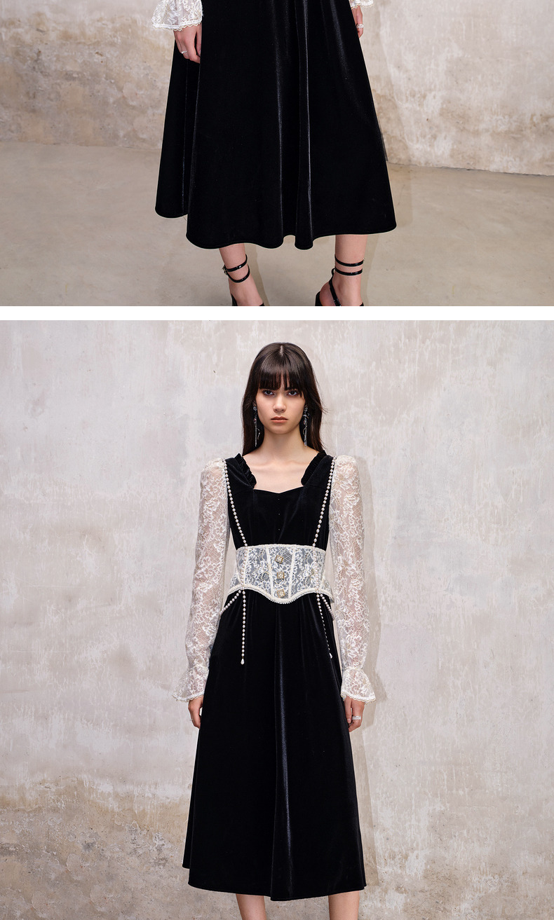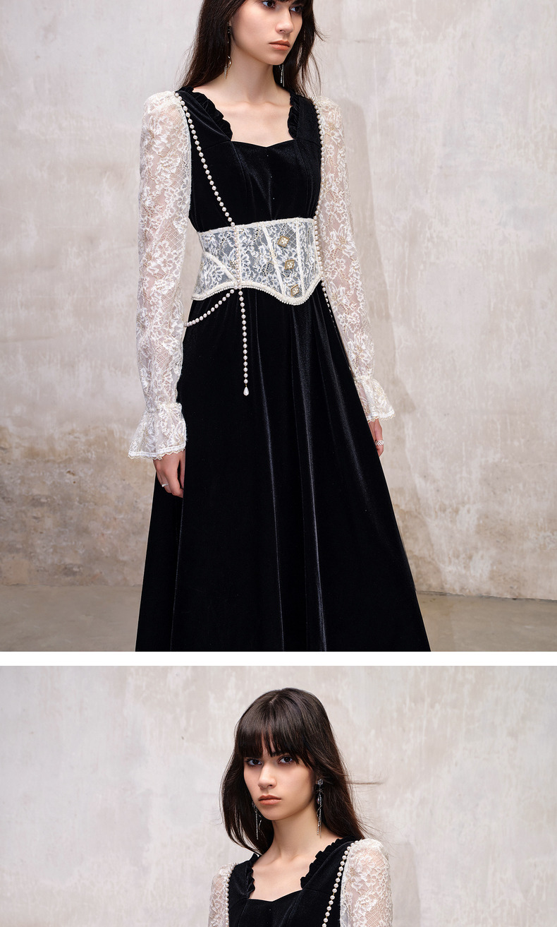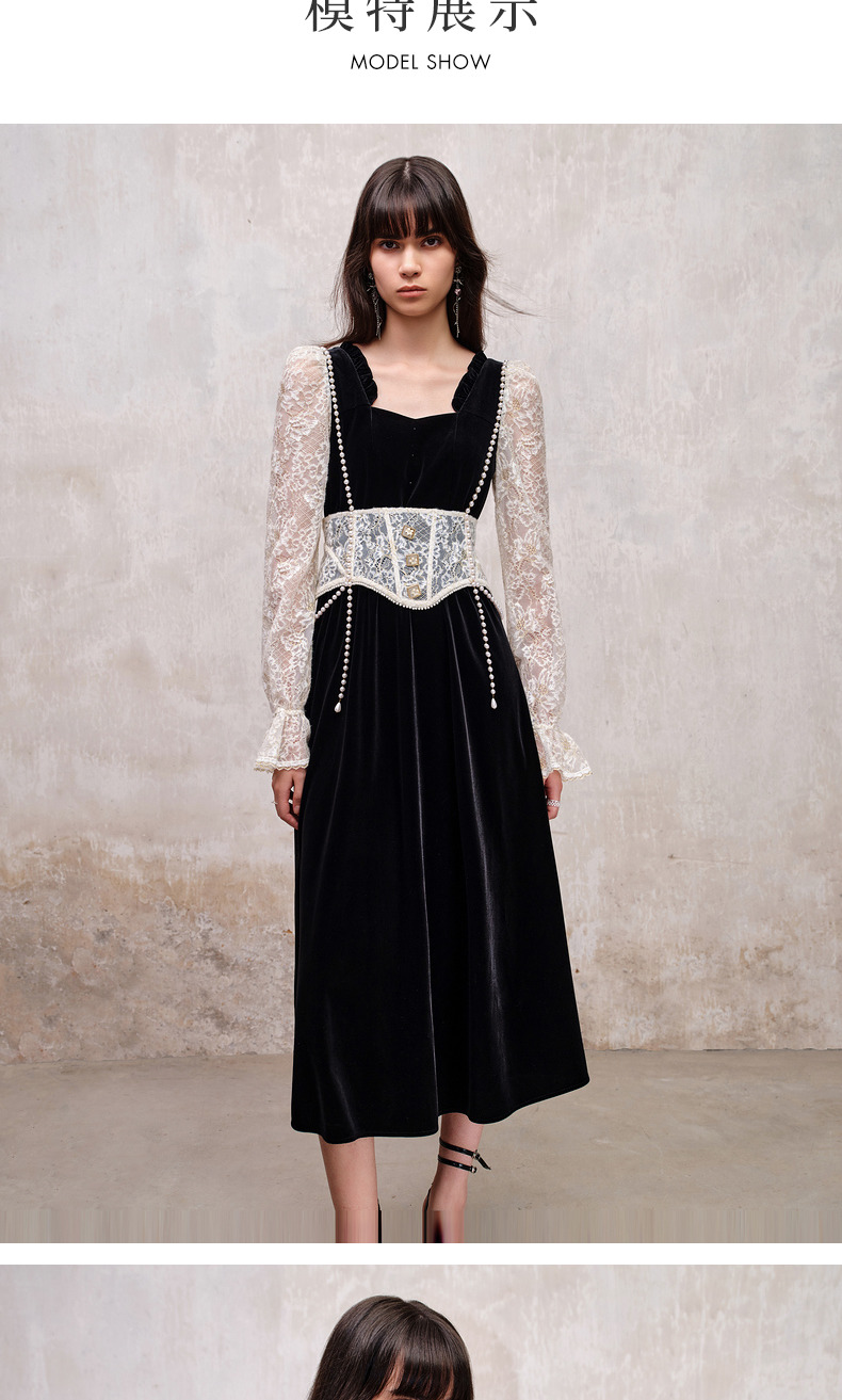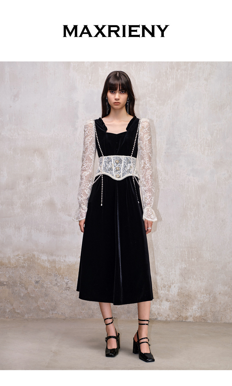 MAXRIENY法式宫廷复古风拼接蕾丝丝绒连衣裙(货号:MS88DR507)