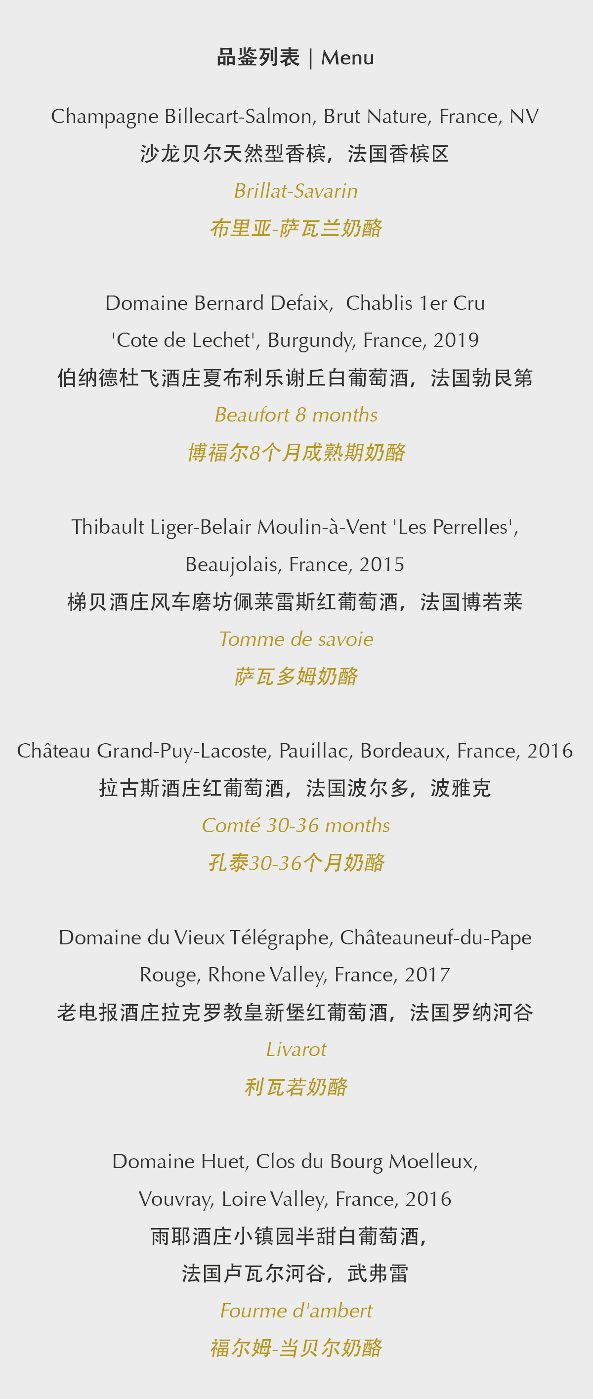 在以往无数次的品鉴会中我们可能都会听过“奶酪”是葡萄酒的绝佳拍档,那么问题来了,单单在法国就有300多种奶酪,全世界的葡萄酒也有上千种之多,如何在“300”与“上千”的搭配中完成进阶,化身餐桌上的灵魂人物呢?答案就在这次品鉴会,精选了六款代表性的高品质法国奶酪(法国奶酪同样有AOC分级哦)与六款经典的萄萄酒。