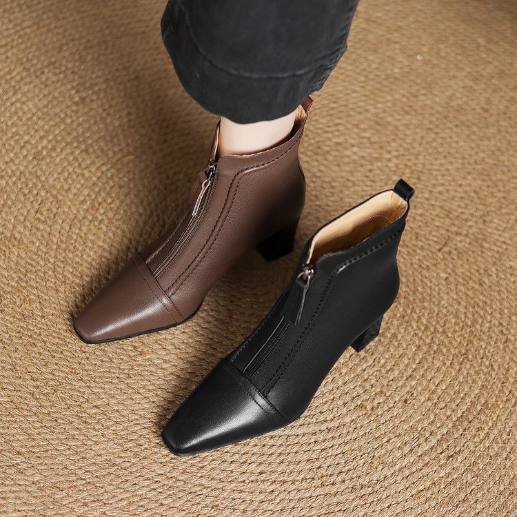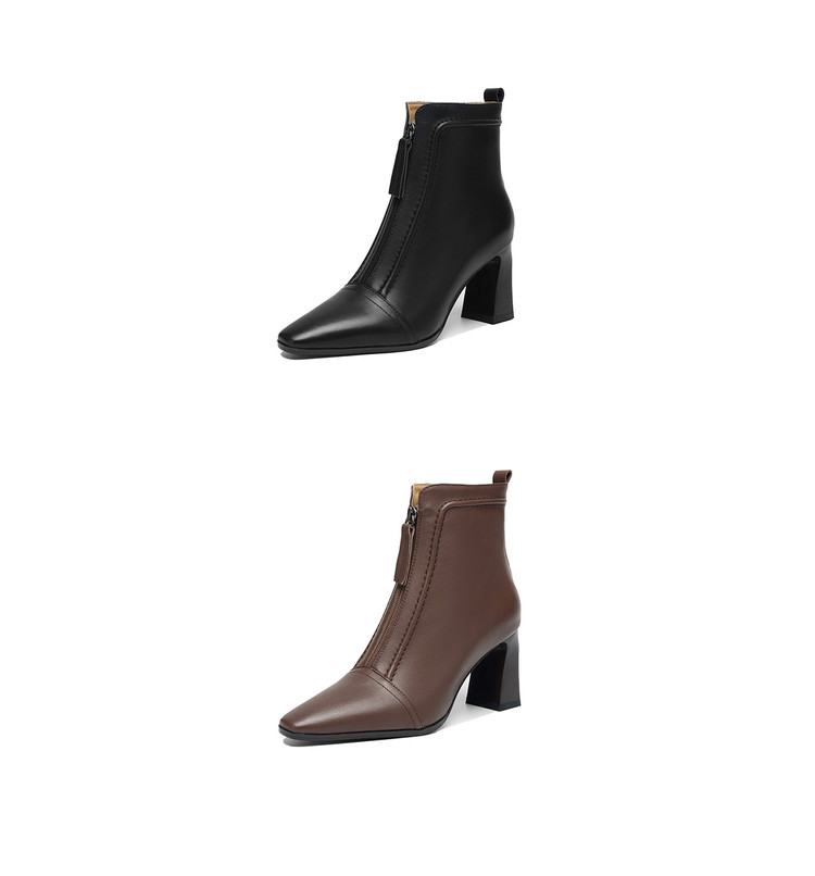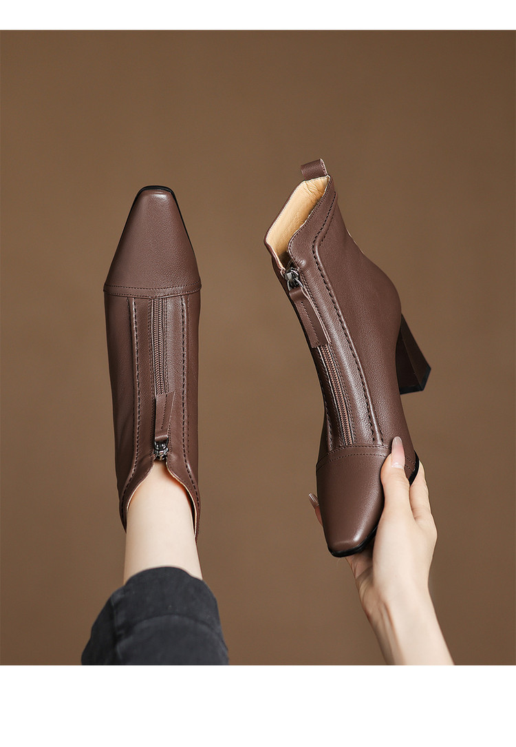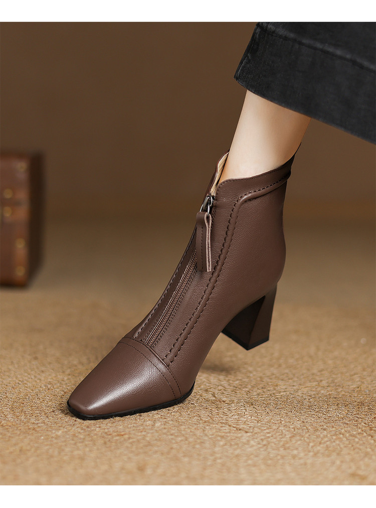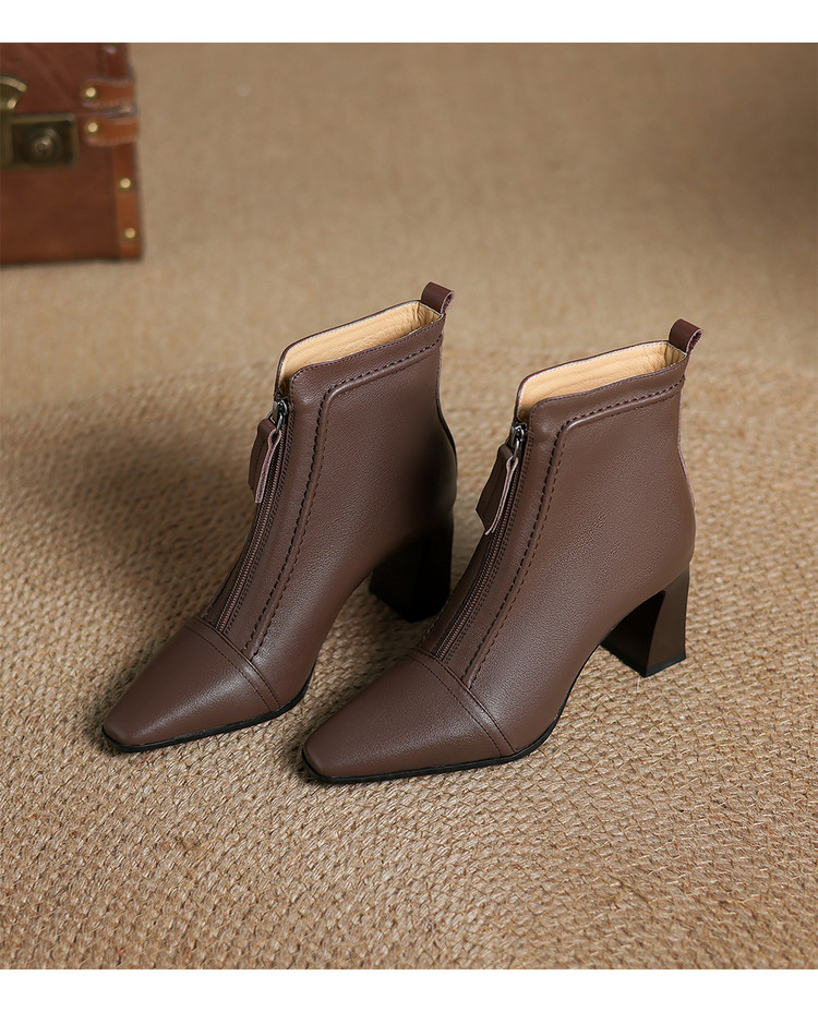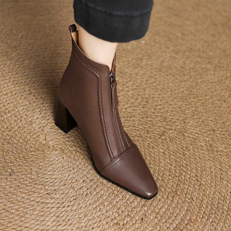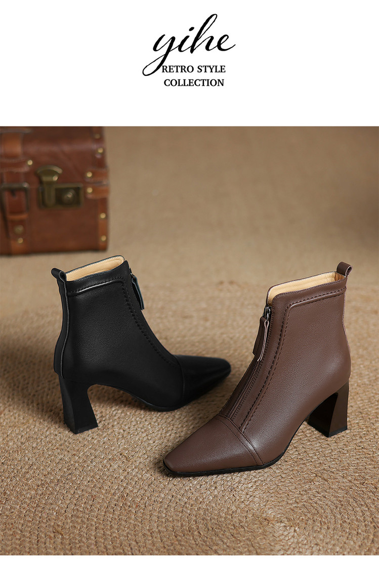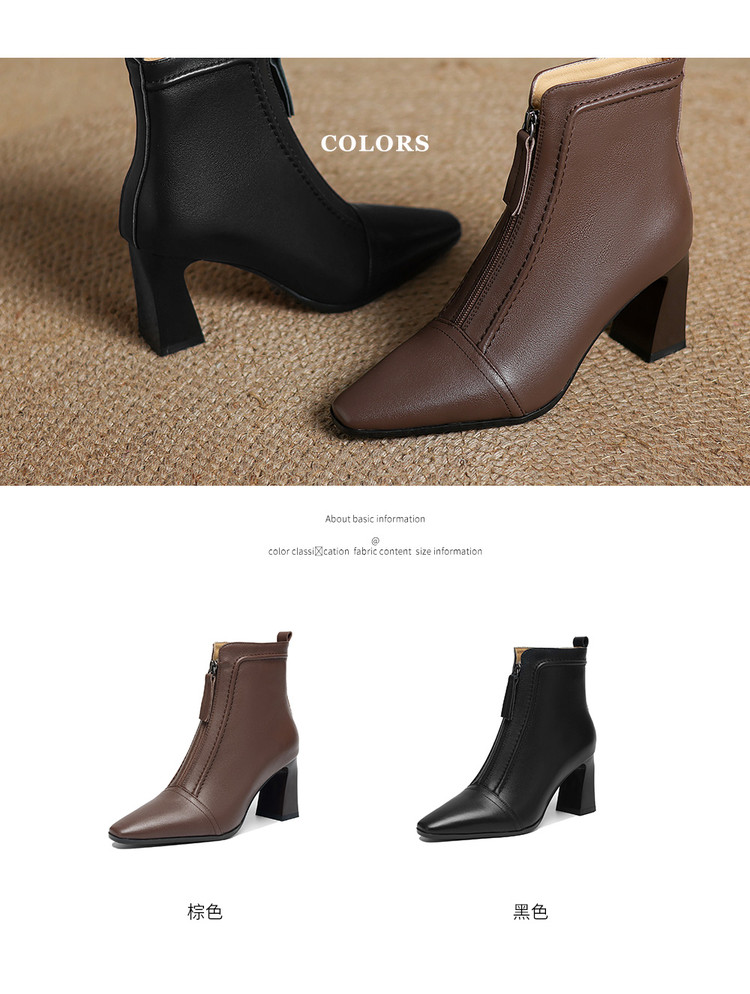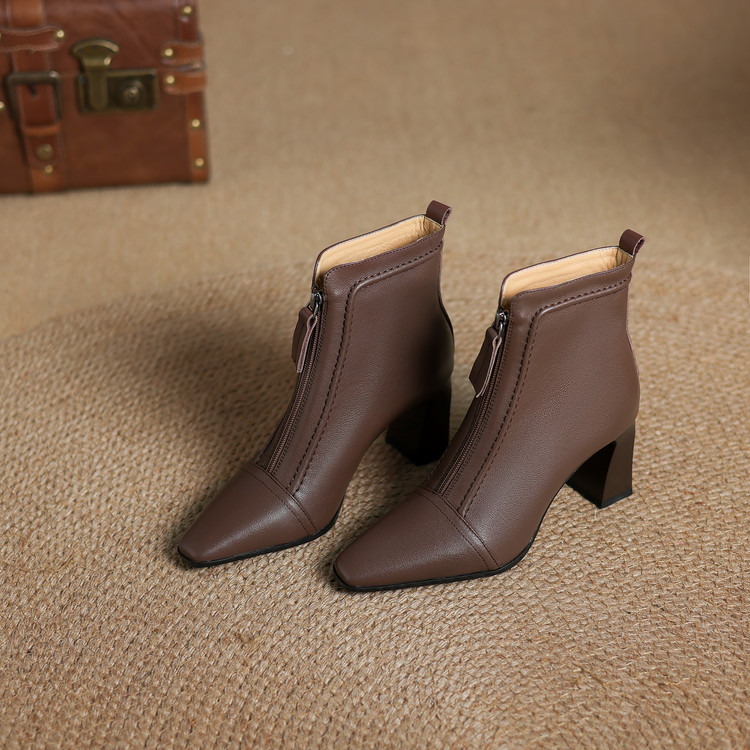 【预售5天】秋冬气质高跟前拉链棕色短靴女新款复古真皮方头粗跟百搭马丁靴DS&1902