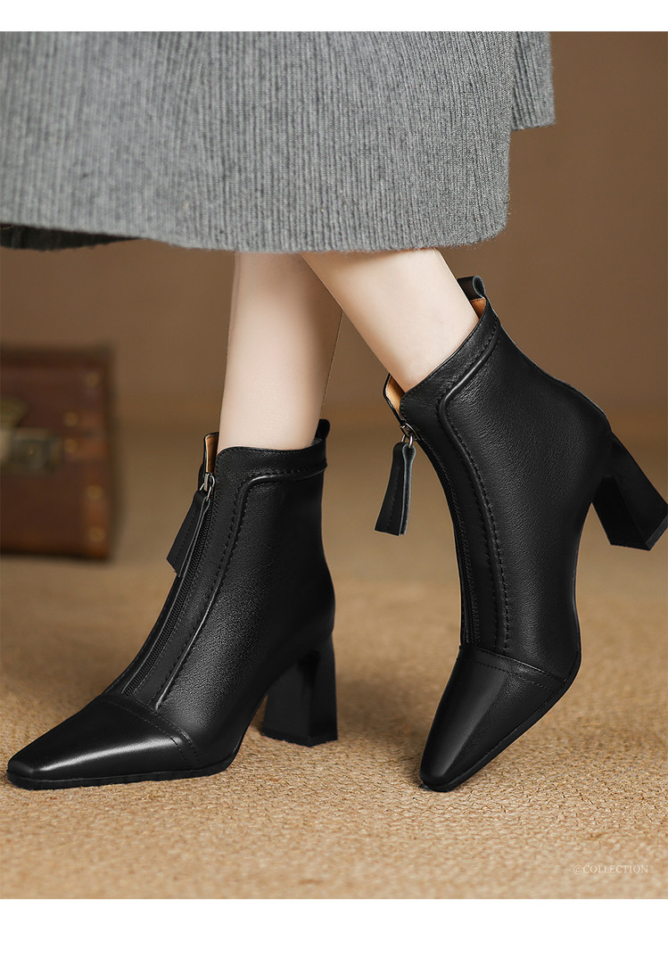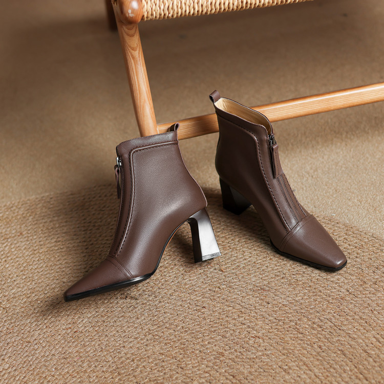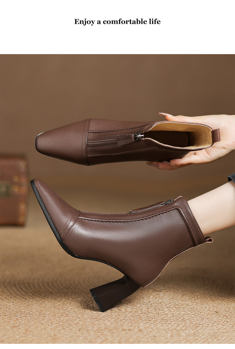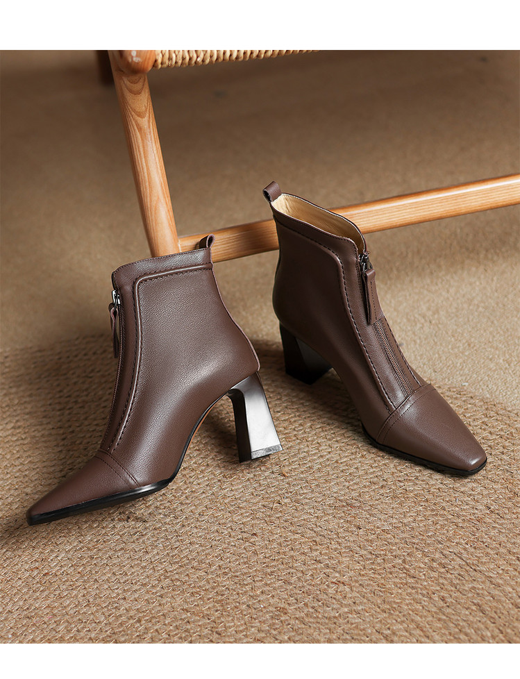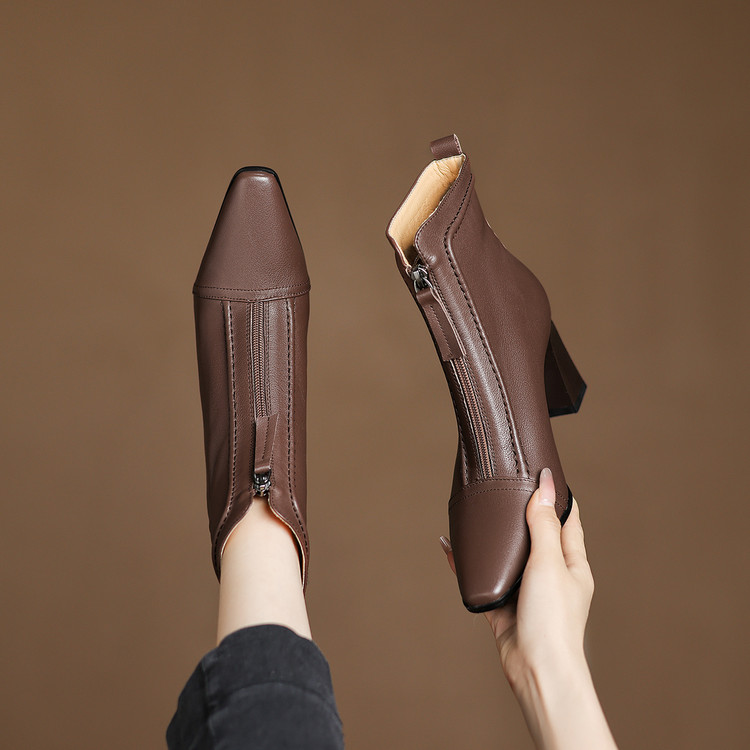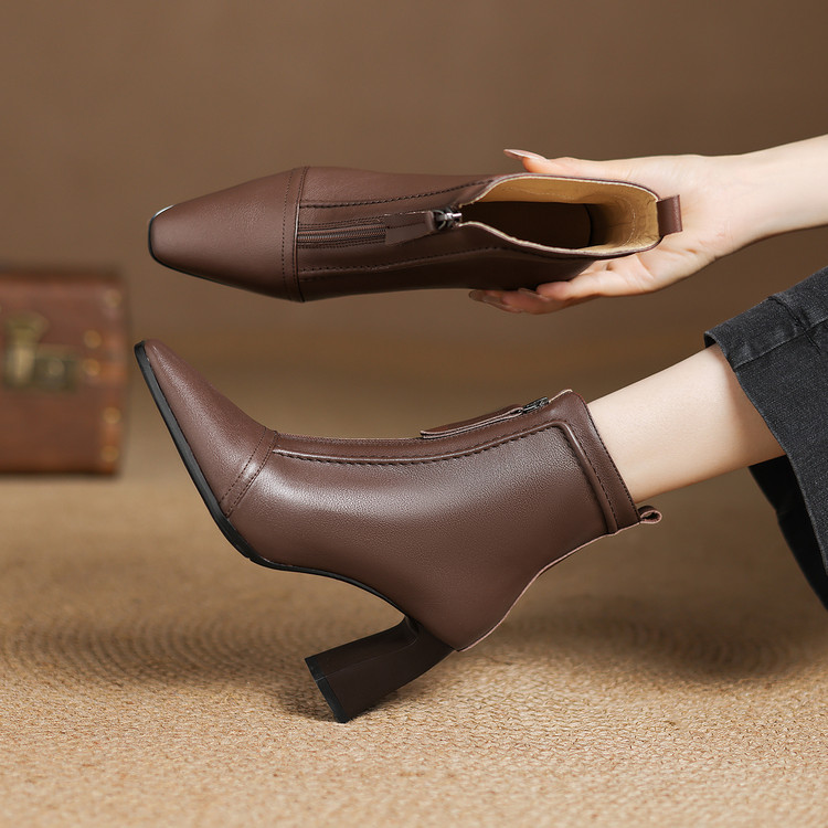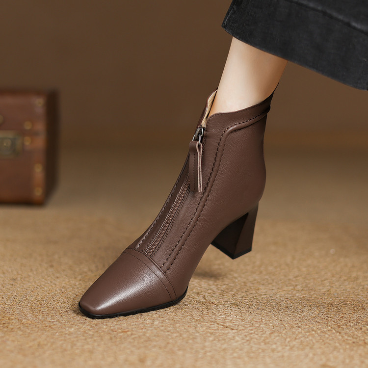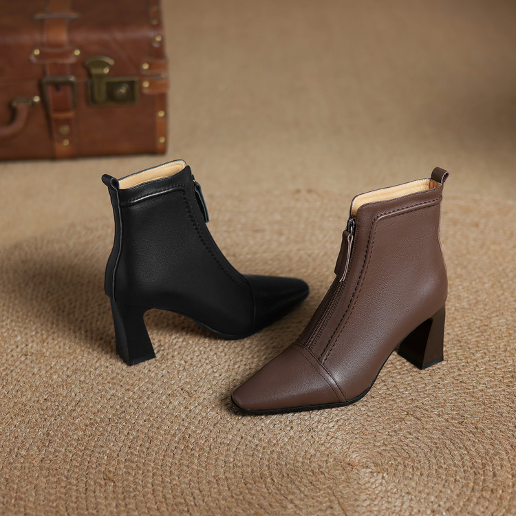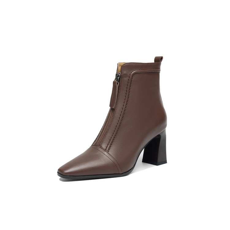 【预售5天】秋冬气质高跟前拉链棕色短靴女新款复古真皮方头粗跟百搭马丁靴DS&1902