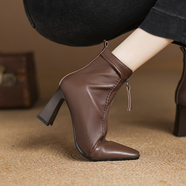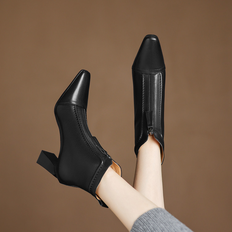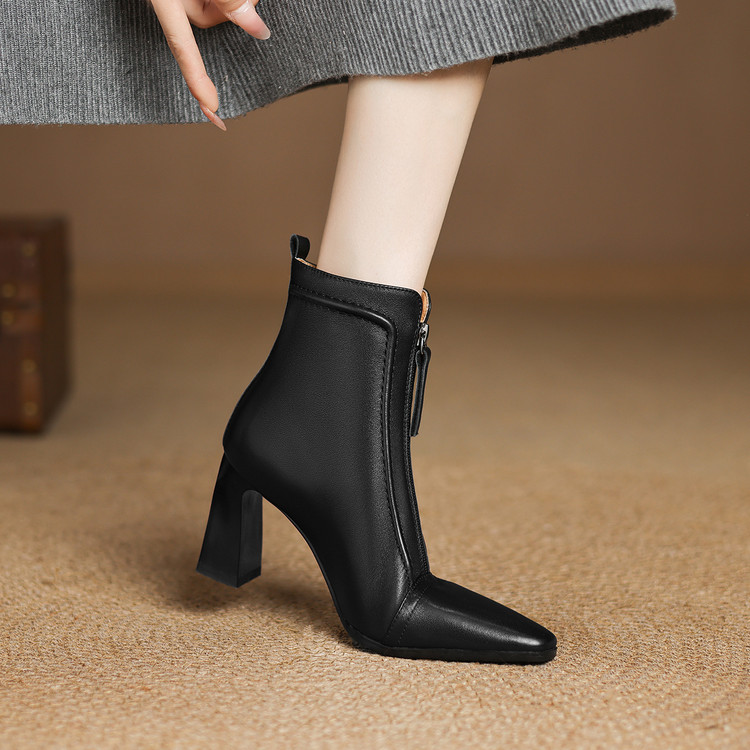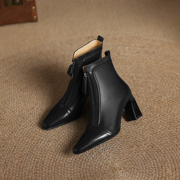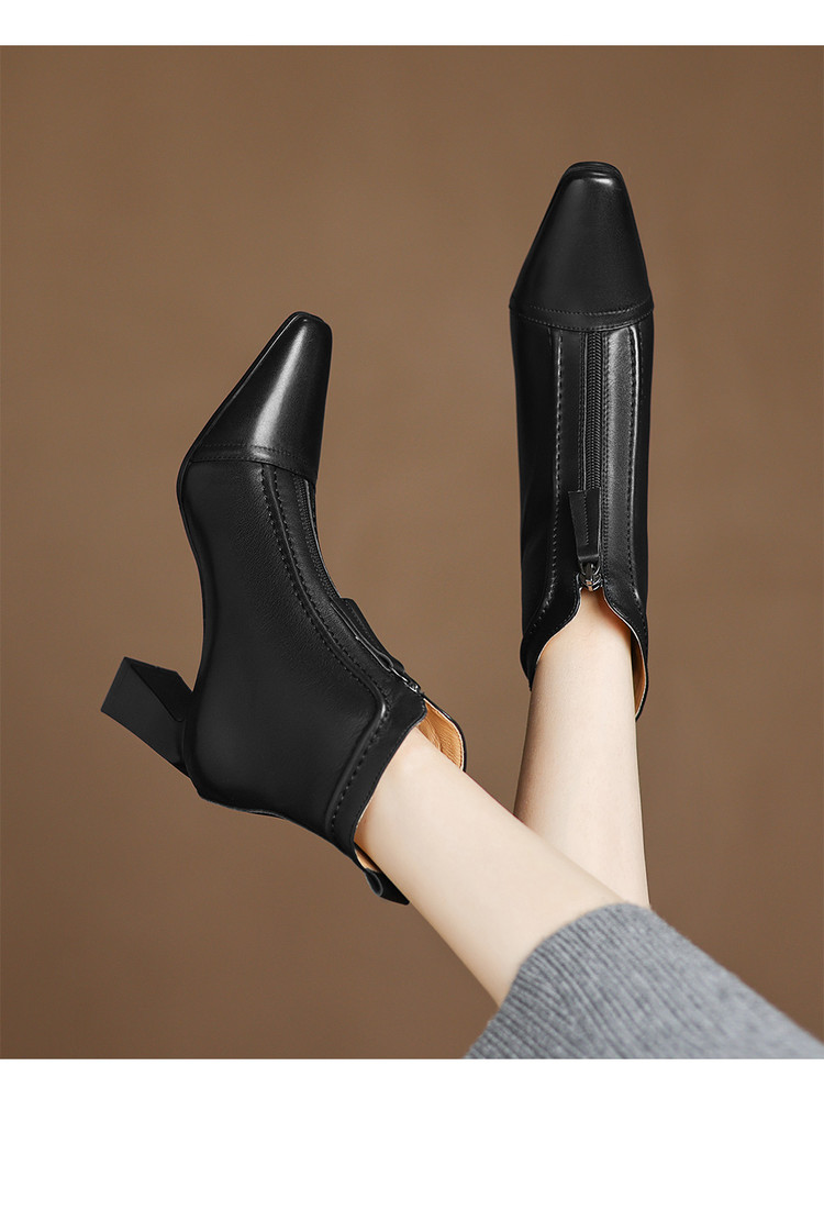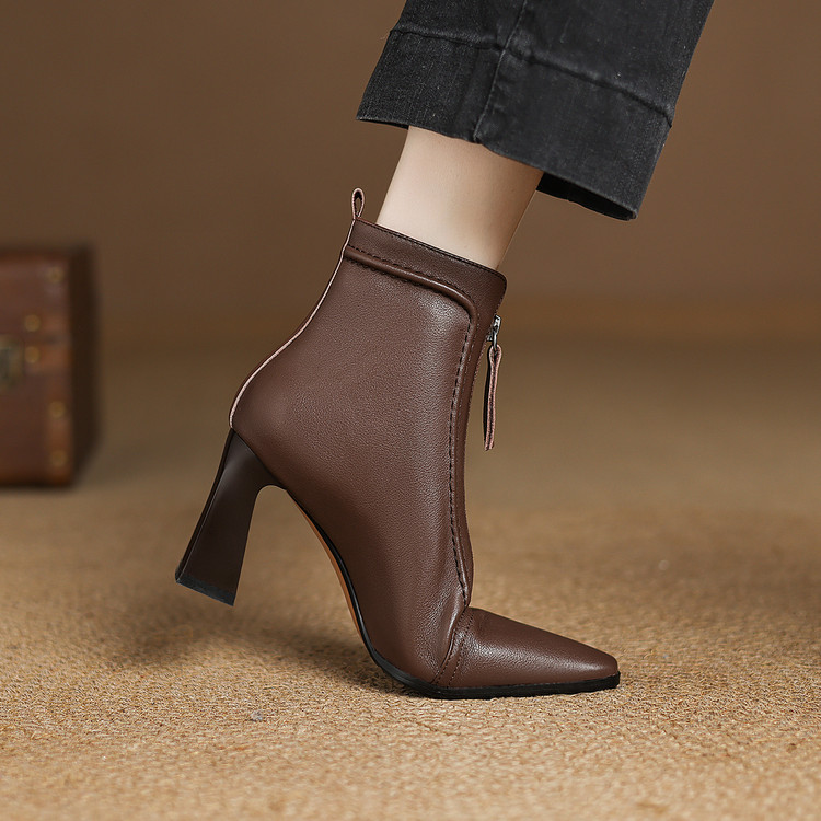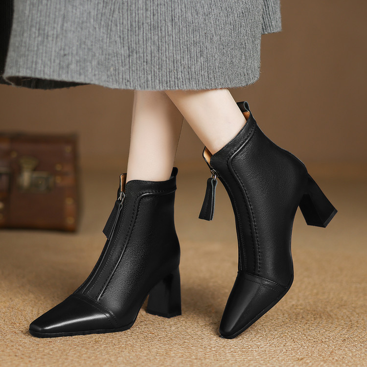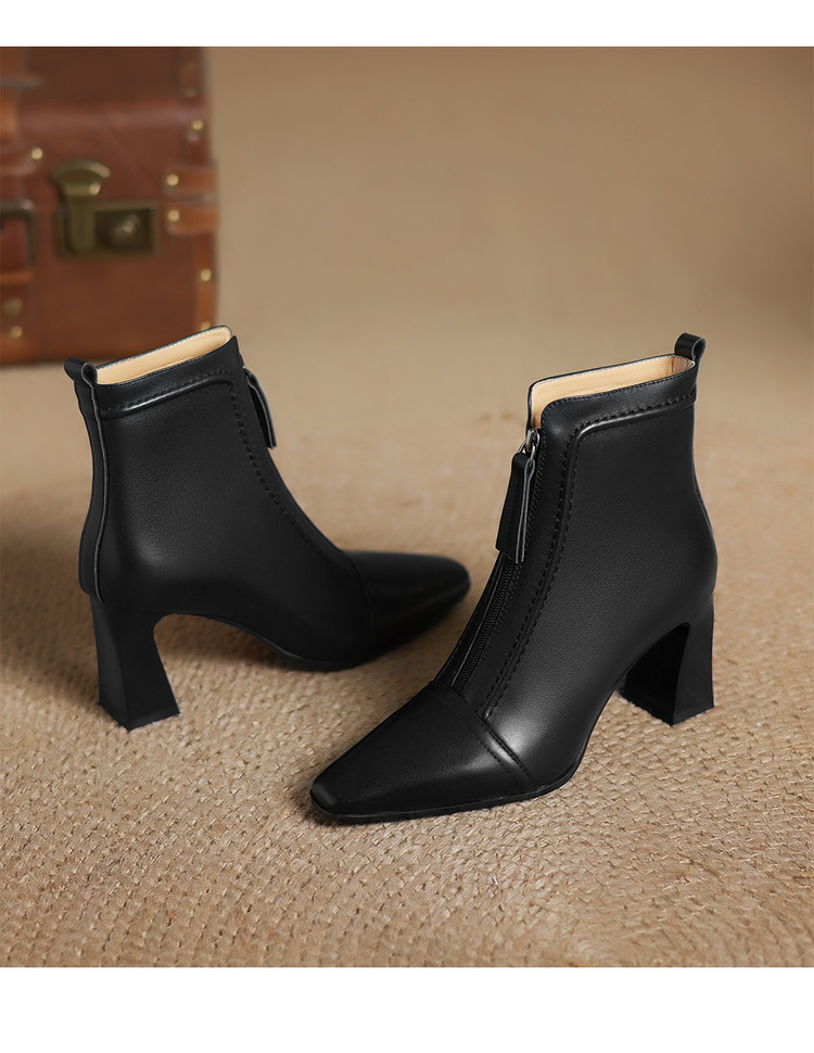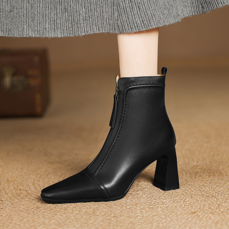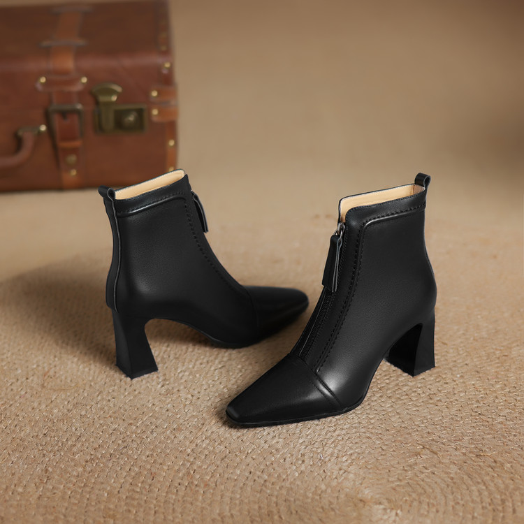 【预售5天】秋冬气质高跟前拉链棕色短靴女新款复古真皮方头粗跟百搭马丁靴DS&1902