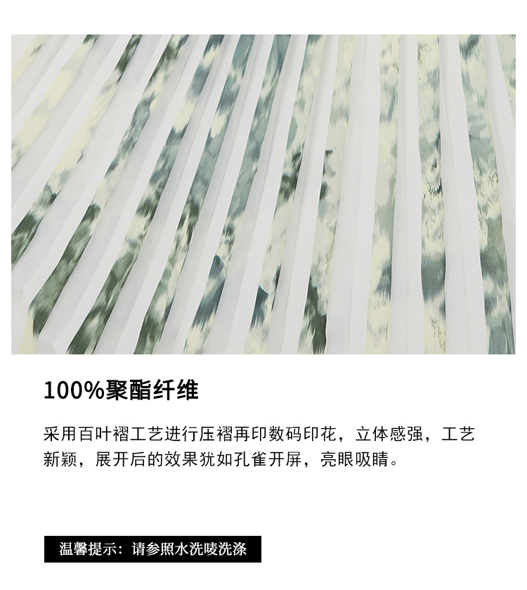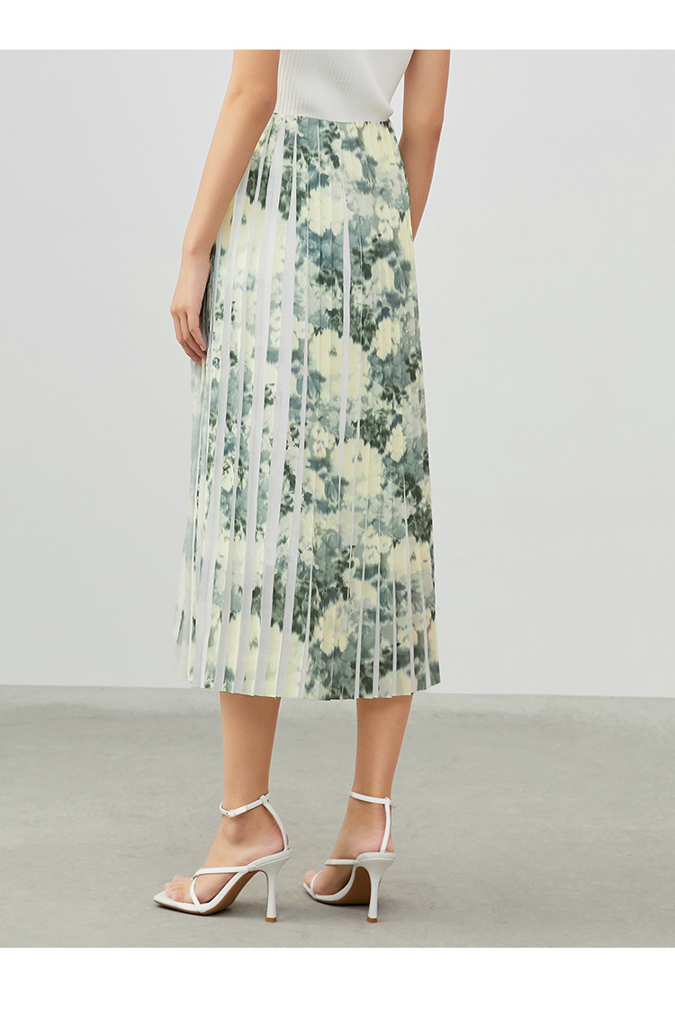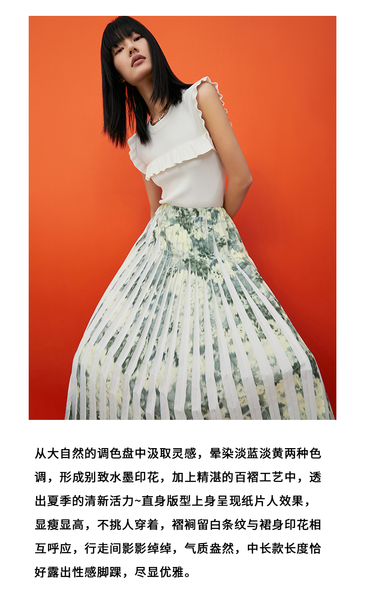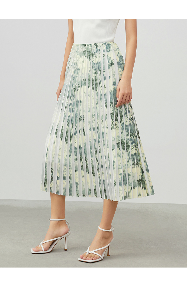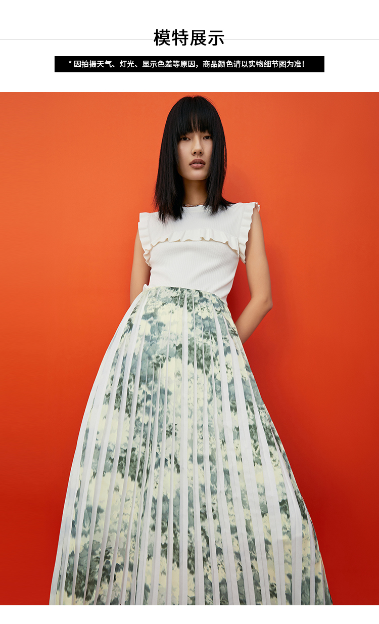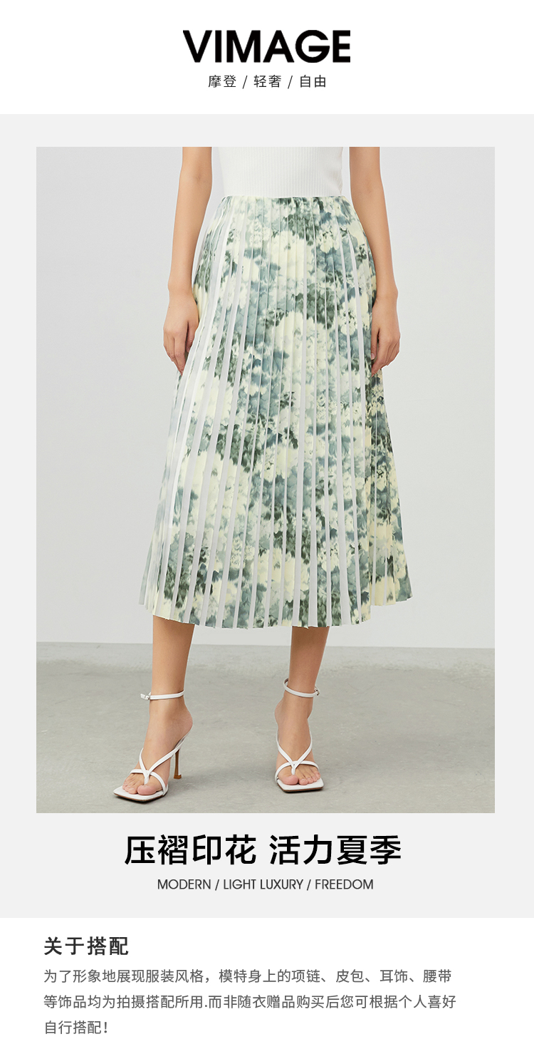 VIMAGE纬漫纪夏季新款印花百褶A字裙过膝半身裙女V1706320