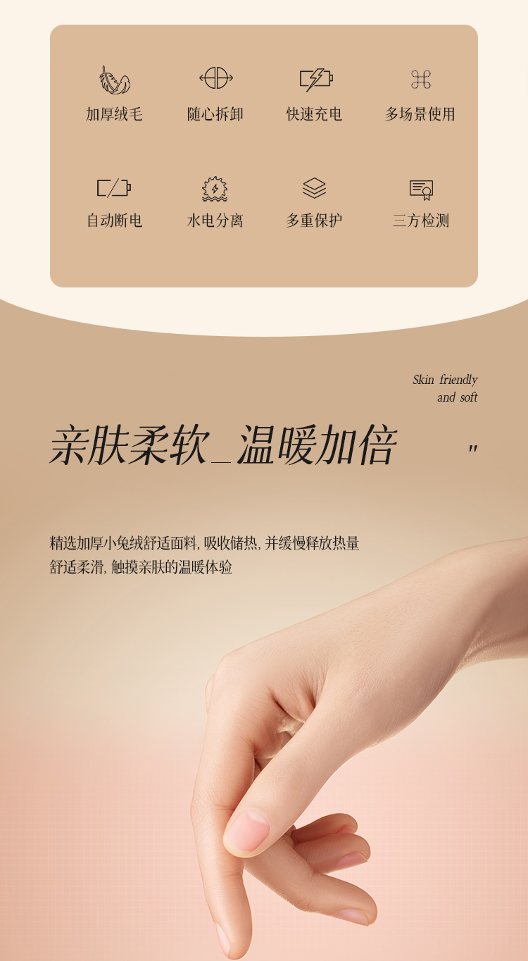 仿兔毛绒亲肤柔软,可伸手进内层,含绒毛更保暖,绒毛外套可拆卸,方便清洗