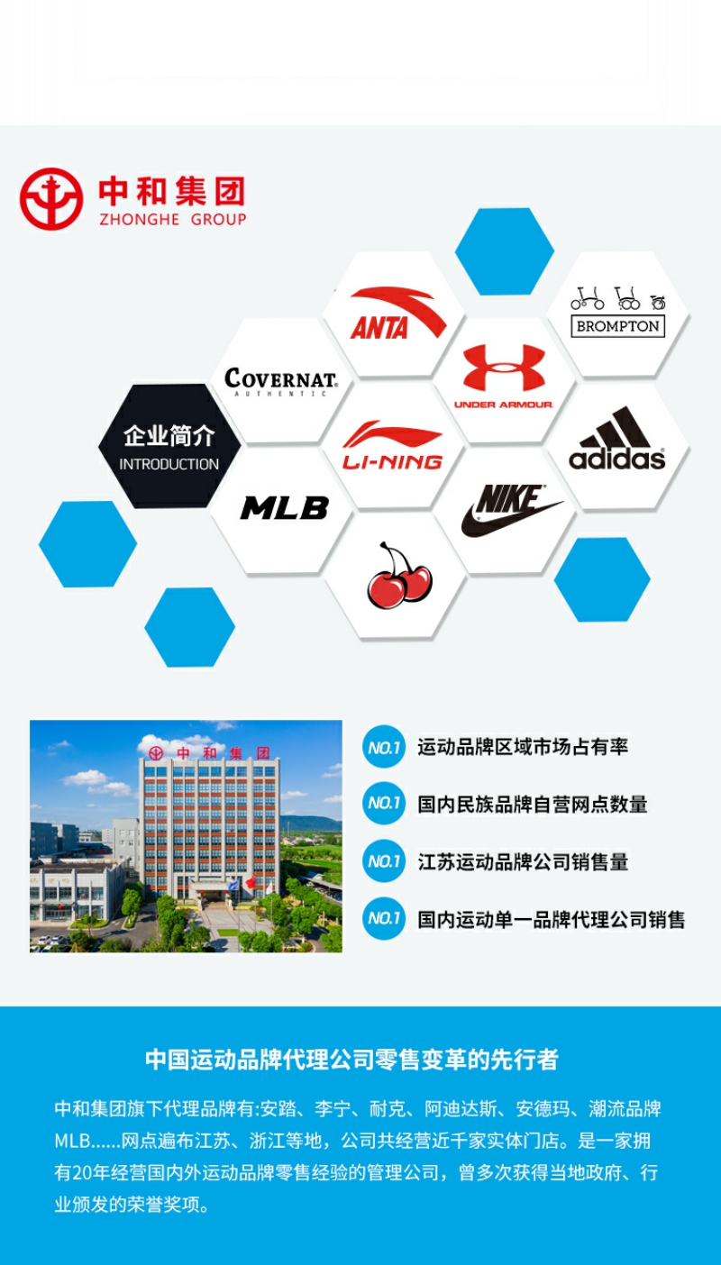- 中和集团旗下代理安踏、李宁、耐克、安德玛、耐克、中国李宁、MIB等运动时尚品牌,网点遍布江苏、浙江、湖北等身份