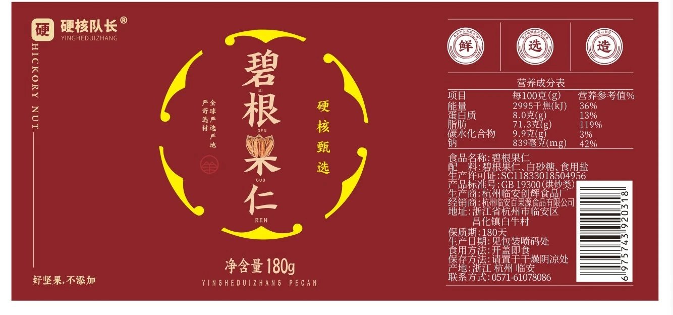 【名称】碧根果仁 【快递】:申通 中通(不接受指定快递) 【发货地/产地】:浙江 杭州 临安 【加运费地区】:宁夏 内蒙古 青海 +6 【不发货地区】:新疆 西藏 【生产日期/保质期】:发货日20天内 【发货时效】:48小时内 【售后】 1.产品发出不支持无理由拒收拦截撤单改地址 2.如出现异常情况,请带面单+产品拍照+产品包装照片与我们联系,我们会第一时间处理,如产品有质量问题可在收货24小时之内,联系客服进行售后或者补发