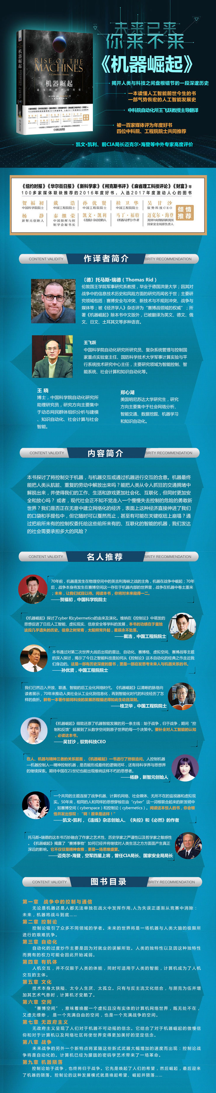每一章节都如同一扇自动玻璃门般优雅地打开……一本有思想、给人以启迪的书……一部糅合了历史学、媒介分析学、政治学、军事工程学以及语源学的著作……在《机器崛起》一书中,瑞德为我们再现了一段描述入微而又令人惊叹的控制论科学发展的历史。