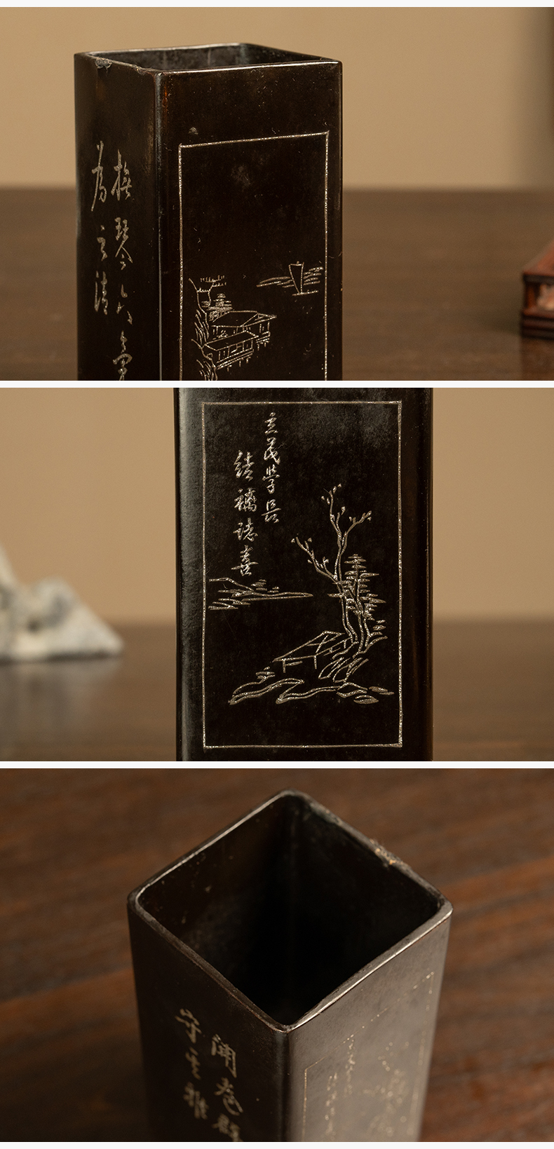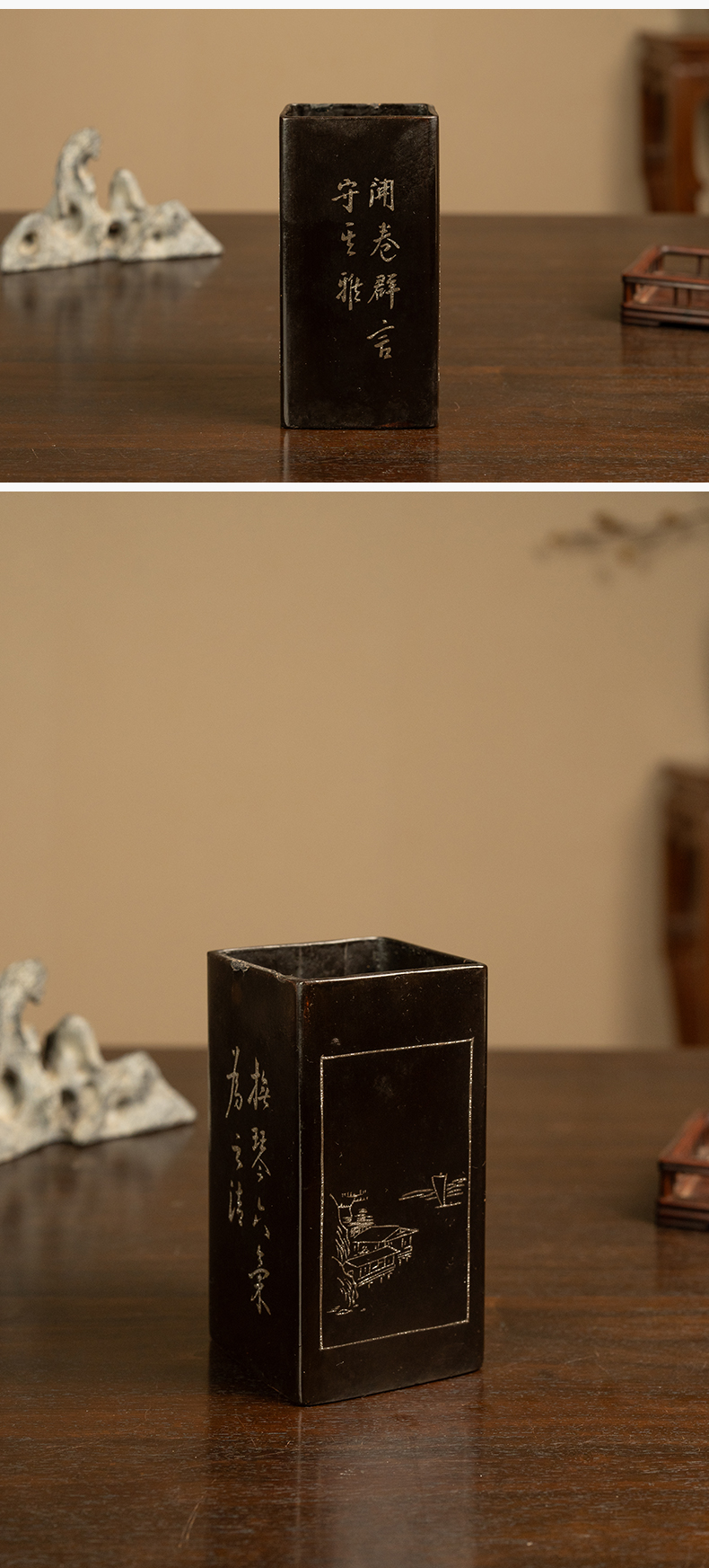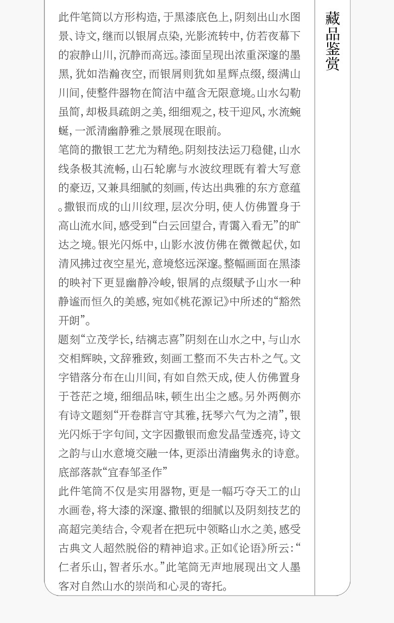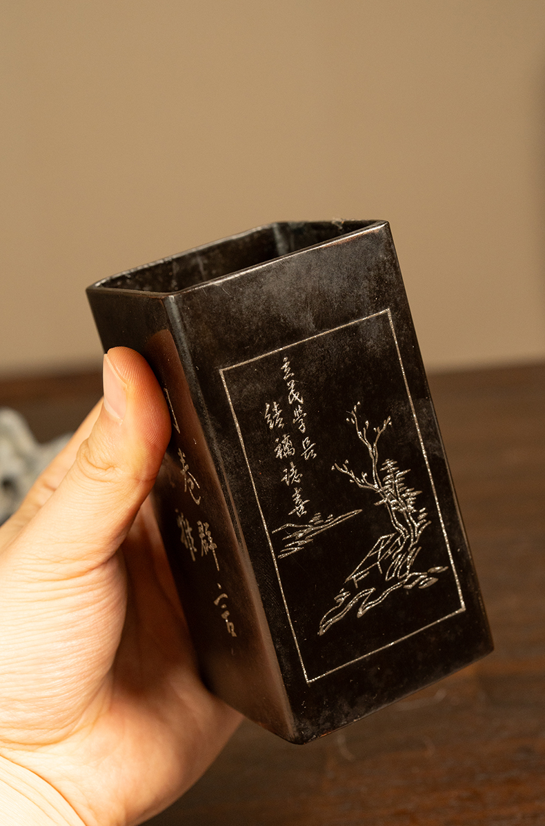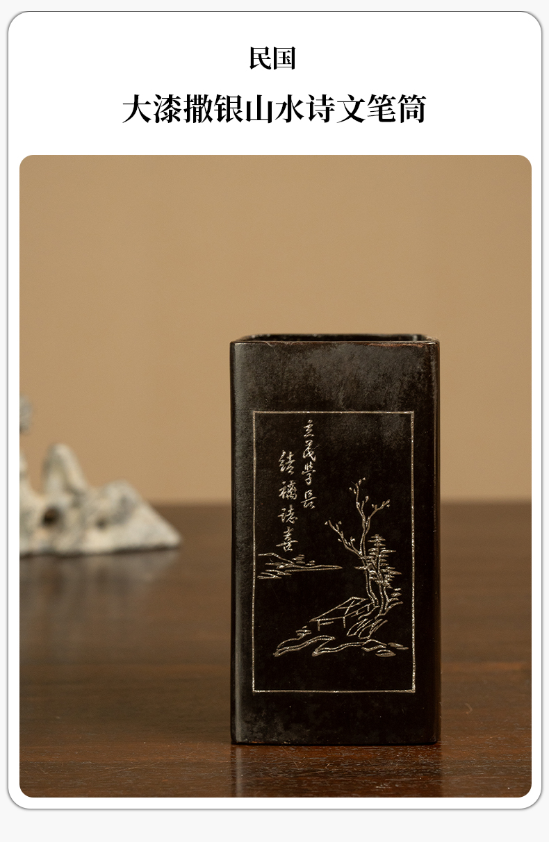 民国 大漆撒银山水诗文笔筒