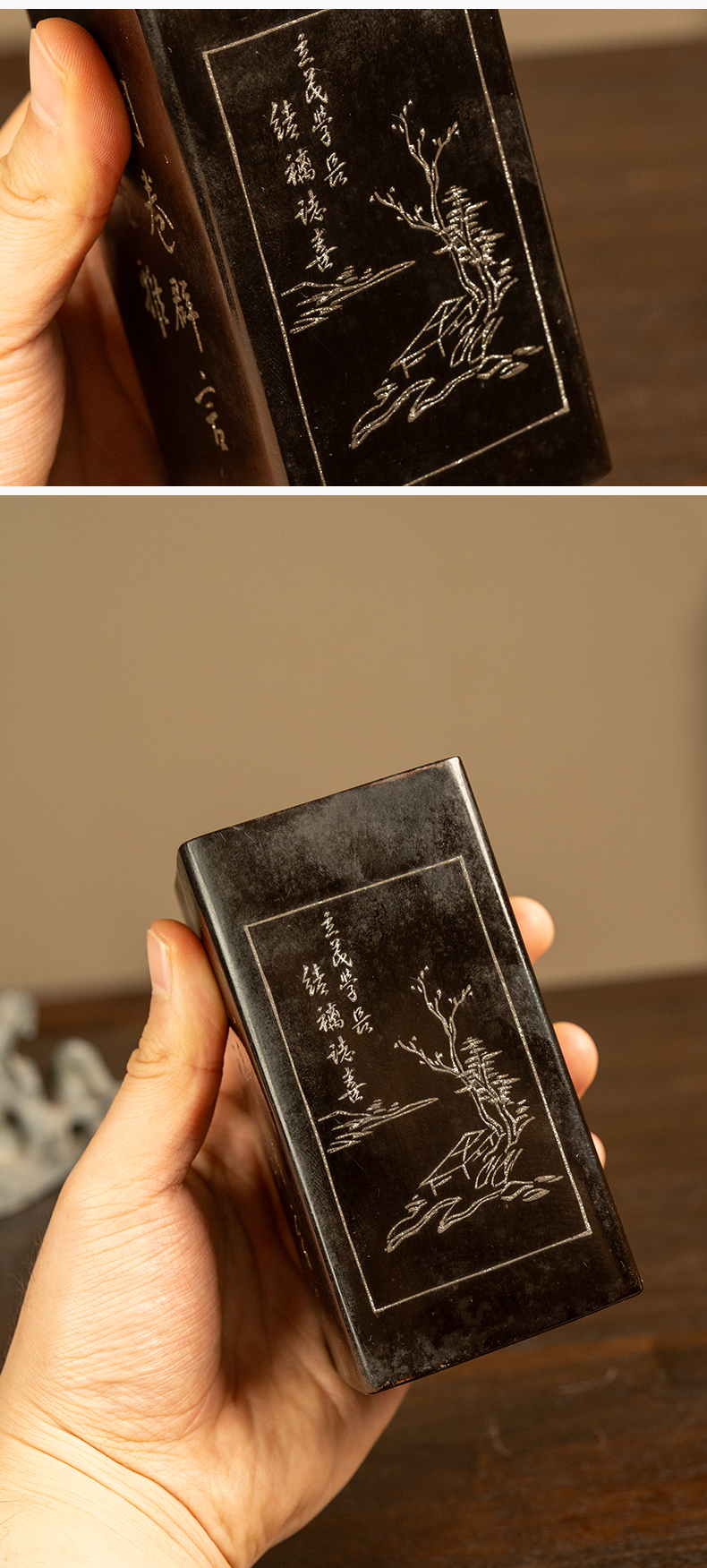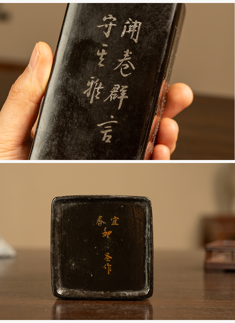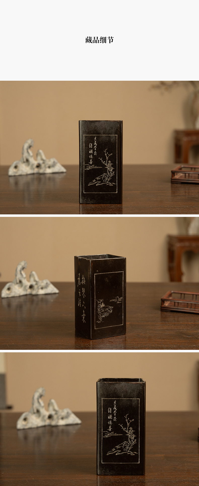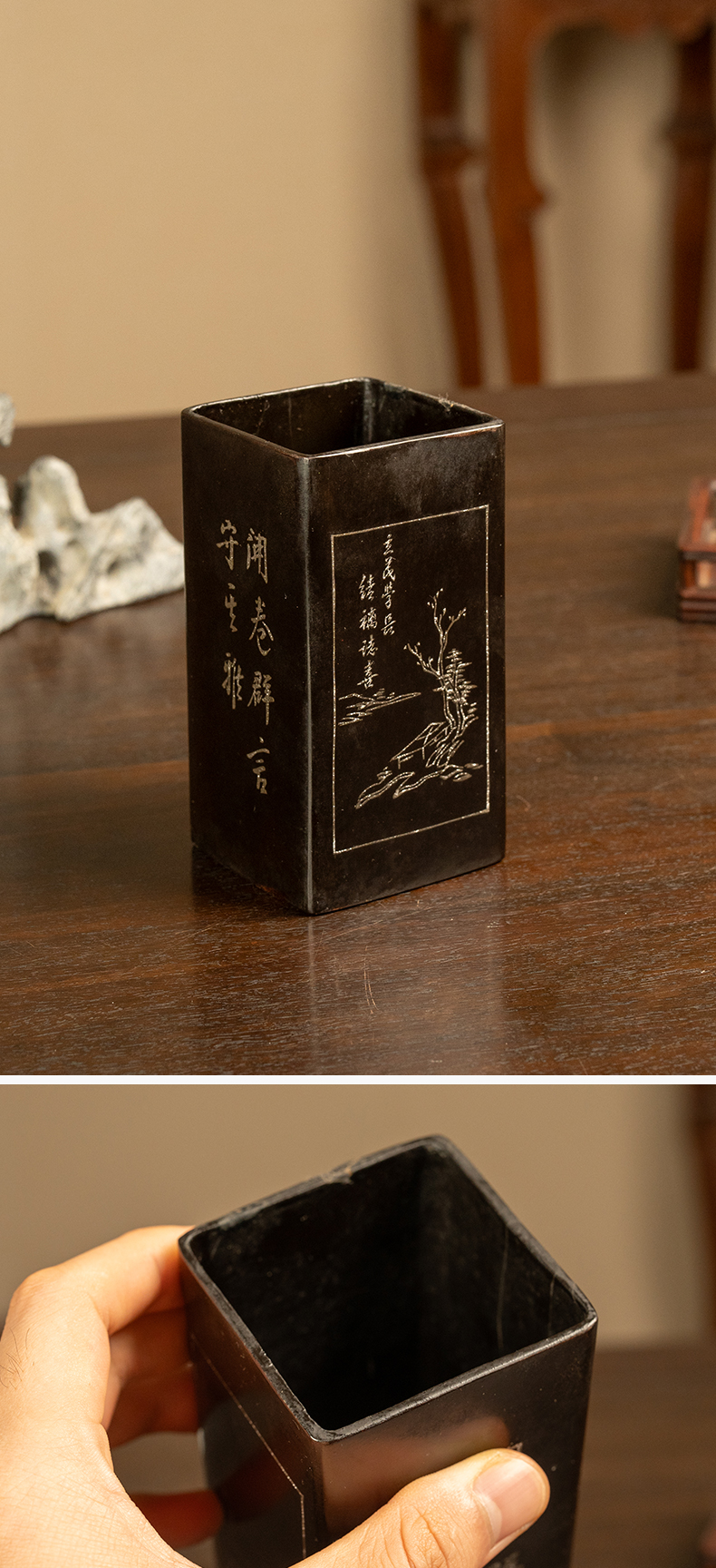 民国 大漆撒银山水诗文笔筒