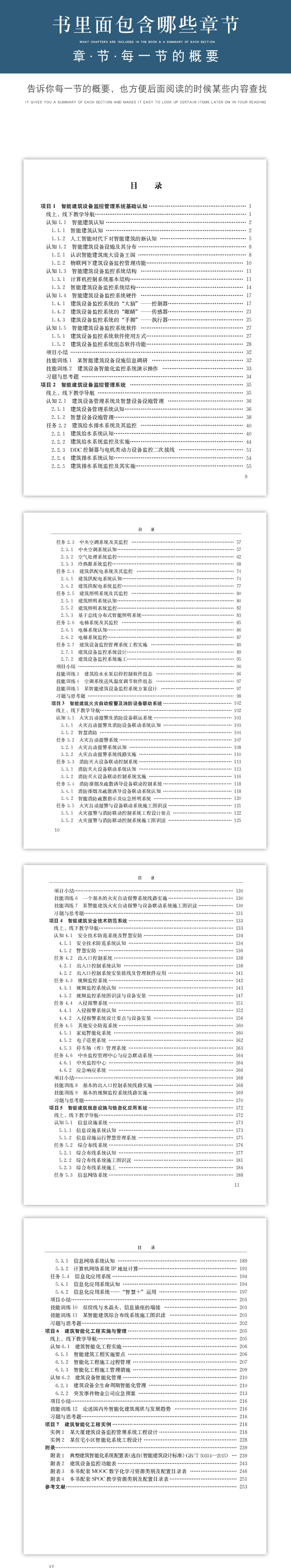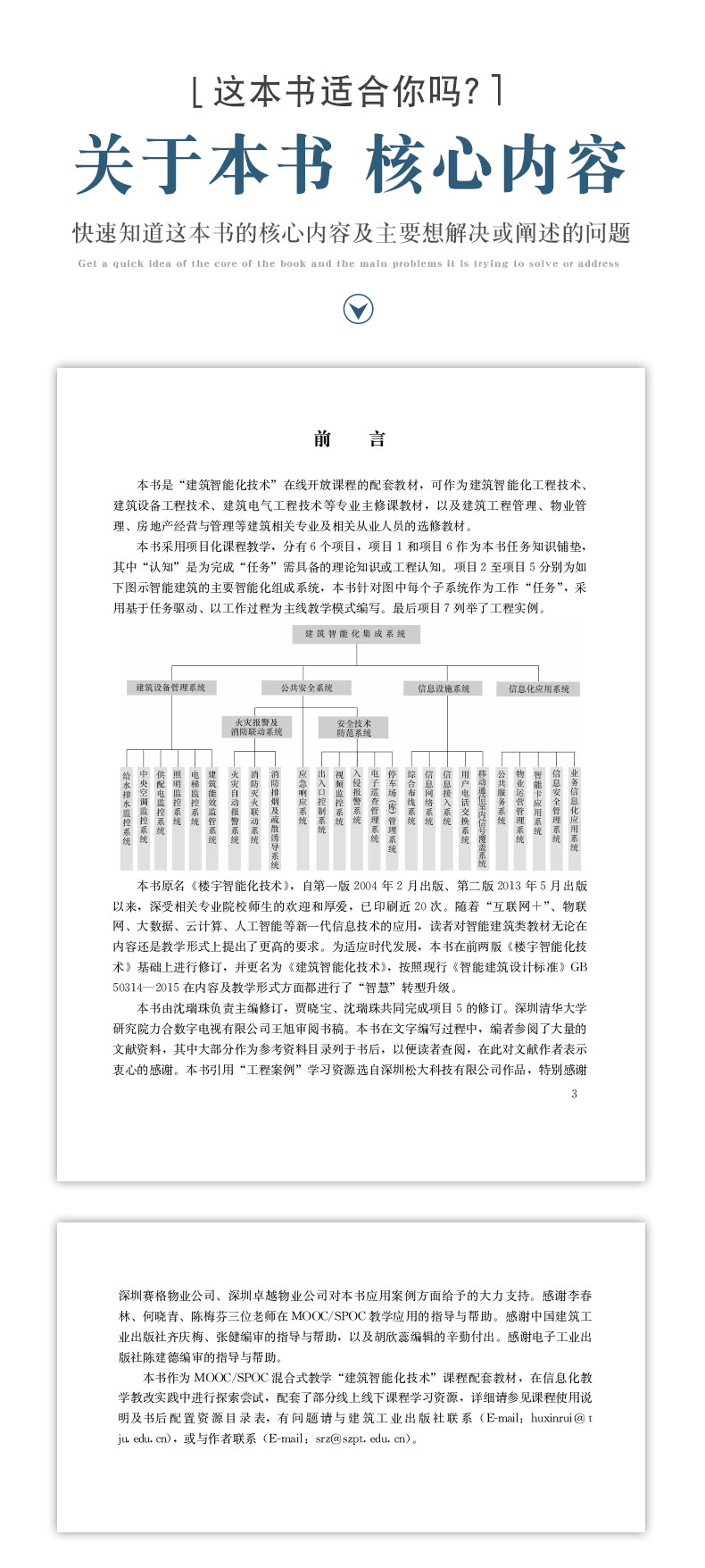 本书名称为“建筑智能化技术”,内容选取按照现行《智能建筑设计标准》GB/T50314-2006,全书共分6个单元2个附录,其中单元1是本书内容基础知识介绍,单元2至单元5分别论述智能建筑的各个智能化系统,以“任务”项目形式对每个系统从工作原理、设备组成等知识讲解,到系统的施工图识读设计、设备安装等技能操作,力求同实际工程相结合,突出职业技能的培养。单元6介绍智能化工程施工管理及建成后的运行管理,最后列举若干工程实例。