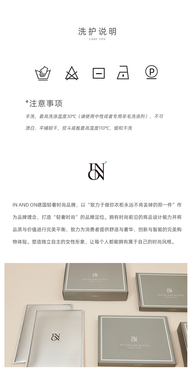 - IN AND ON—轻奢时尚品牌,以“致力于做你衣柜永远不肯丢掉的那一件”作为品牌理念,打造“轻奢时尚”的品牌定位。拥有时尚前沿的商品设计能力并将品质与价值进行完美平衡,致力为消费者提供舒适与奢华、创新与智能的完美购物体验。塑造独立自主的女性形象,让每个人都能拥有属于自己的时尚风格。