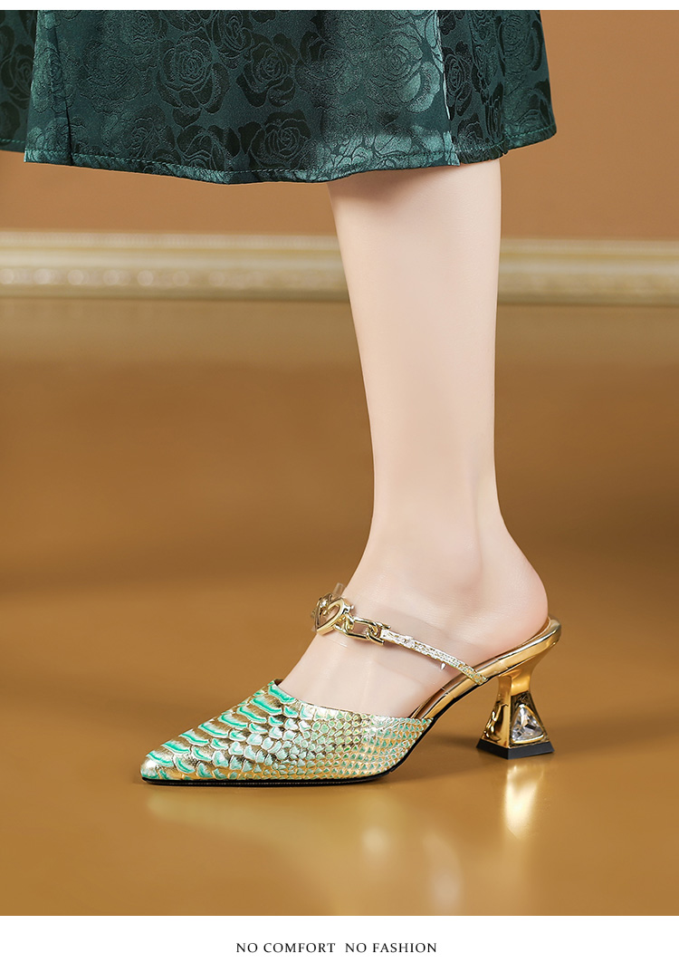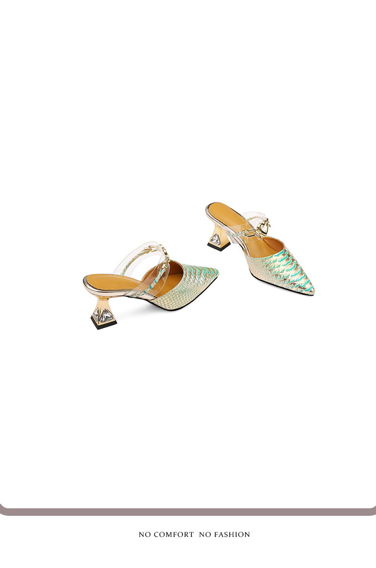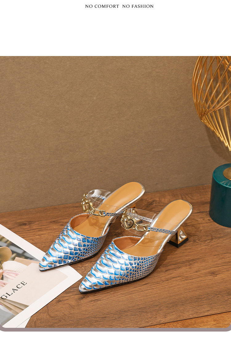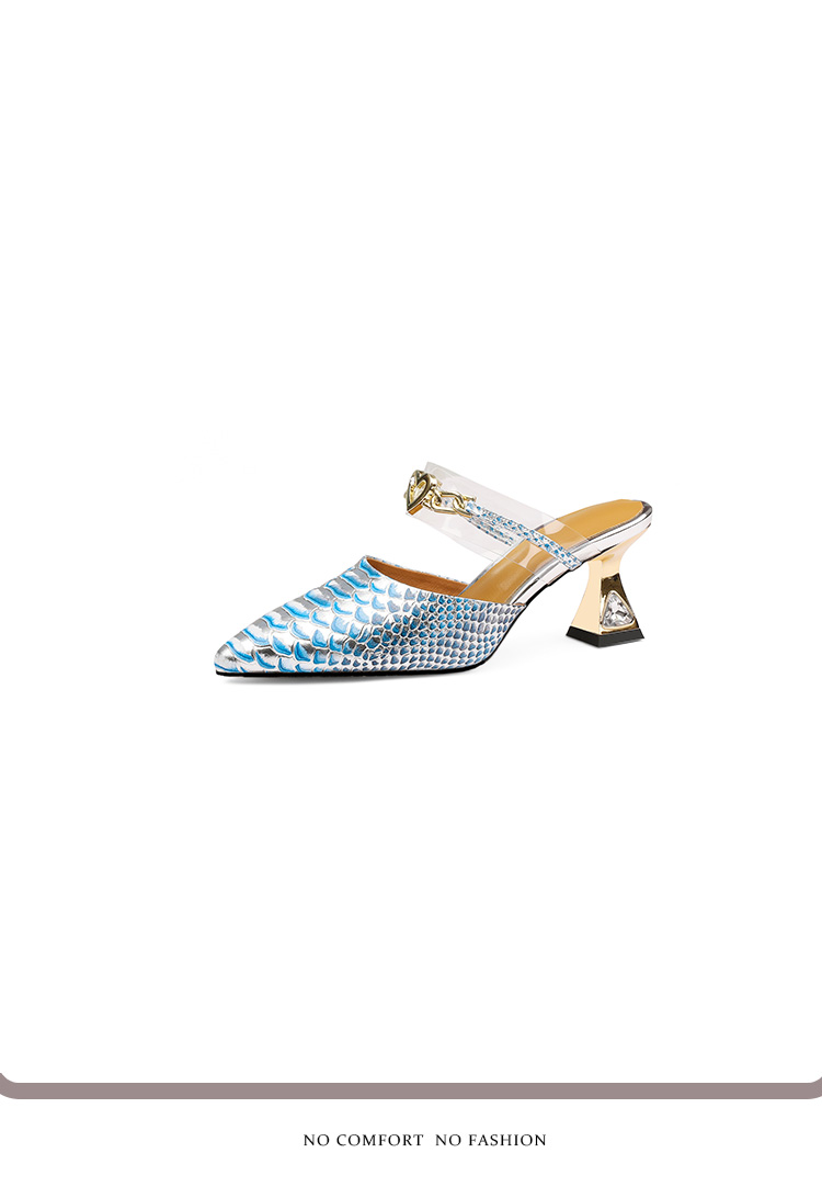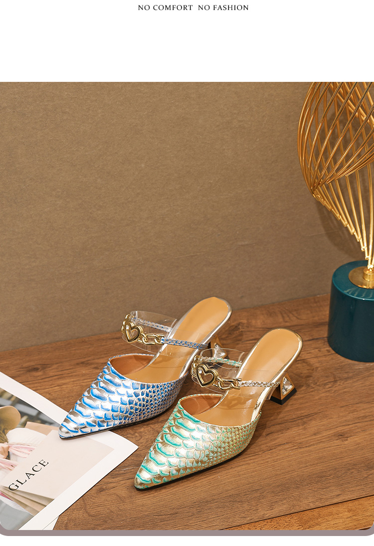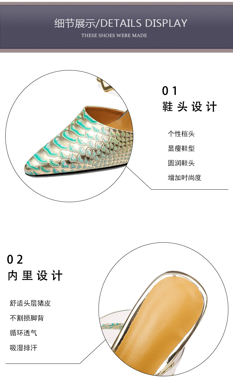 【预售5天】个性鱼皮纹,真皮高跟包头半拖鞋PLGZ&B1951