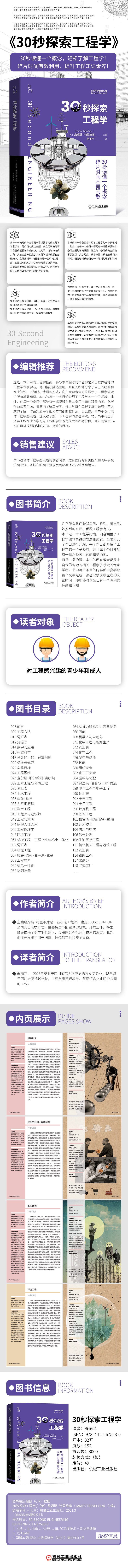 《30 秒探索工程学》一书是一本工程学指南,内容涵盖了工程学领域关键的发展和成就。从创建文明和所有必要的基础设施,到充分利用大自然的力量以充分发挥我们人类的优势,再到构建全新的、可持续发展的未来,工程学始终处在人类社会变革的最前沿。参与本书编写工作的作者,都是来自世界各地的工程学专家学者,他们精心挑选主题,并且无私地分享了自己的经验和专业知识,最终以简明、清晰的方式,向广大读者全方位展示了工程学领域的所有基础知识。本书的每一个条目都介绍了工程学的一个子领域,此外,在每一个条目中都配有一幅能够反映本条目主题的精美插图。具体来说,本书共有 50 个条目,每个条目中,“3 秒概览”是核心要点,该部分以一两句话来点明主题;“30 秒速读”是条目的主要段落,以数百字来简要阐述与主题相关的内容;至于“3 分钟拓展阅读”则是更进一步,这部分内容增加了本主题的趣味性。此外,本书每一个条目都辅以“3 秒微传记”这个部分,以简要介绍本领域内备受尊敬的二三名伟大的工程师,希望能够用他们的经历来照亮所有工程师的未来。总地来说,本书首先概述了工程师的工作内容、所做出的贡献以及工程学所有子领域都通用的思想、知识和技术,随后深度揭示了工程学及相关的成就和发展目标,帮助广大读者深入了解土木工程和环境工程的起源及其未来的发展方向;机械工程、工程材料、机电一体化所涉及的运动和能量;能源工程所涉及的如何比较、选择、利用能源;由电气工程展望自动化、装备以及未来运输的全貌。在最后一个章节中,笔者着重介绍了工程师所面临的巨大挑战,因为从古至今,他们始终肩负着“为人类建设一个更加美好未来”的伟大使命