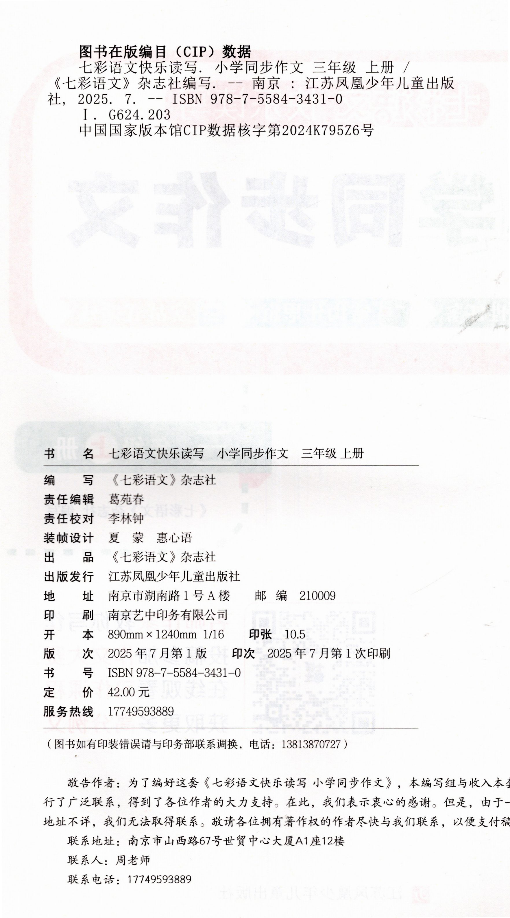 25年 七彩语文快乐读写 小学同步作文阅读与写话 123年级上册任选 情境任务素材积累读写 配二维码朗读音频讲解视频