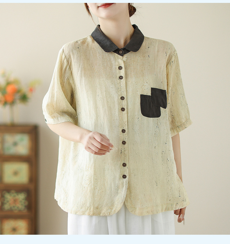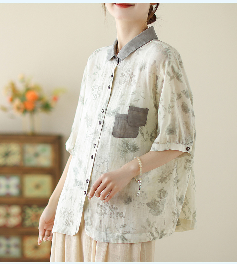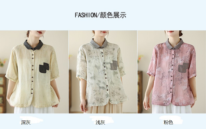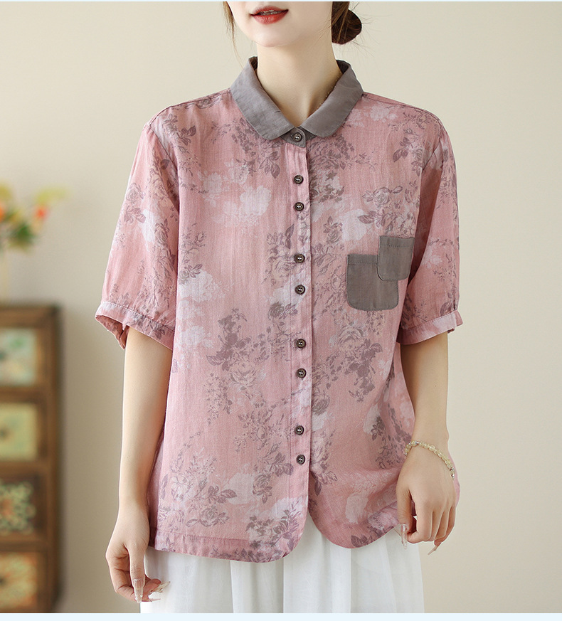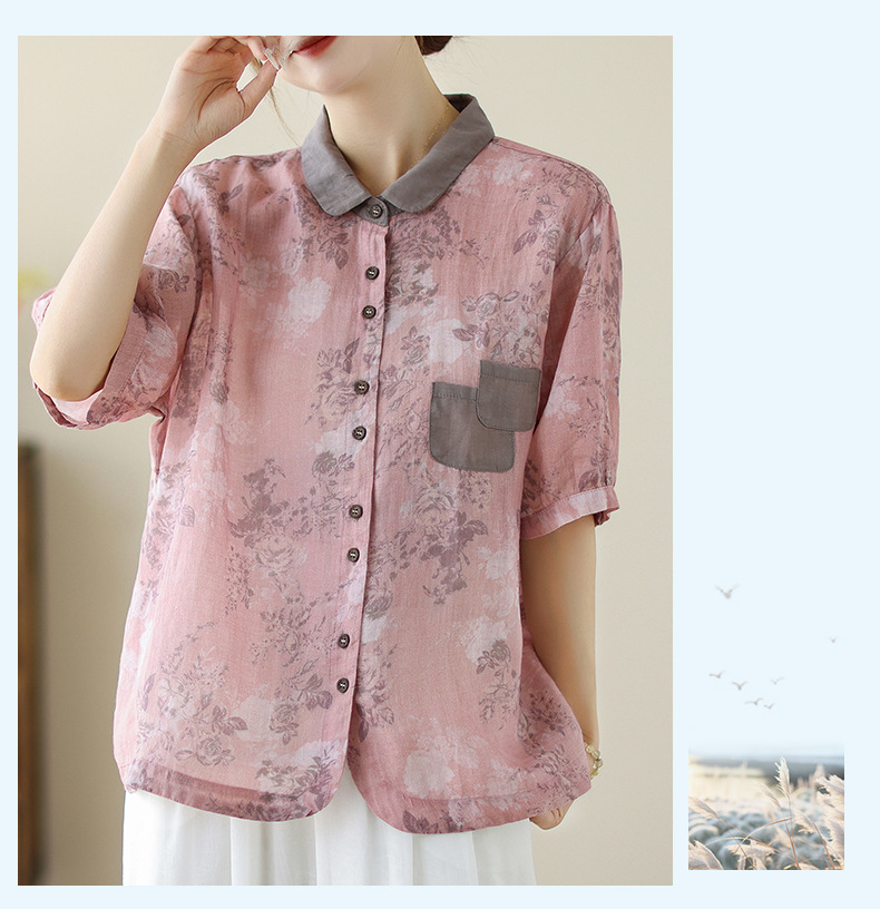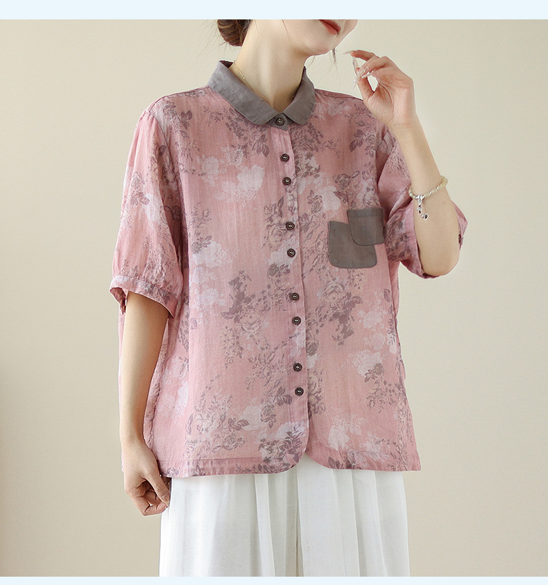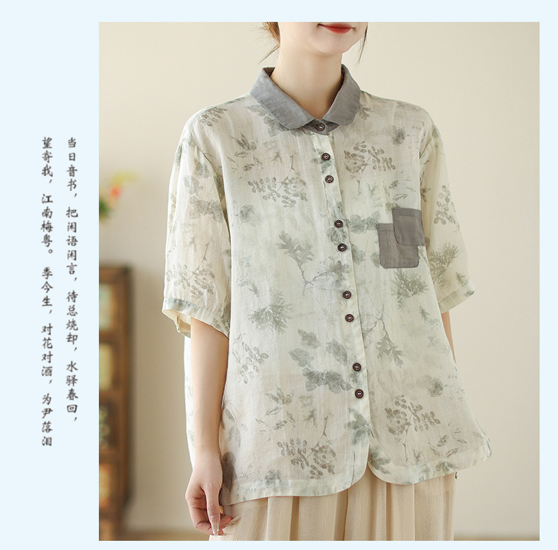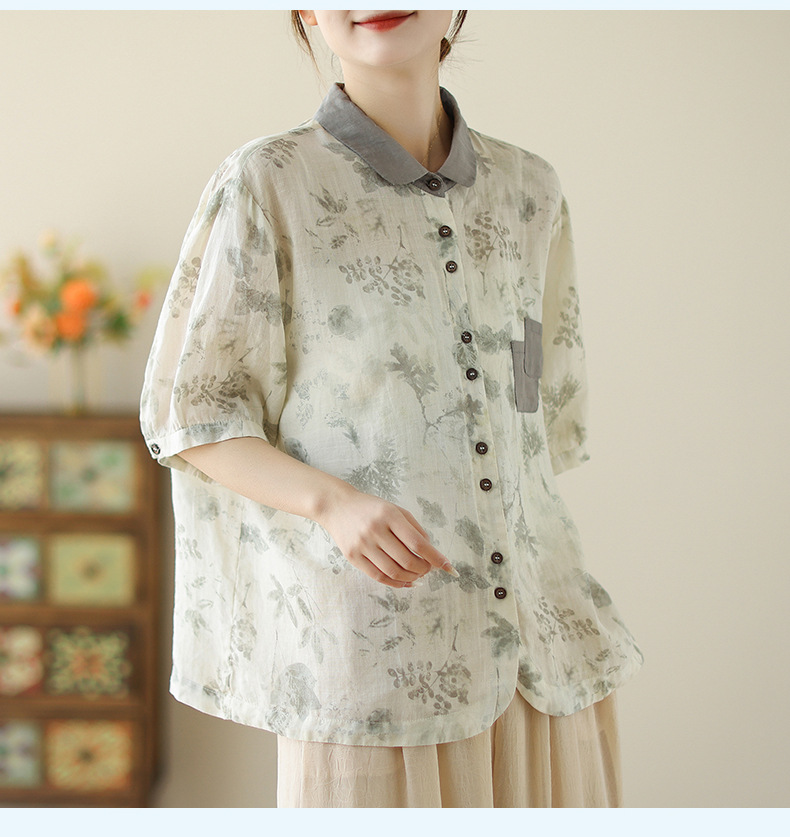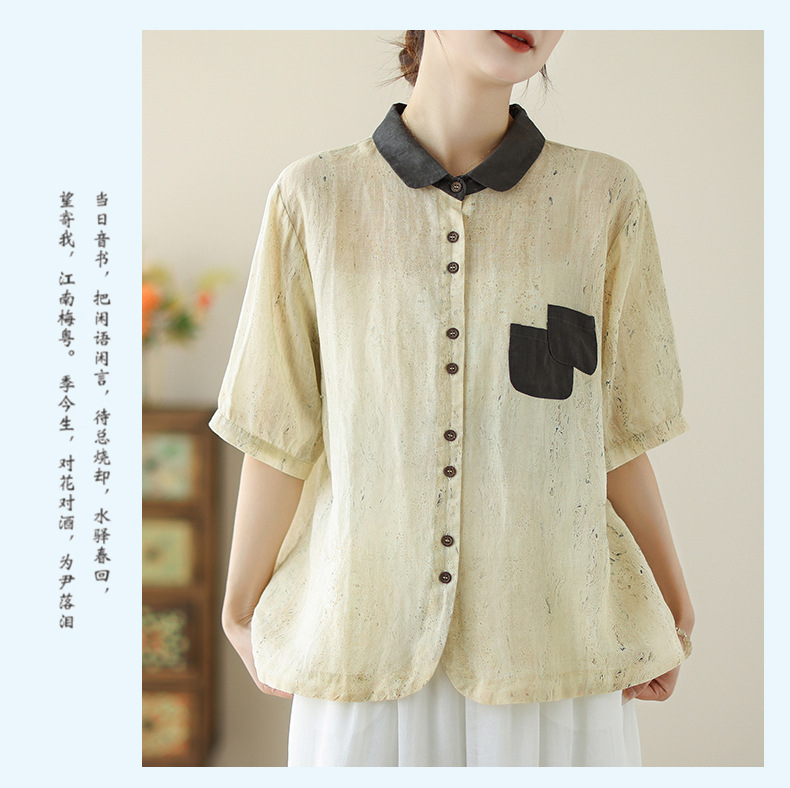 文艺印花棉麻衬衫上衣,翻领贴布口袋短袖衬衣LJX-D035-9097